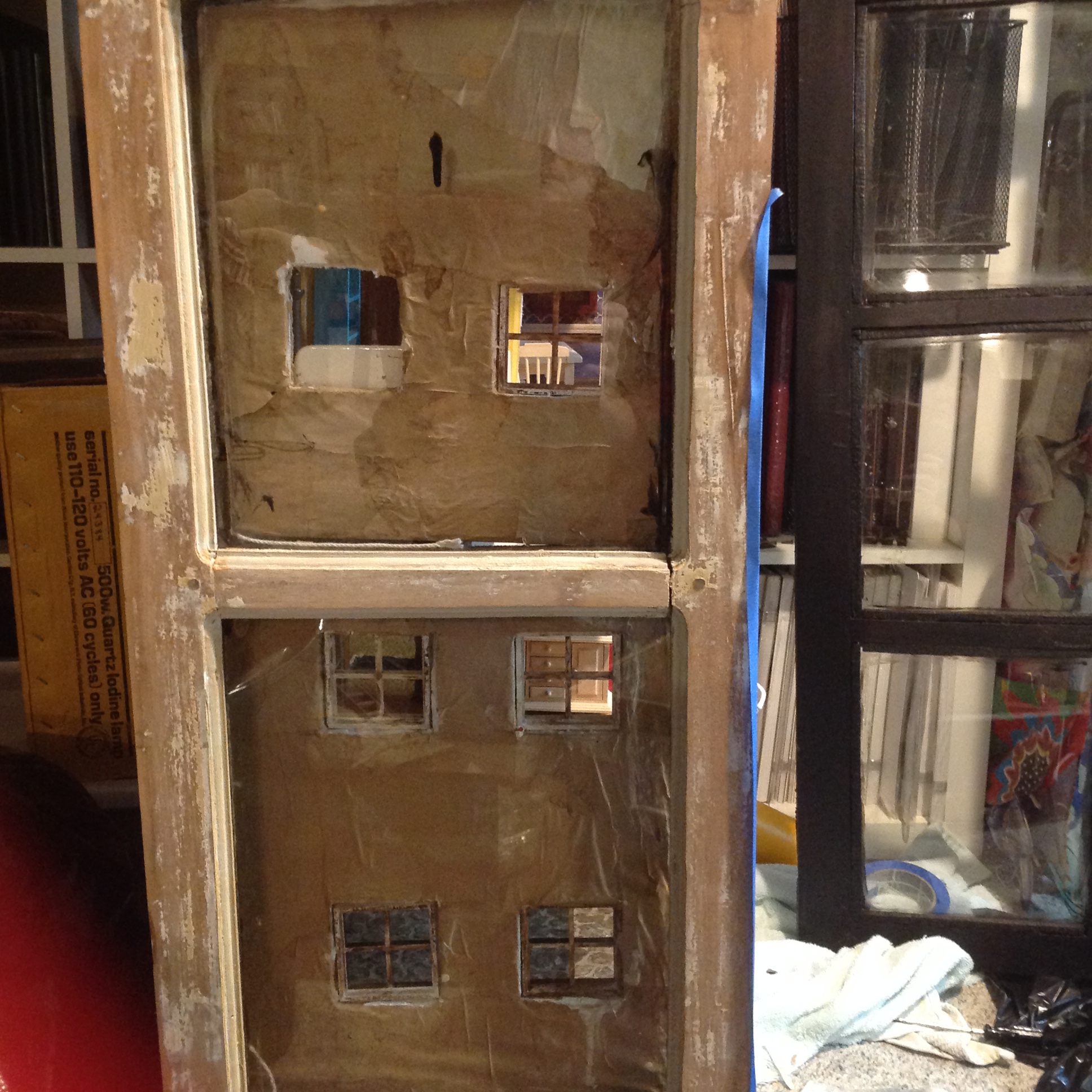 Looking through the cabinet window at the Exterior of the Mouse House windows.
