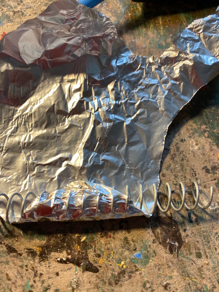 I forgot to photograph my vacuum hose making process, but it was very similar to how I made the exhaust pipe on the water heater. I made a spring out of curled wire then wrapped black duct tape around it. I’m not super happy with how it looks, but until I find some black foil-like material, this will do. I inserted this tube into the cardboard using a brad from my late mother-in-law’s sewing box.