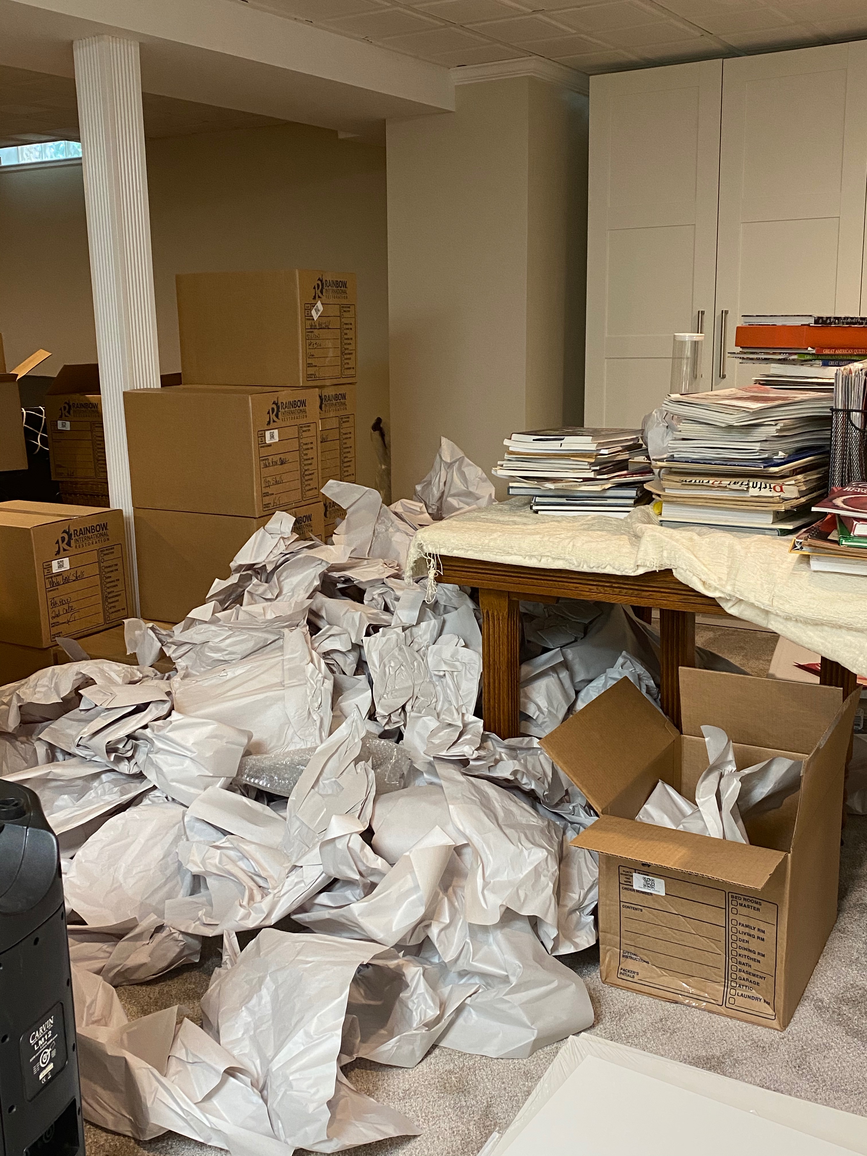 The year 2020 was a tough one for all. I had hoped to just hunker down in my studio and work on the Mouse House until the quarantine was over–you know, make lemonade from lemons. However, the cosmic forces had other plans and immediately after my last post, the pipe UNDER THE CEMENT FLOOR OF MY BASEMENT STUDIO burst, causing a flood which turned into a complete remodel of our basement. Everything (EVERYTHING!) had to be put into storage so the floor, wall, furniture, etc. could be replaced.