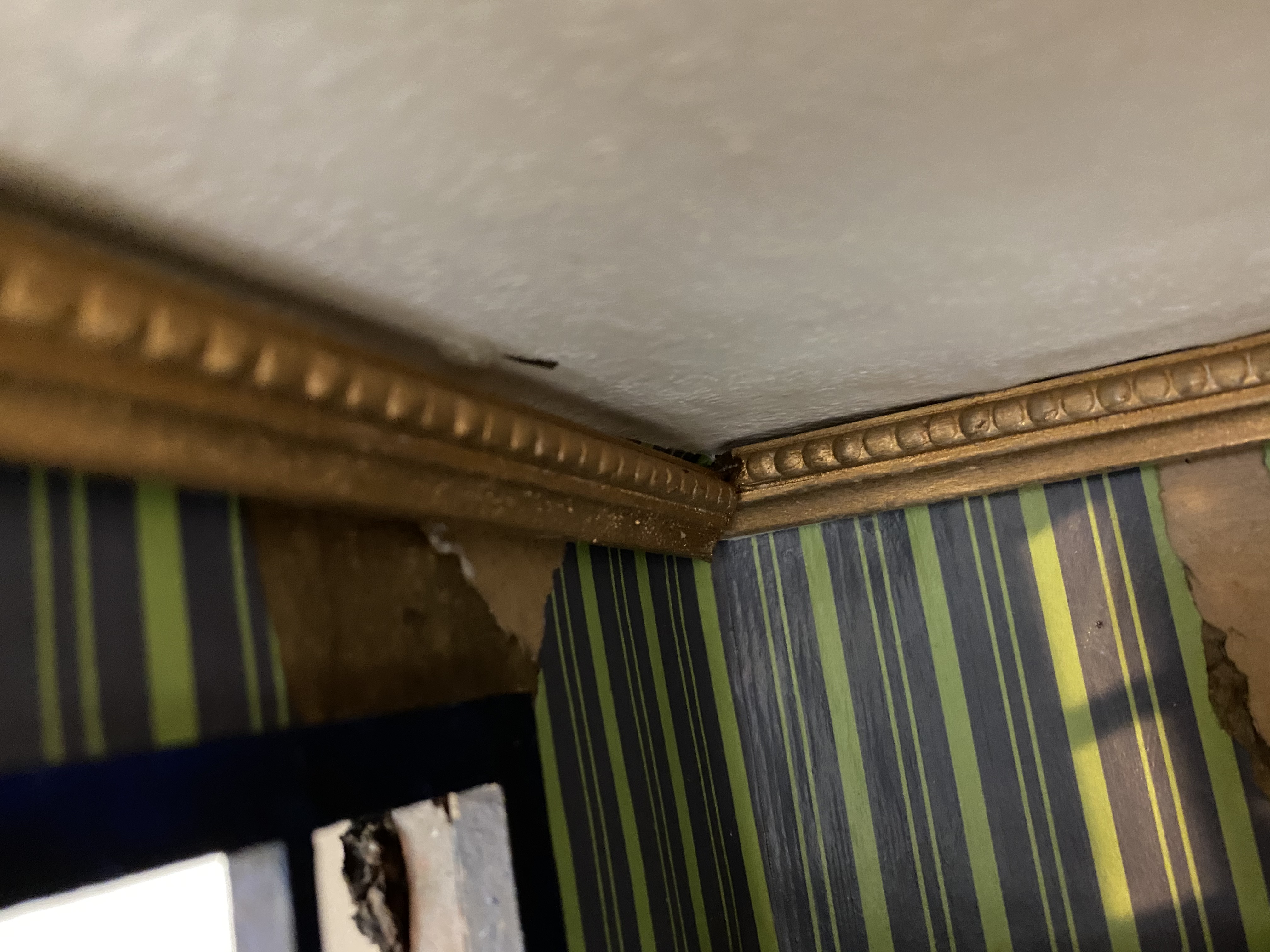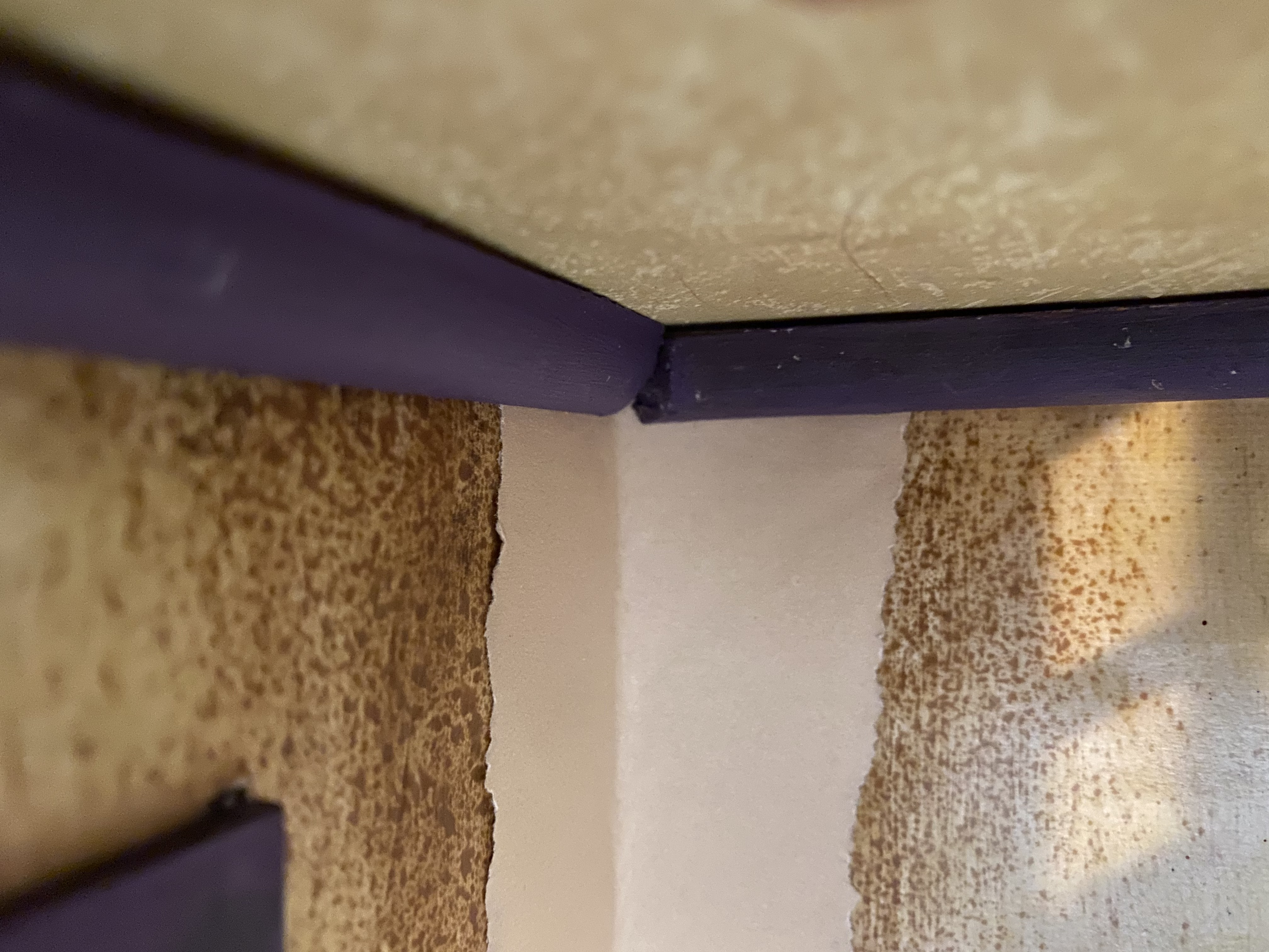 Last week I focused on finishing trim: the baseboards, chair rails and moulding against the ceiling. I used my little miter box and saw and did a pretty good job, but I forgot that carefully cut trim only fits in square corners–angles which are not “true” in the Mouse House. I reminded myself that precision isn’t necessarily my goal and did the best I could, deciding that the corner gaps add charm.