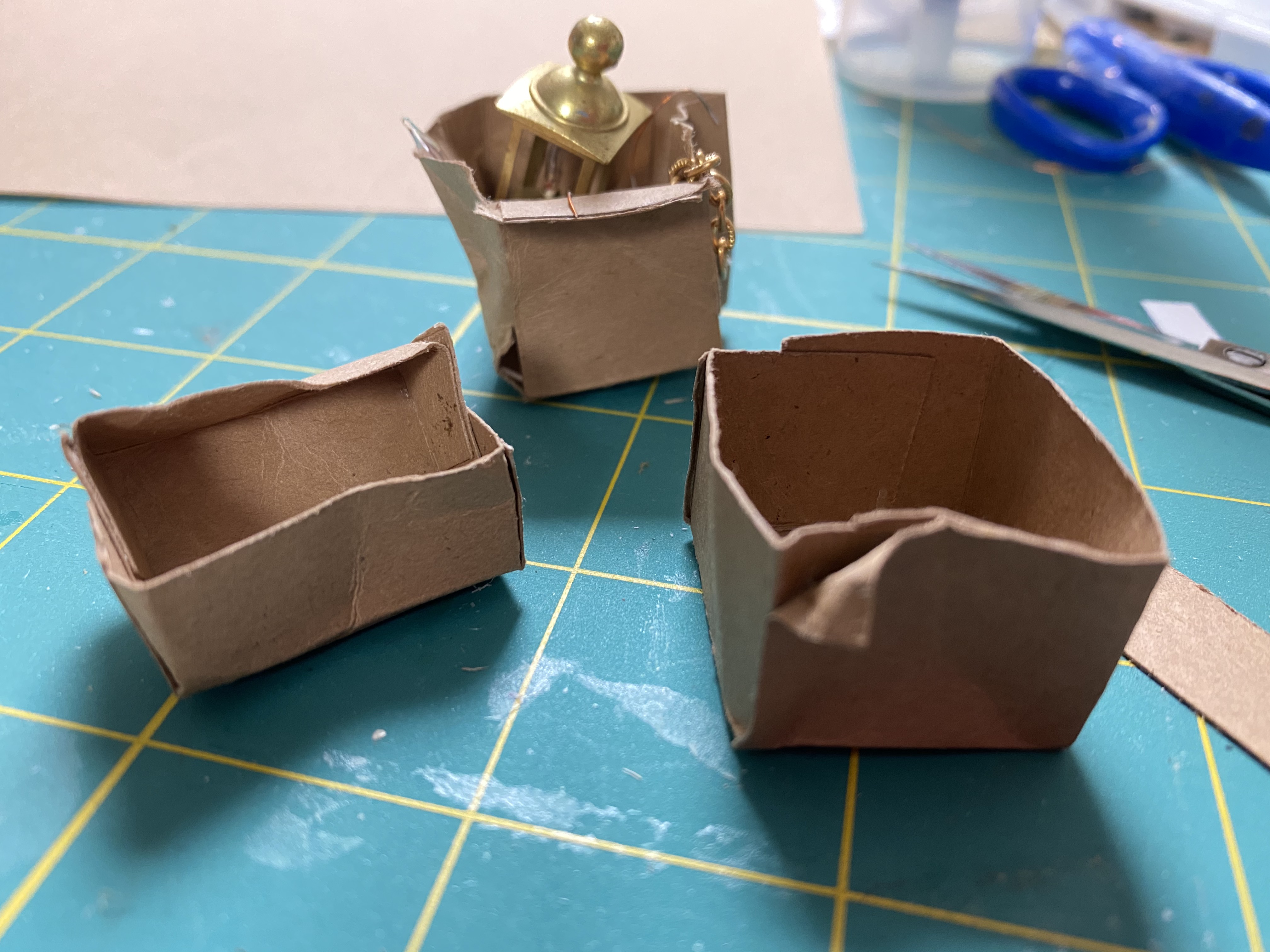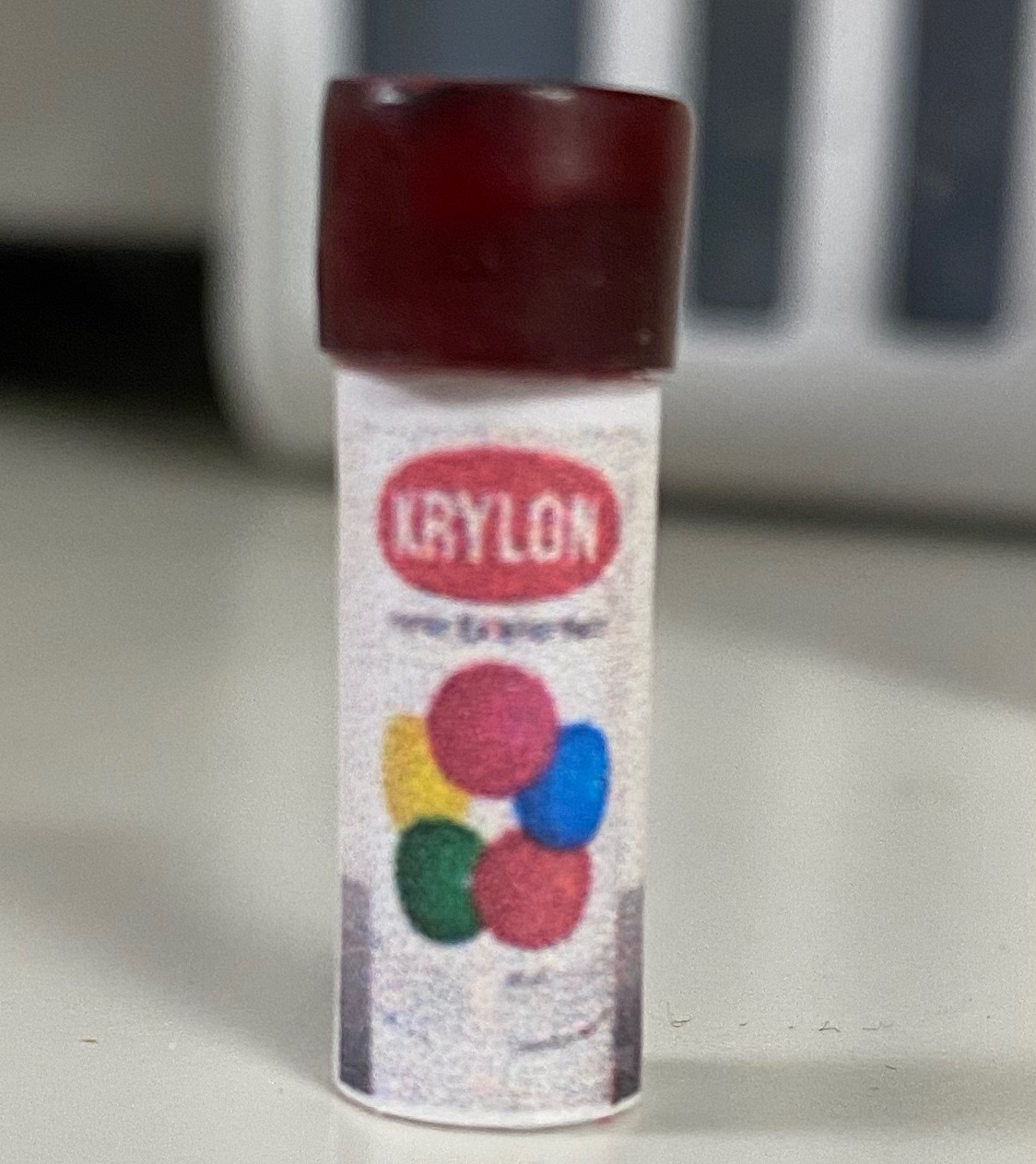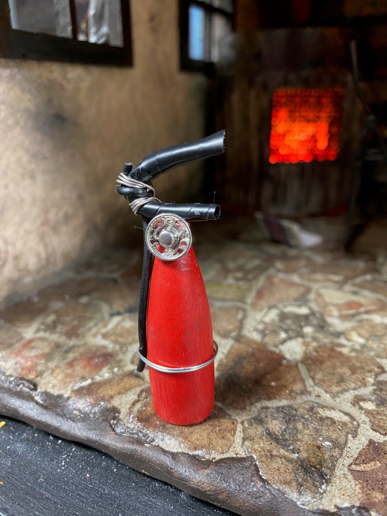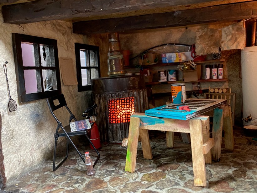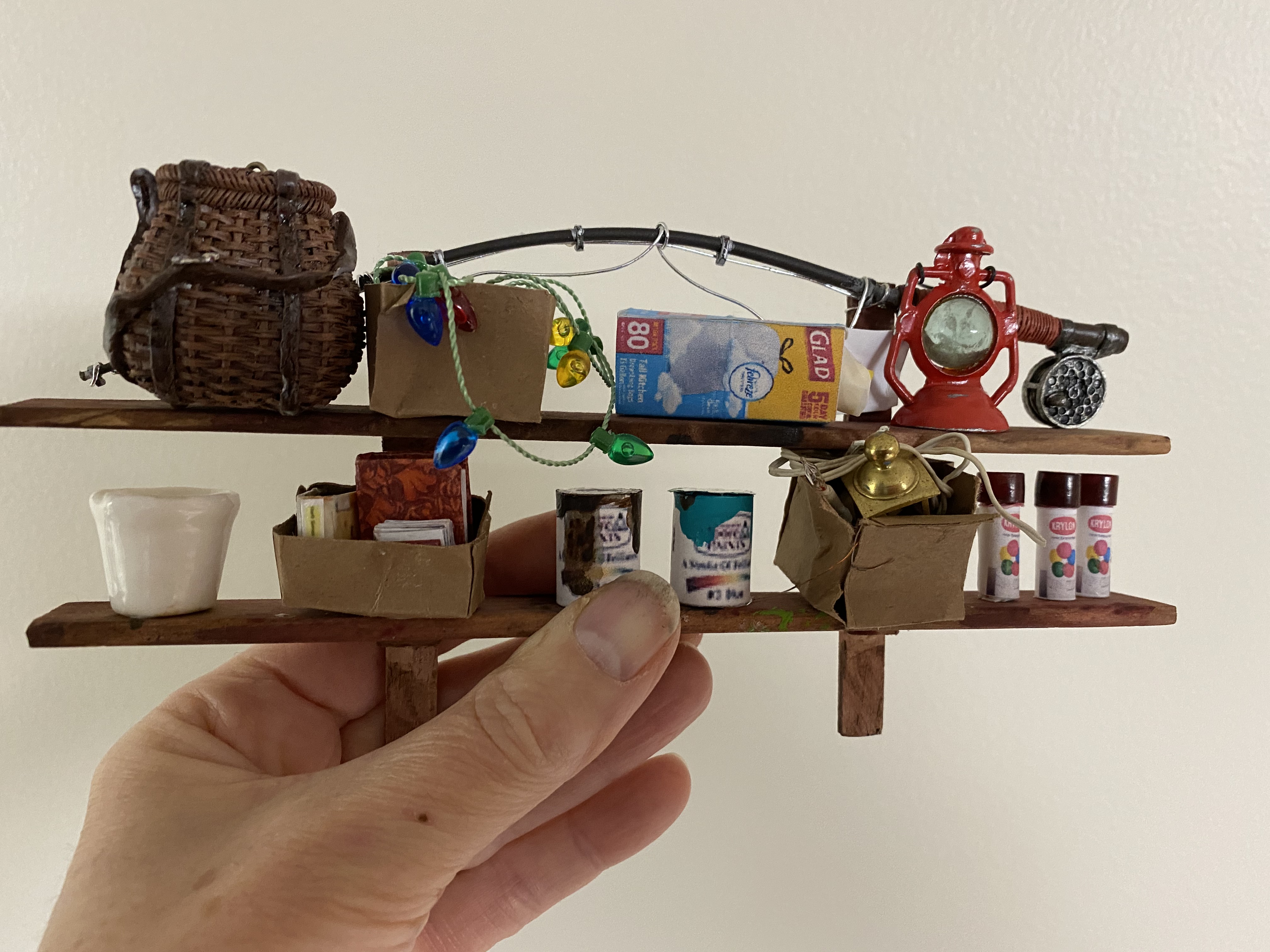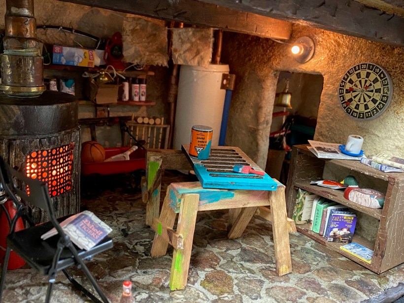 A crucial part of the room are the shelves I built to hang on the back wall. I’m discovering that the house looks best to me if they are full of stuff, so I gathered lots of things to put on the shelves including more paint cans like those I made for the workshop as well as new spray paint cans I created with labels from the internet and beads. The boxes were made from scrap paper and filled with extra miniatures I have laying around but won’t use otherwise.
