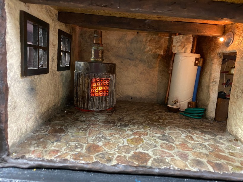 As I previously posted, I completed the Mouse House basement workshop last week. Over the weekend, I finished the other two “rooms” on the first level –the furnace room and the “entrance” to the house.