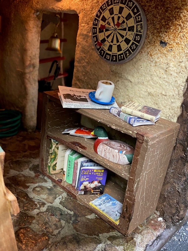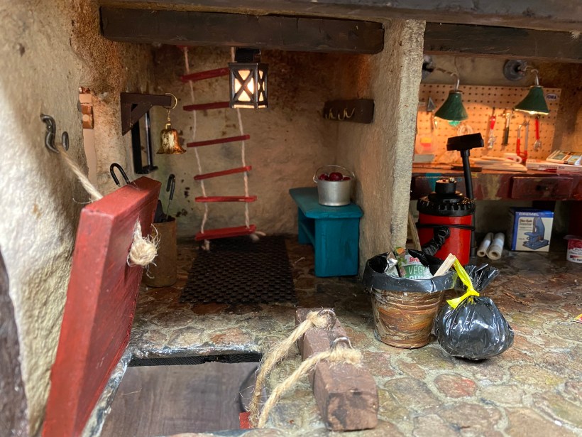 The entry to the Mouse House is between the workshop and furnace room. There’s a trap door that can close and a ladder that can be extended down to the floor so the “mice” can get inside. At the rear of the entry is another rope ladder that extends all way to the attic of the house. I also added a bench, coat rack, bell to ring upon arrival, mirror (made out of a make-up compact), umbrella stand and, of course, the garbage which is waiting to be taken out.