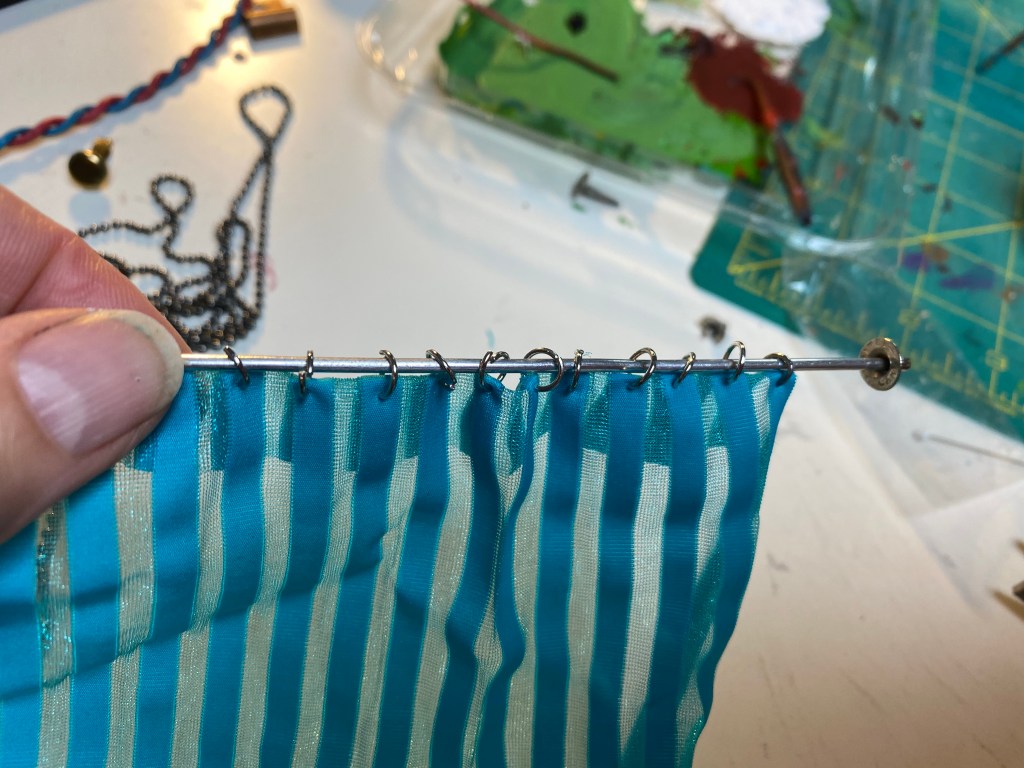 I made the shower curtain with wire, jewelry rings and a piece of fabric from my stash.