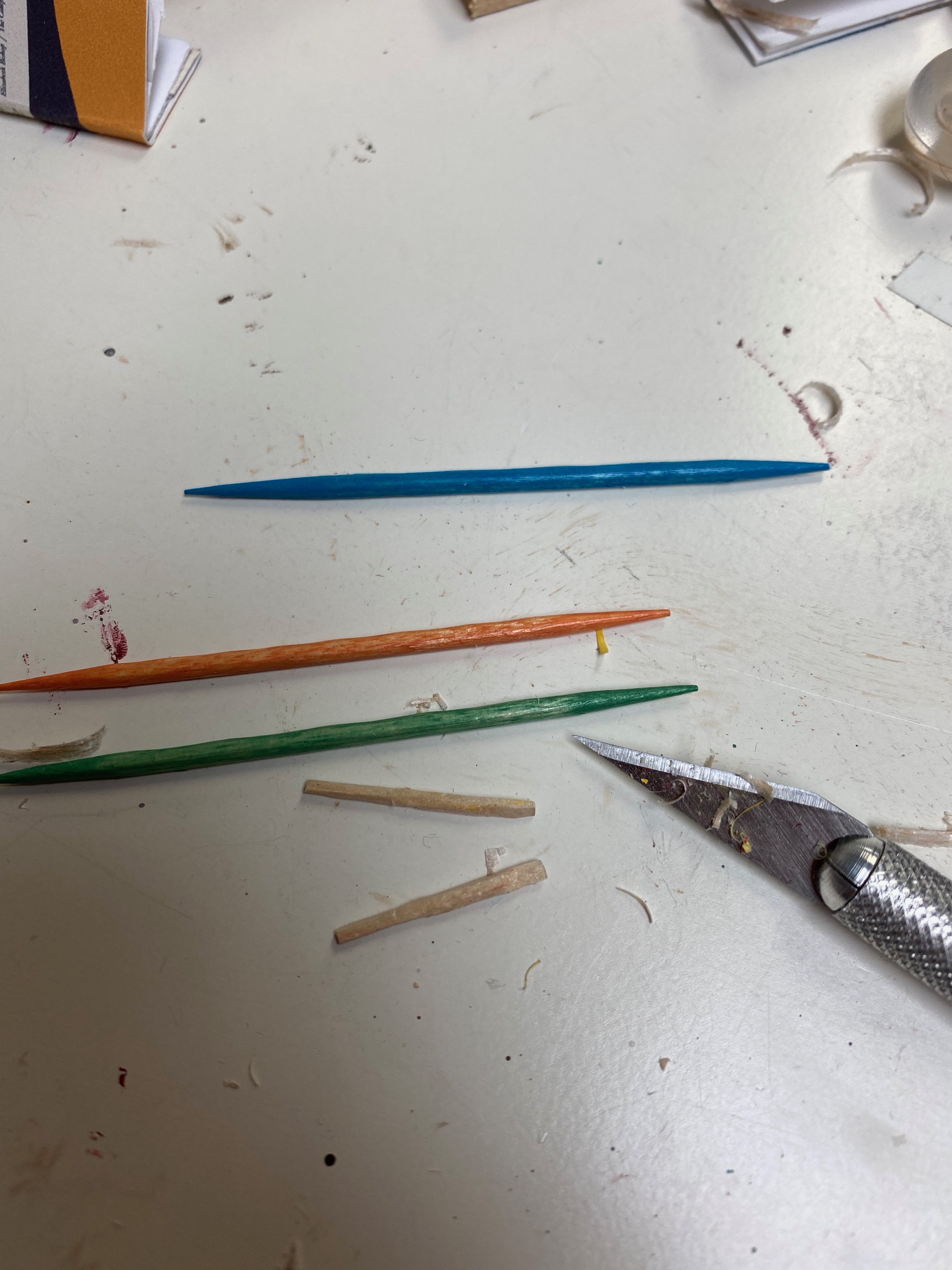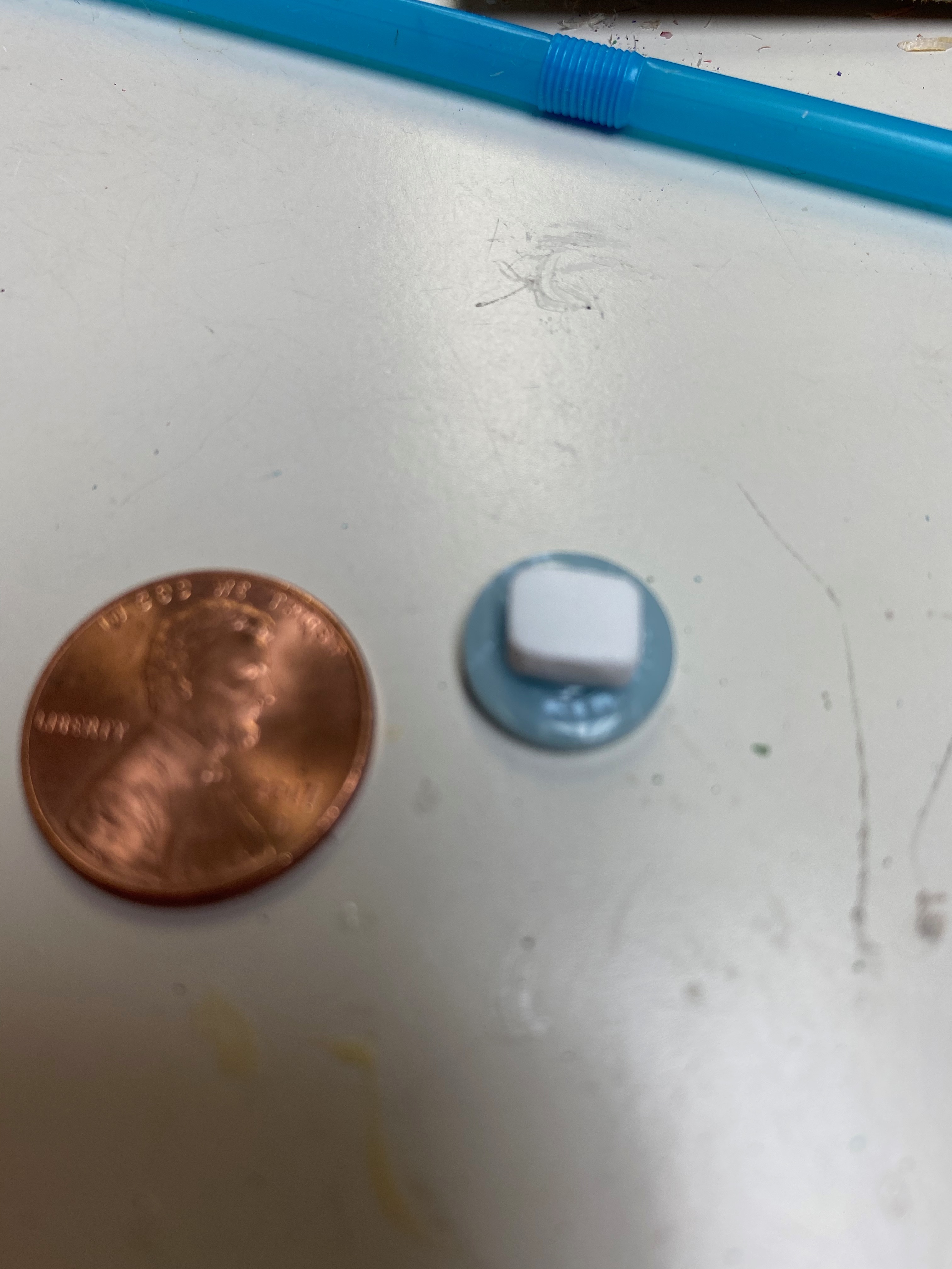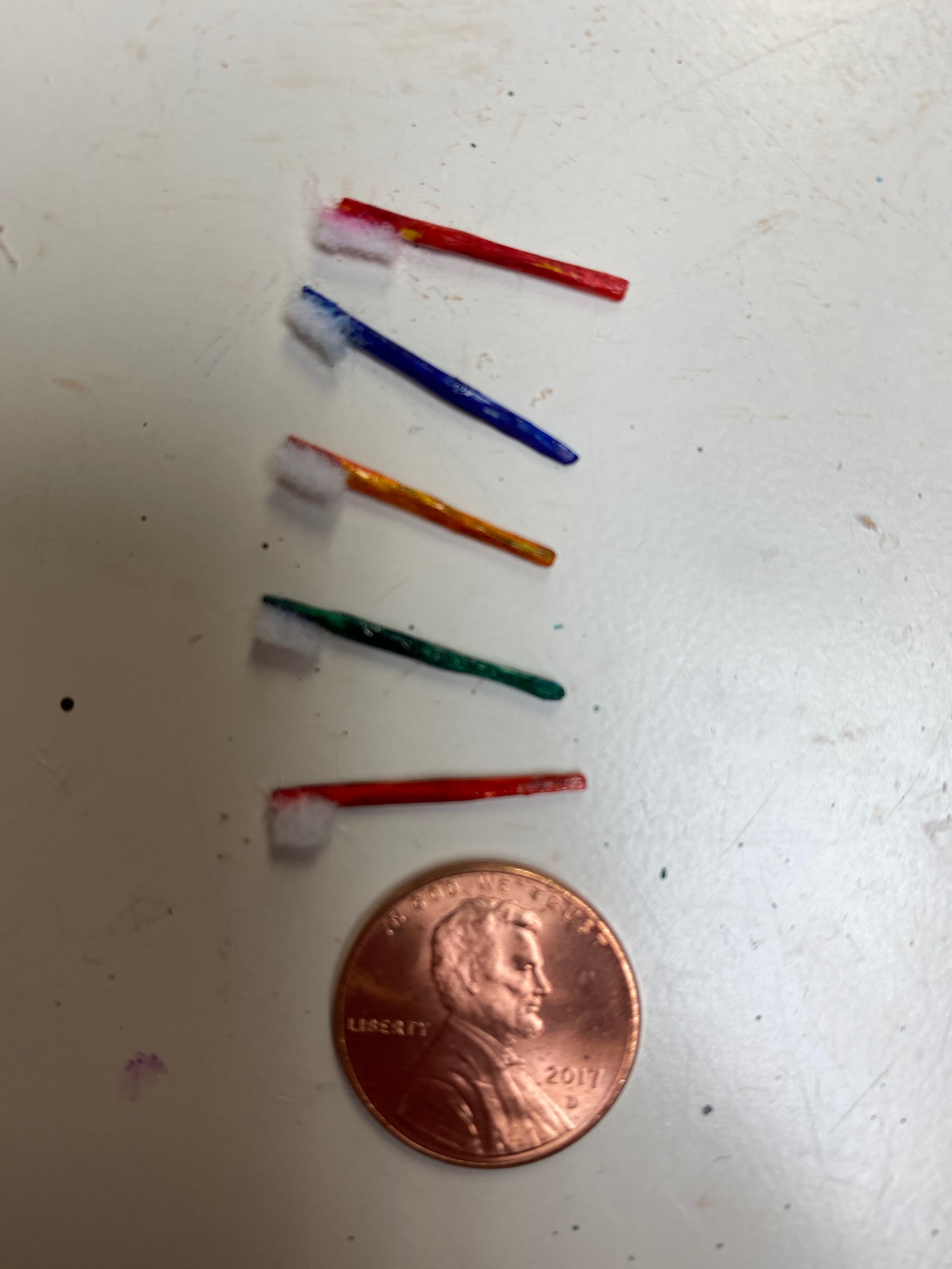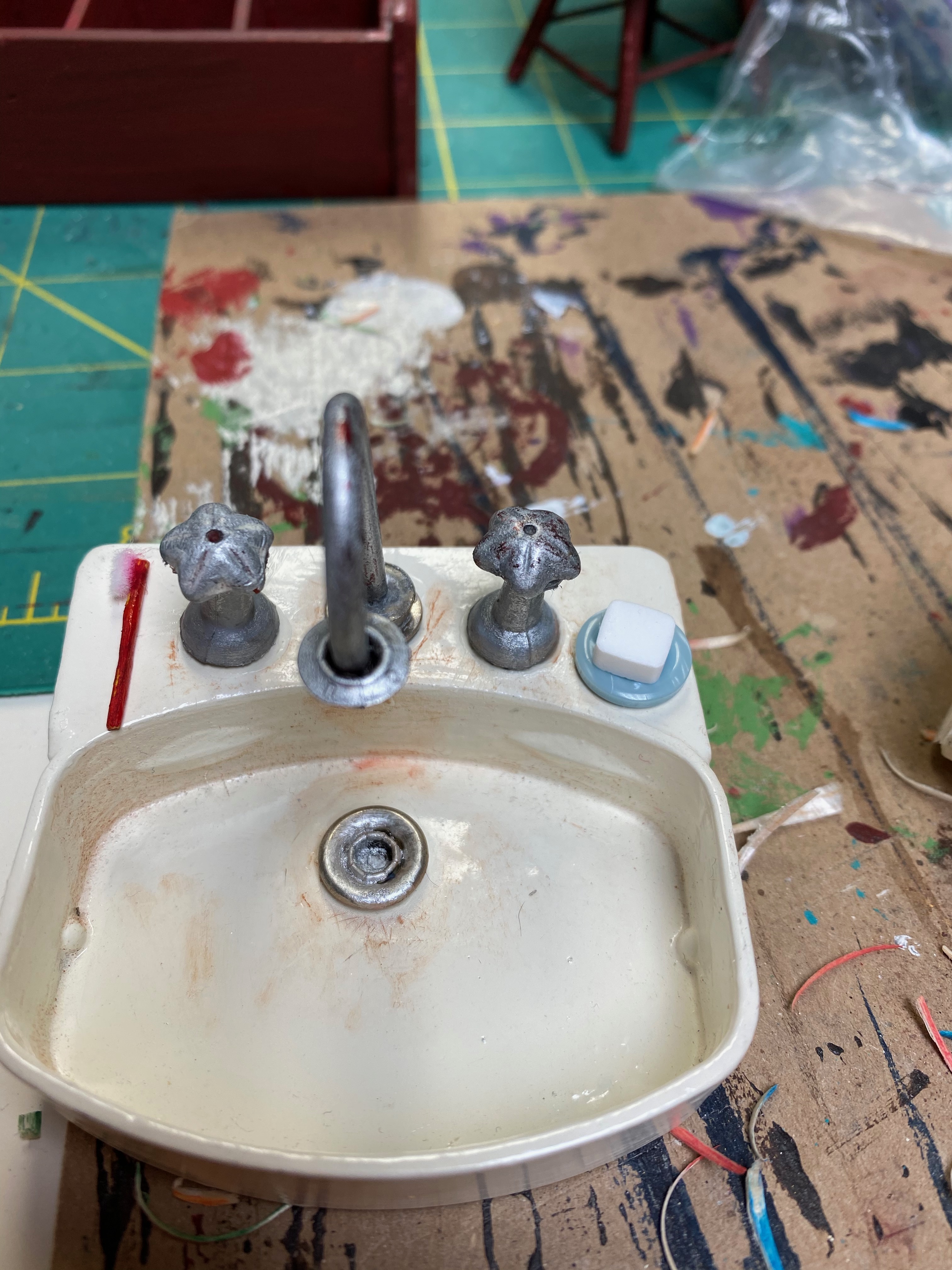 The sink was made with half of a travel toothbrush holder as the base topped with a lid from a vaseline container for the sink. The knobs are pushpins topped with beads and the faucet is a wire and sewing rivets. I carved the toothbrush from a toothpick, and made the soap dish out of a button and sanded an Altoid into a rectangle for the soap.