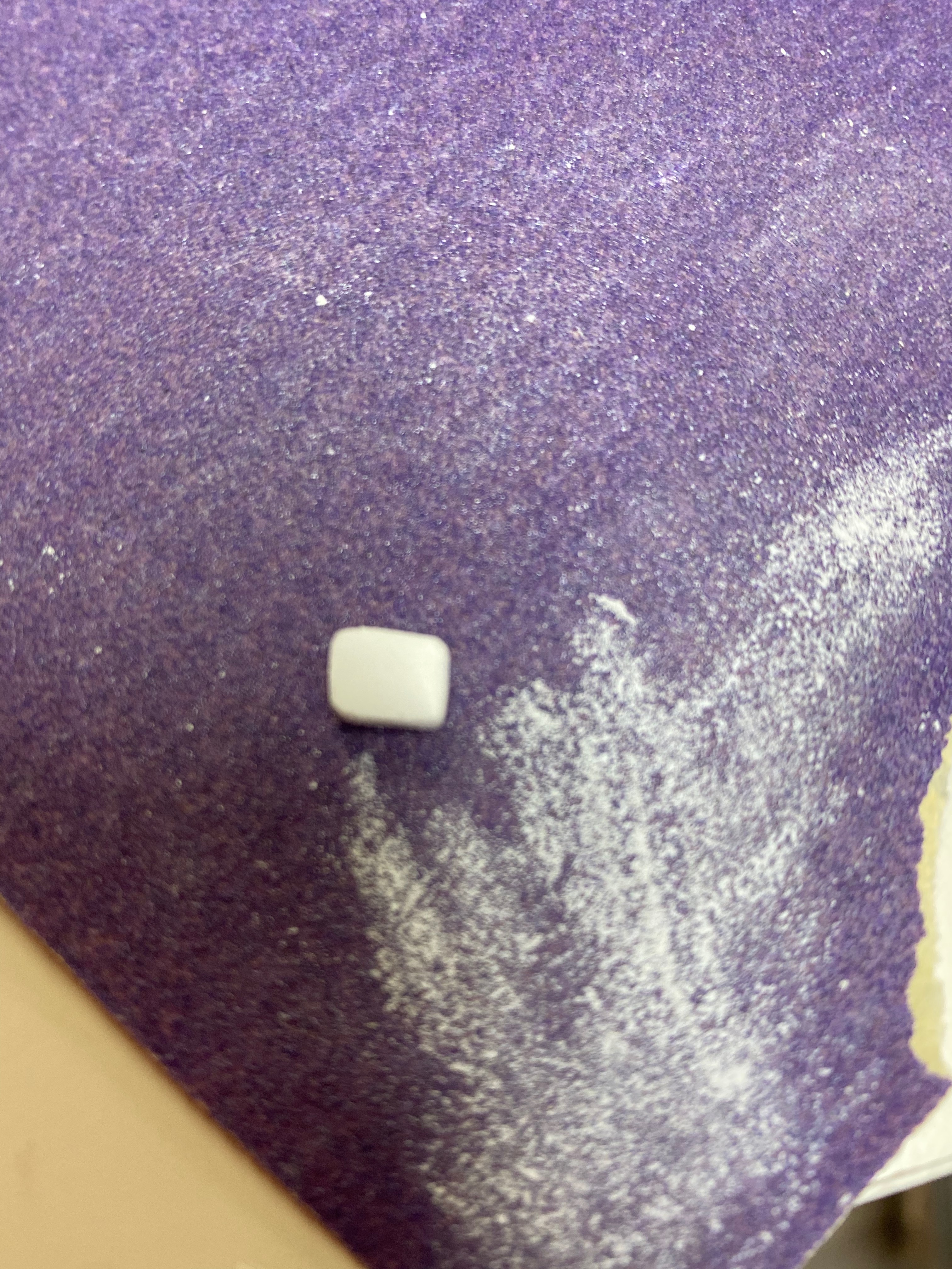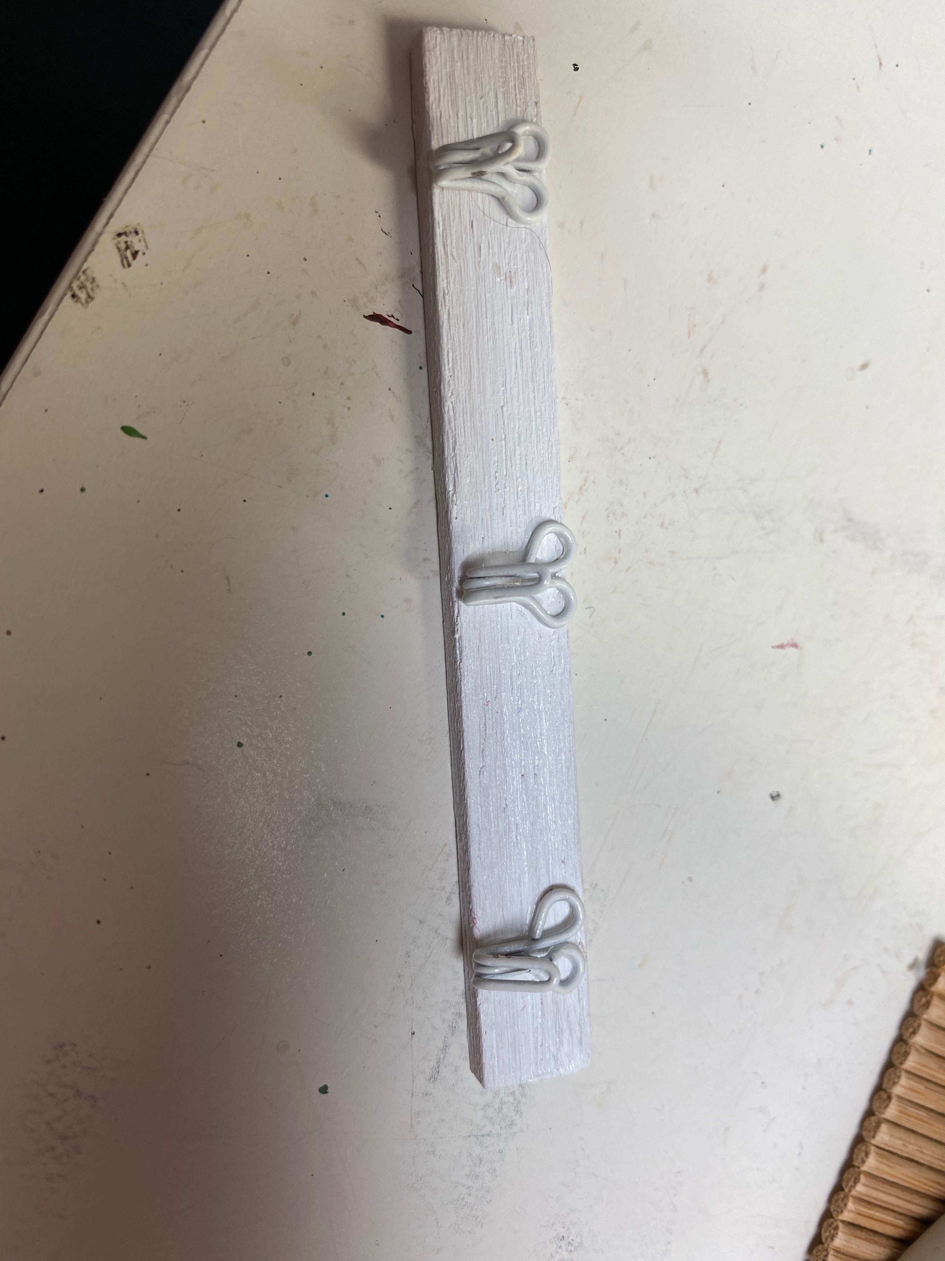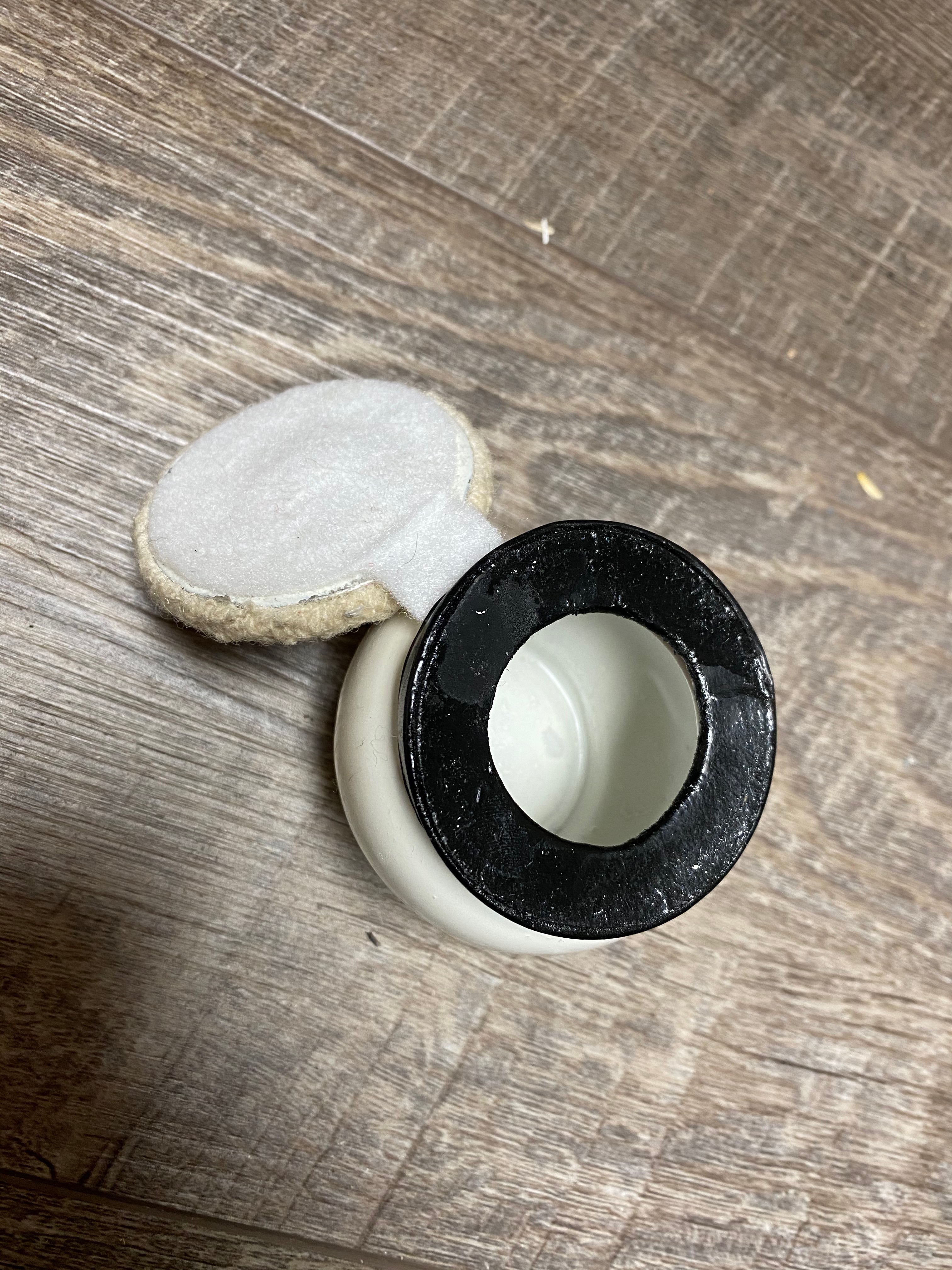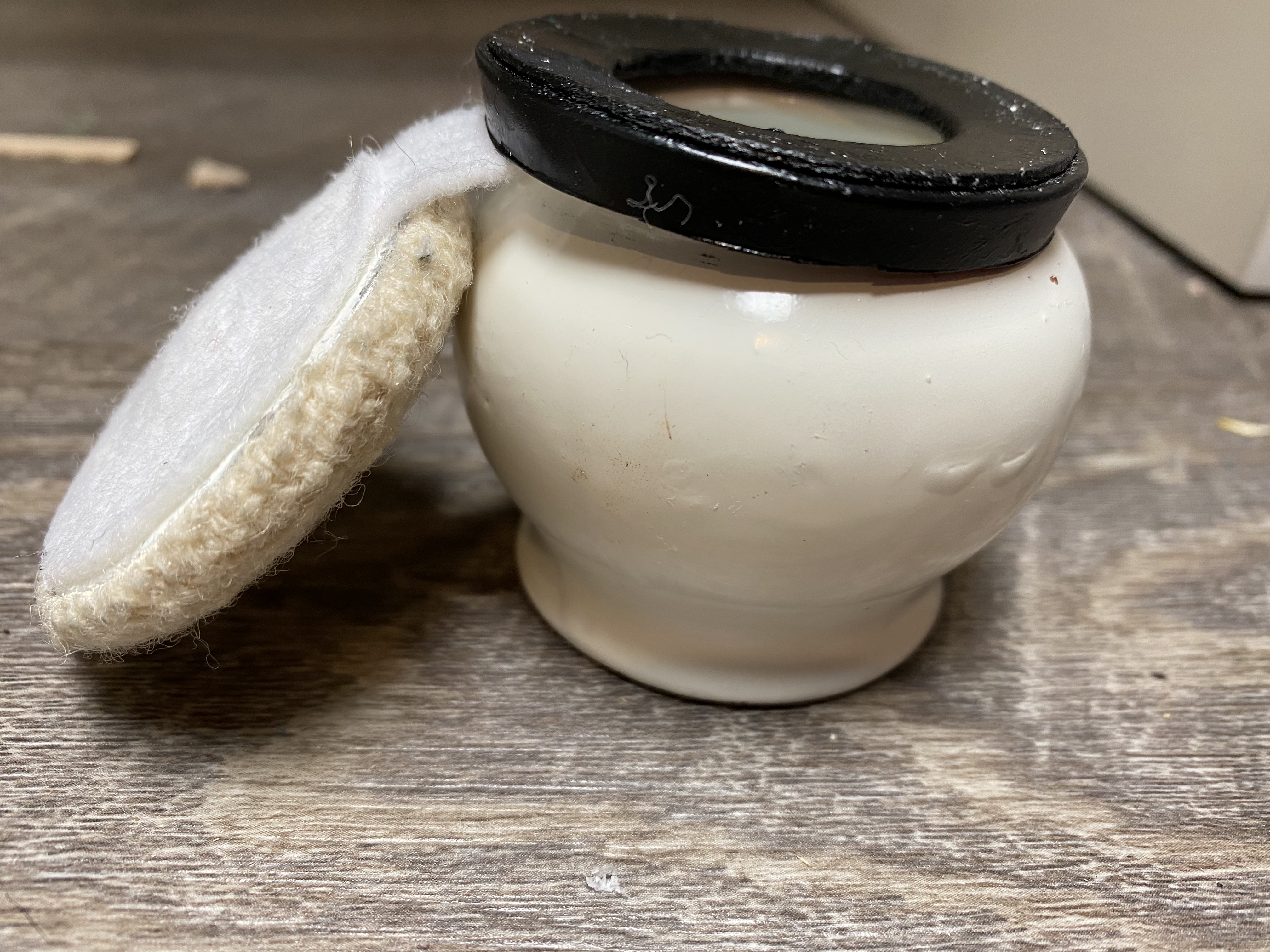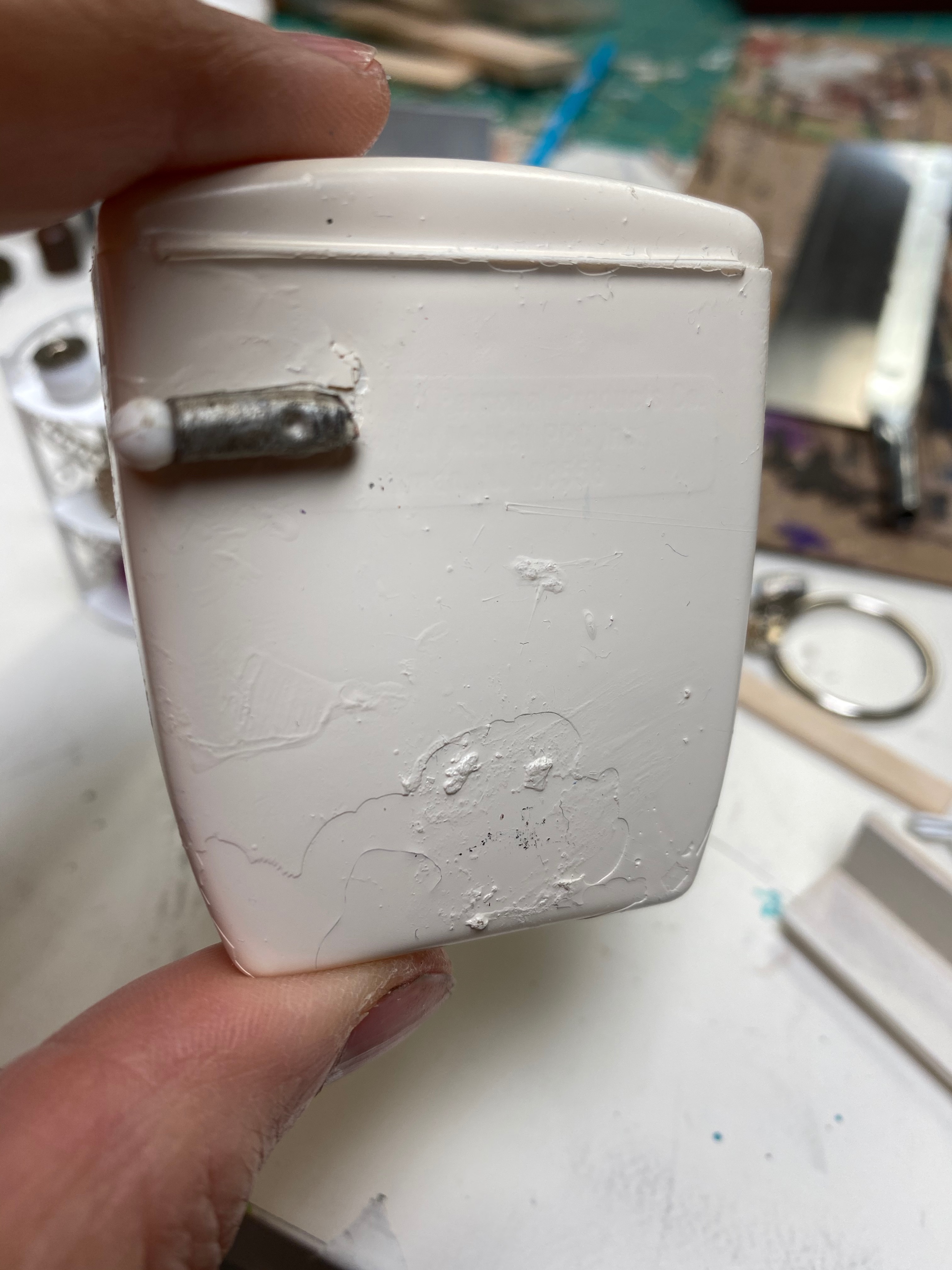 The toilet was made with a small ceramic pot I found at the Salvation Army, topped with a black plastic lid from something in my workshop. I found the perfect button for the lid from a stash I inherited from my mother in-law. The toilet tank is actually a floss container I painted to match. I added a bead threaded with a white headed pin for the handle.