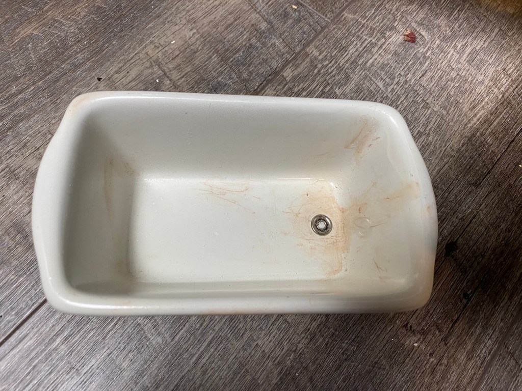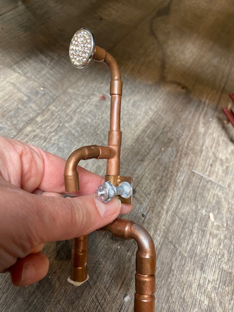 The bathtub is simply a small, ceramic bread pan I spray painted white. The drain is a snap. I made the copper plumbing from scraps I found in Andy’s workshop, and added another pushpin, bead and snap for the water handle. The shower head was a button I found at an Estate Sale. It was in a bag with lots of other buttons that I didn’t want, and the seller kindly gave me this one.