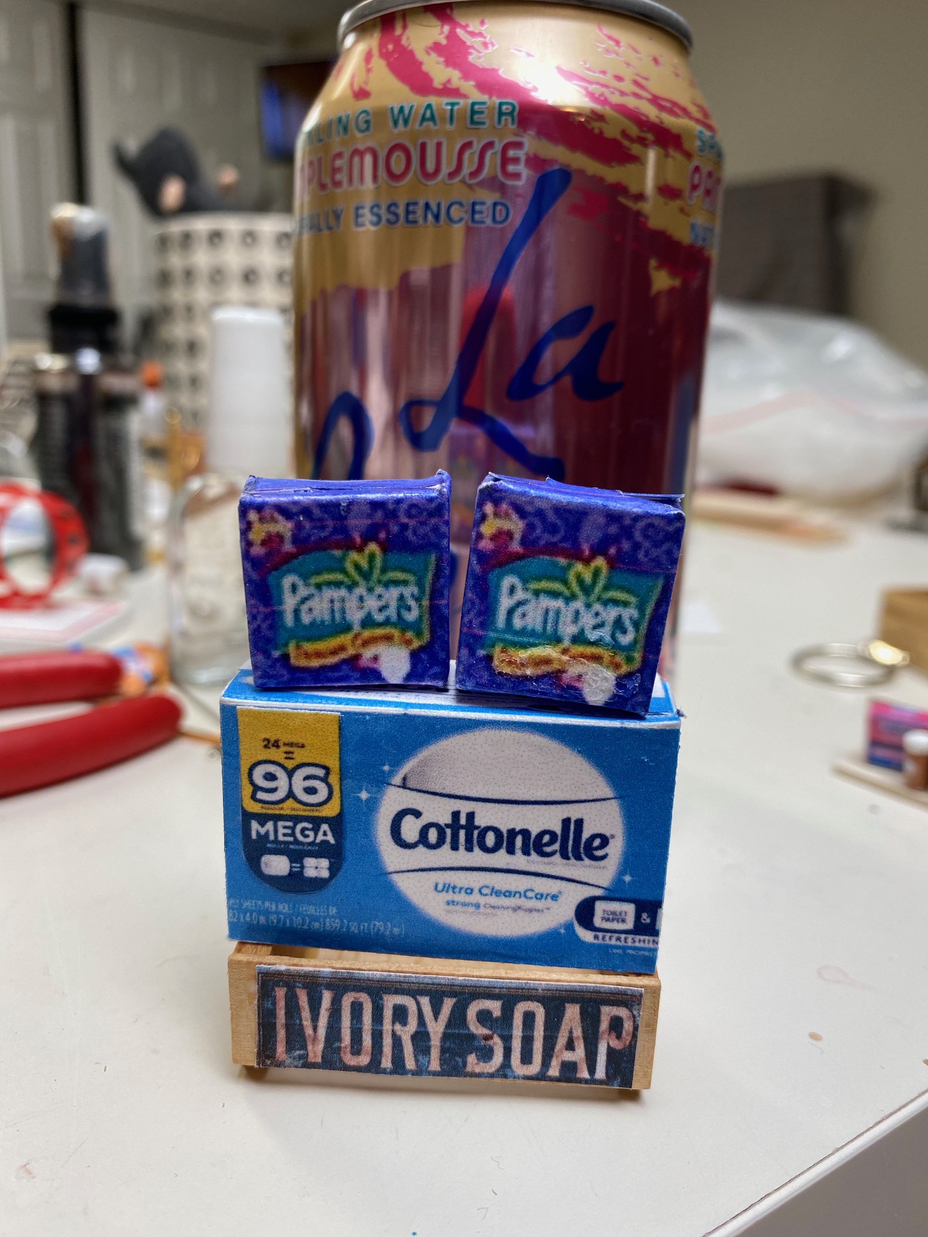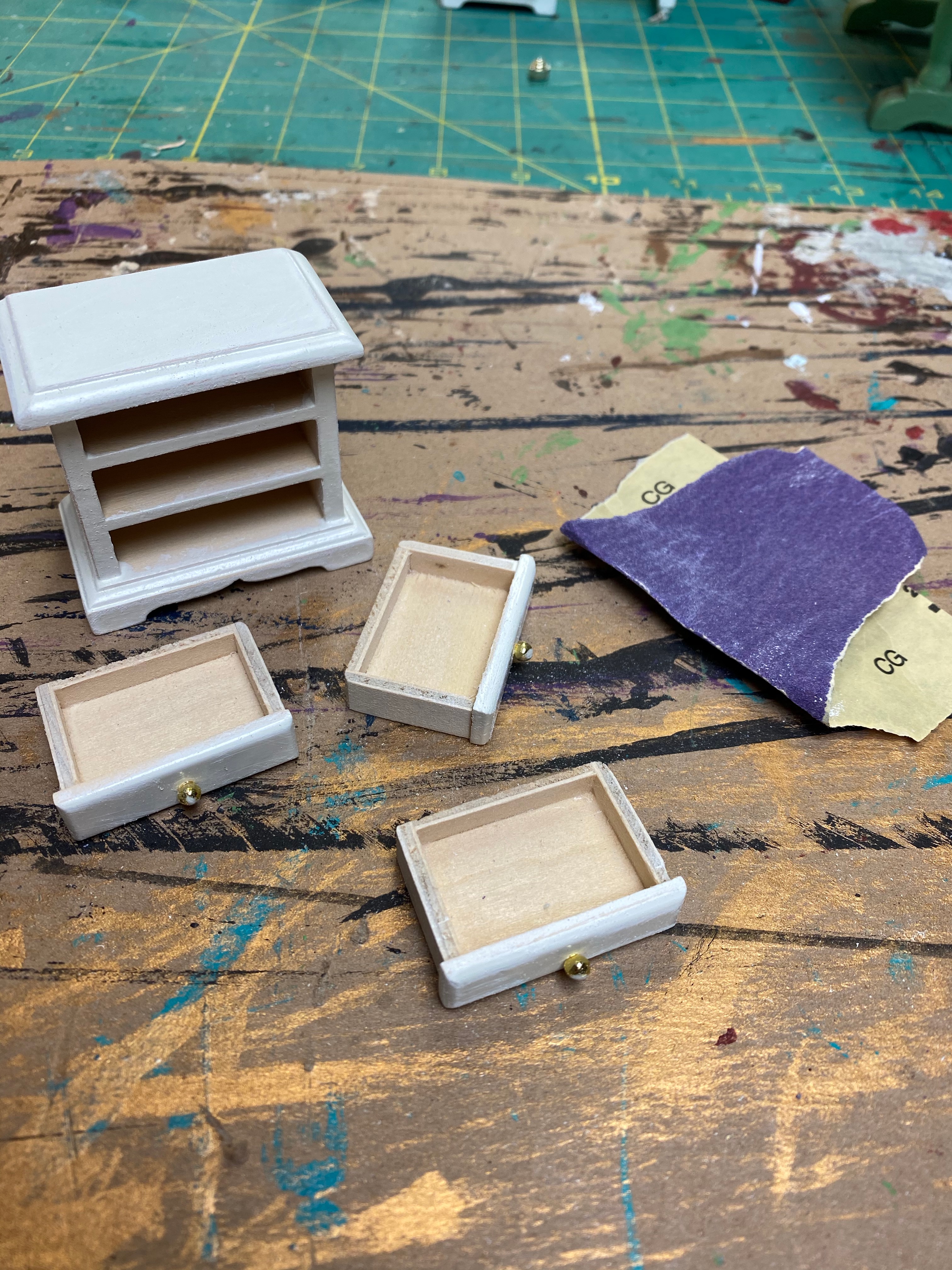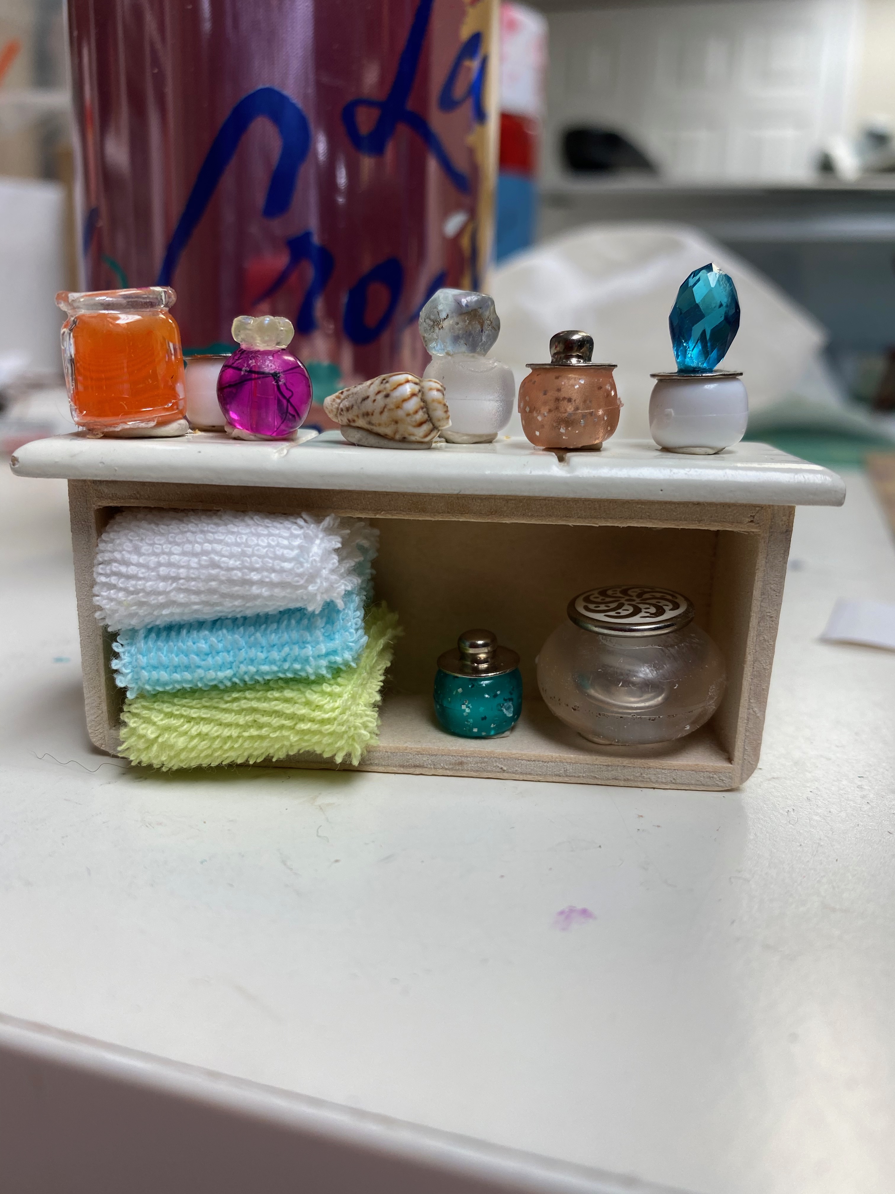 Other items in the bathroom include a shelving unit made with a miniature dresser drawer. I topped this shelf with “perfume” bottles made with beads and snaps. I also constructed simple towel hooks from sewing supplies, and a pile of paper goods from images printed from the internet.