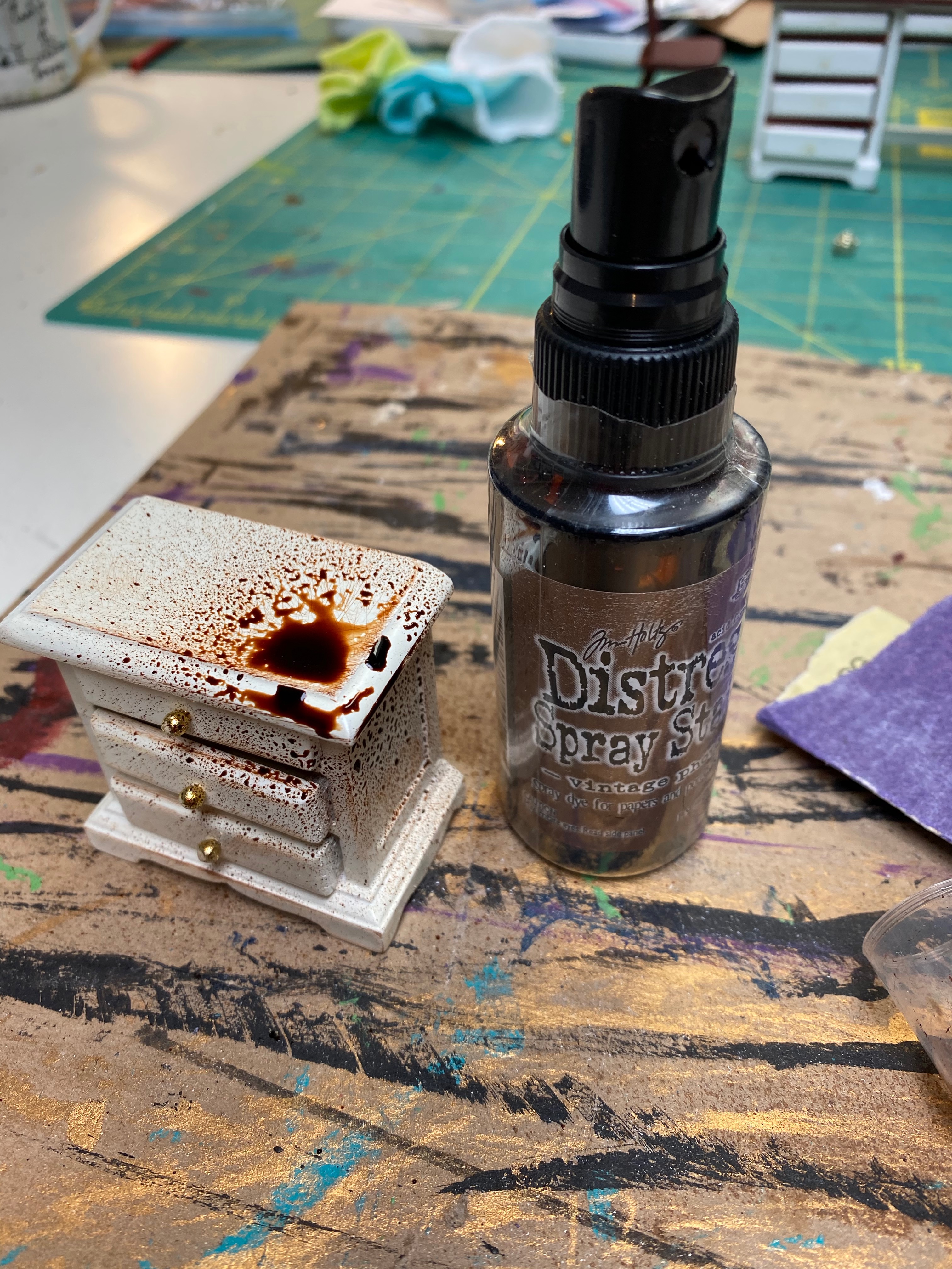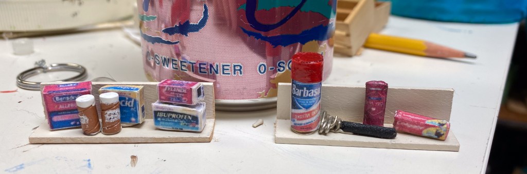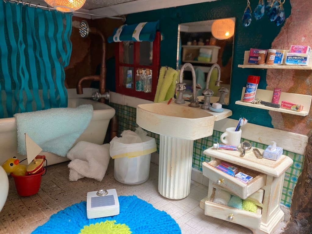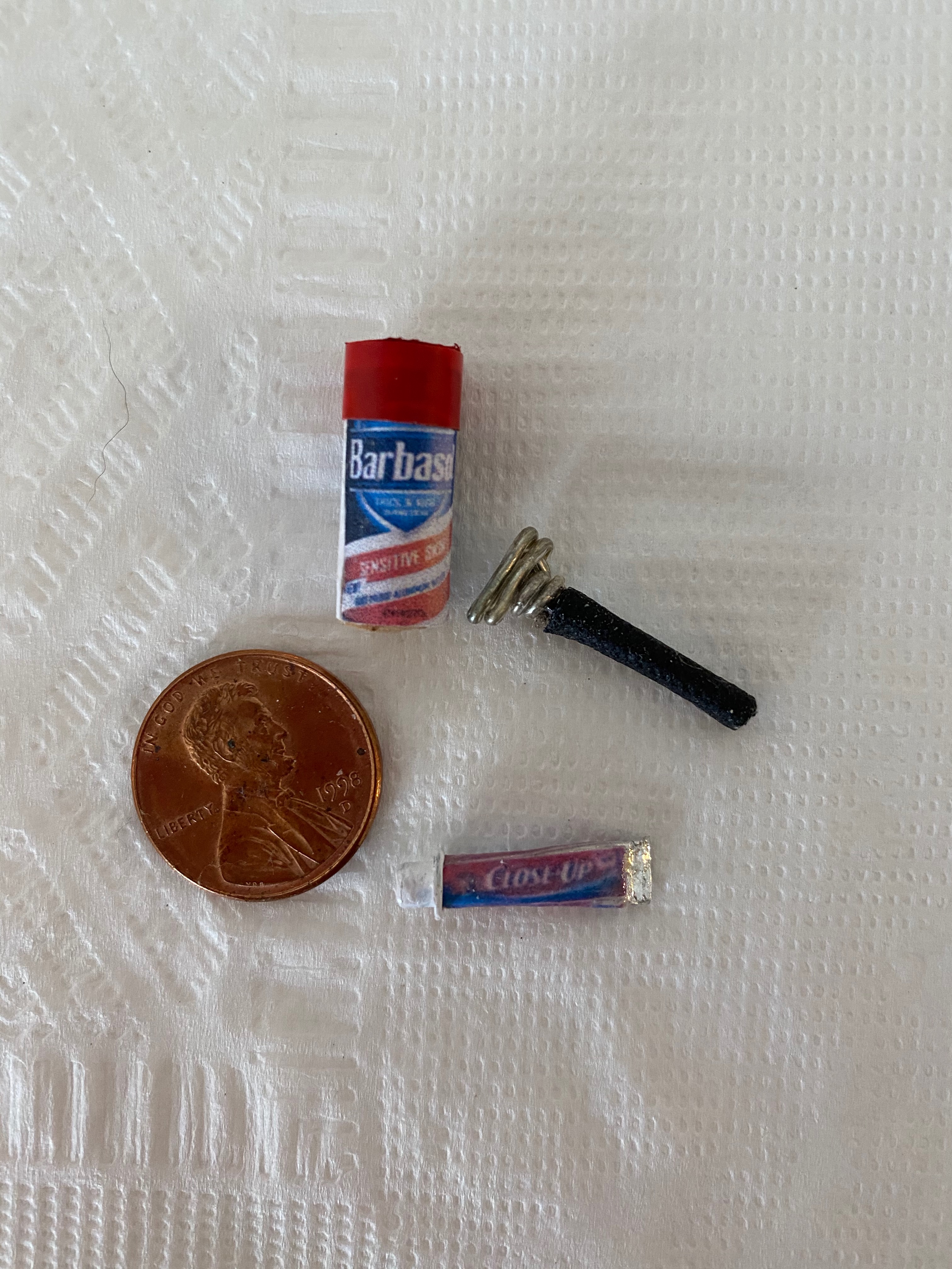 The storage dresser is from a garage sale: I roughed it up a bit and then added some stain to make it appear old. The items on it and the shelves above it were printed from the internet and then fashioned into boxes and bottles. I made the razor with wire, the toothpaste tube with foil and a rivet, and the toothbrushes from toothpicks and felt.