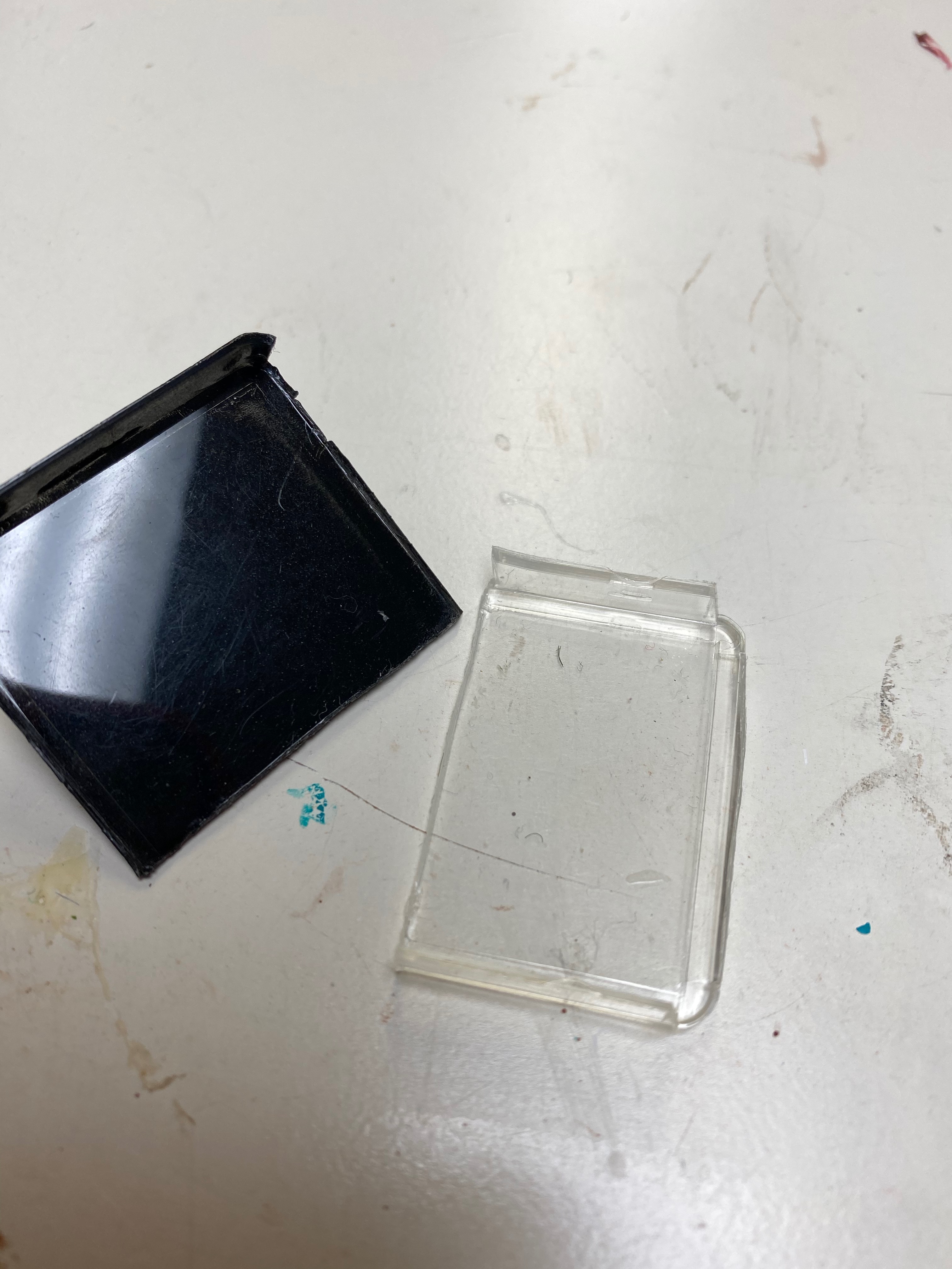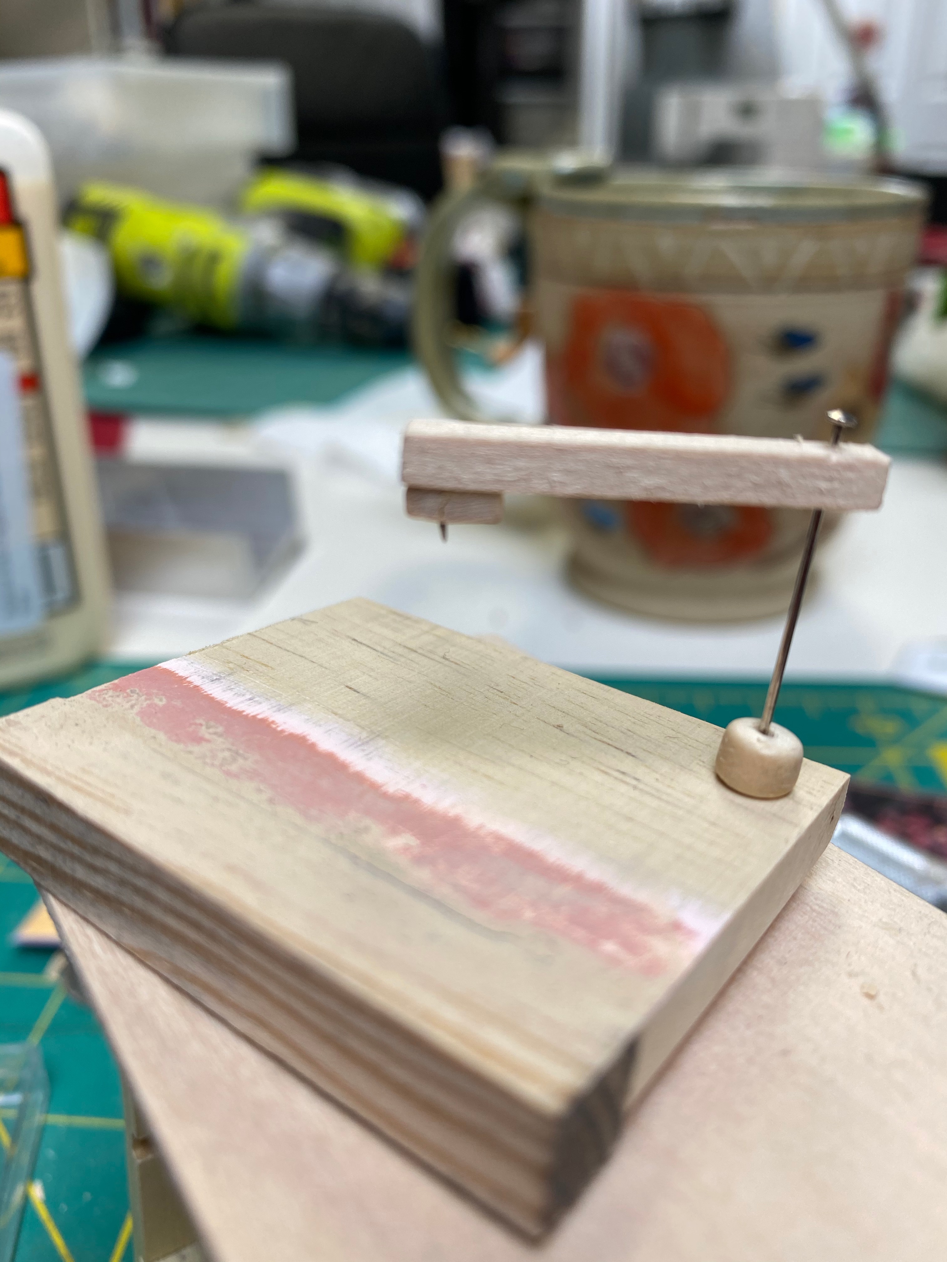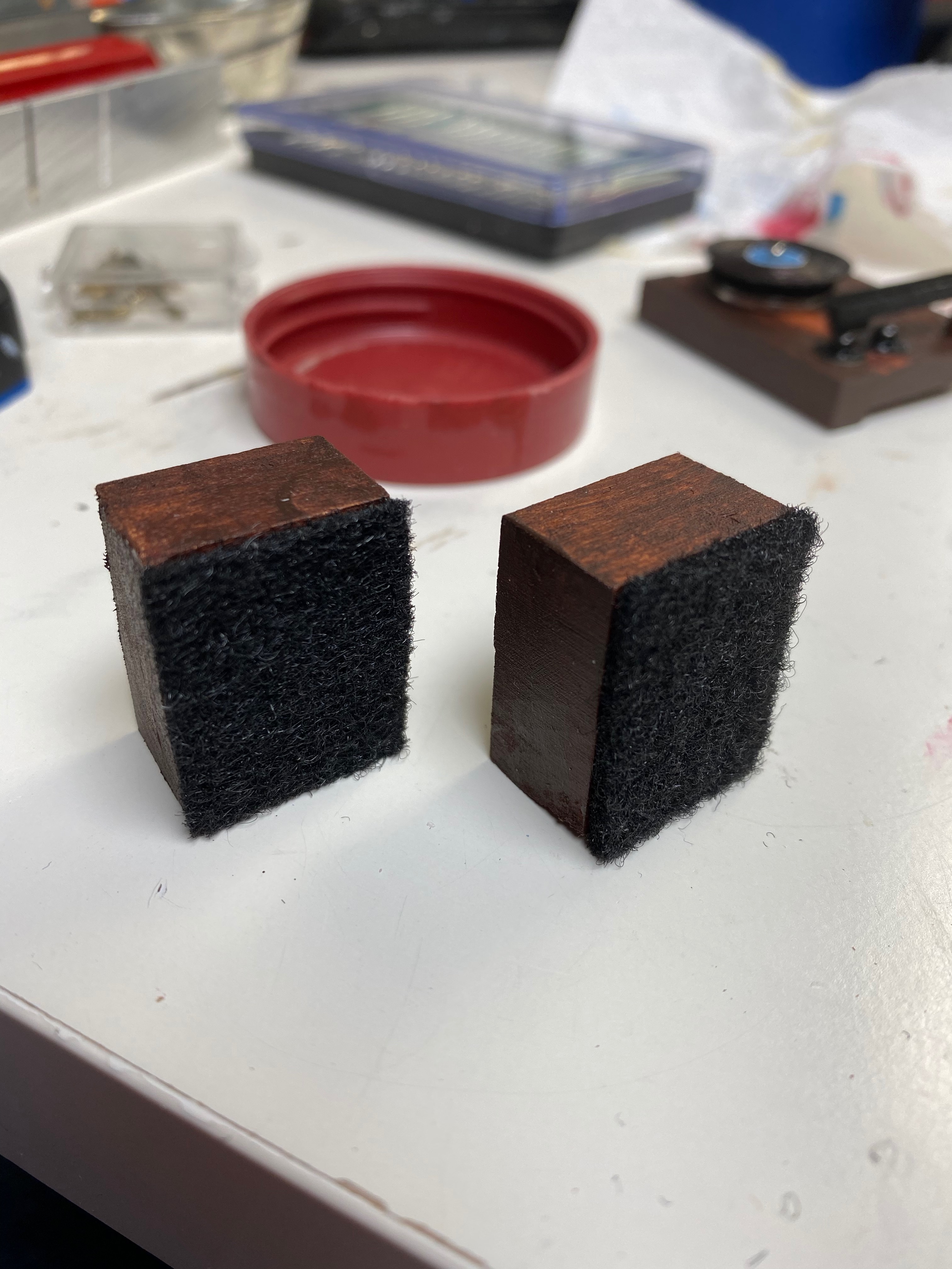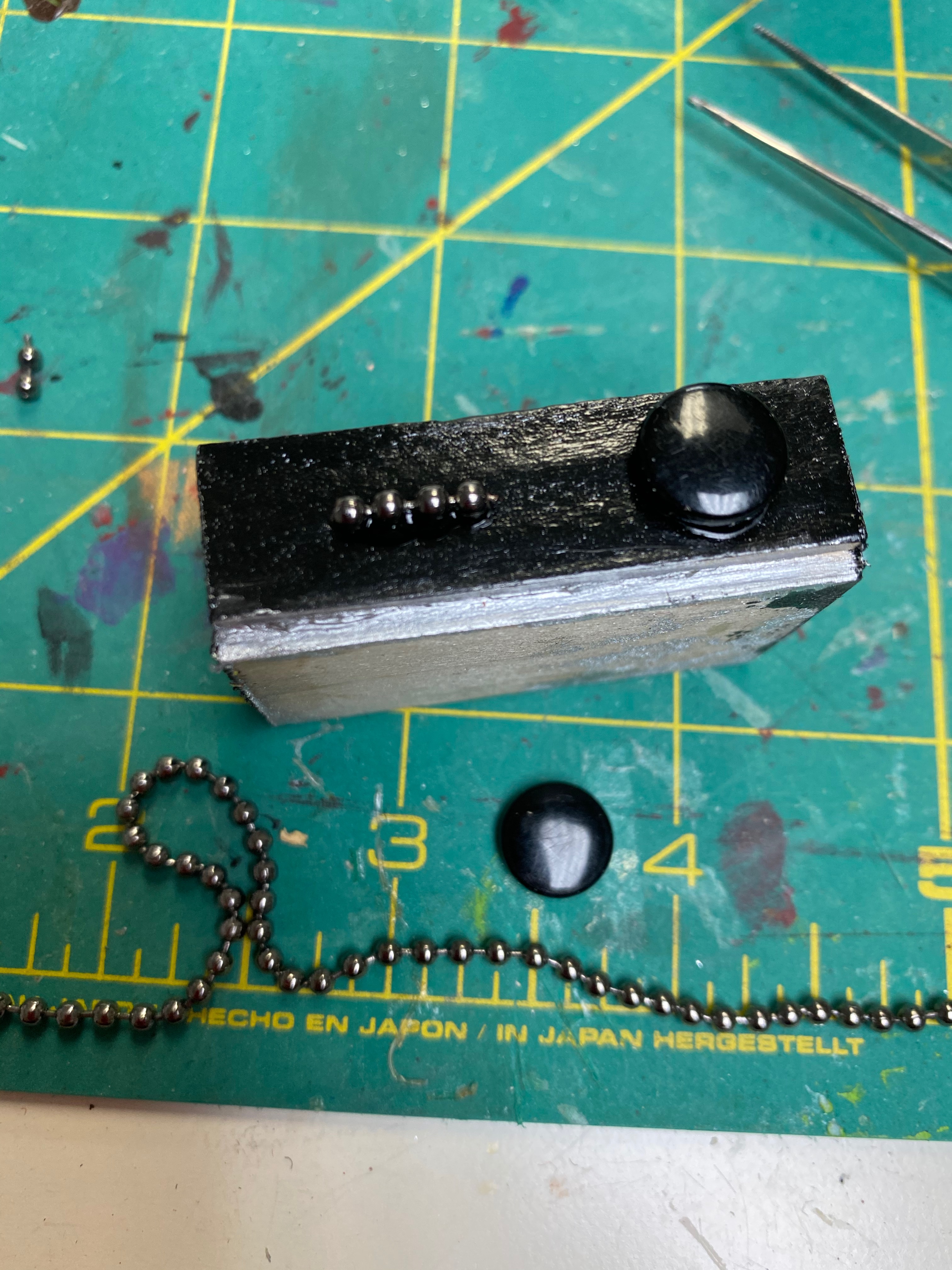 The receiver was made with another small block of wood, a snap and a small section of chain I cut and glued to the front as buttons. I made the speakers with wood and pieces of weird, hard felt stuff that Andy had laying around from his work.
