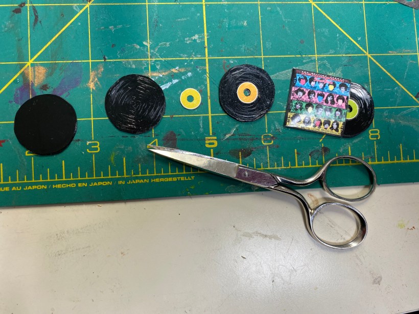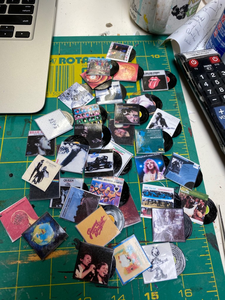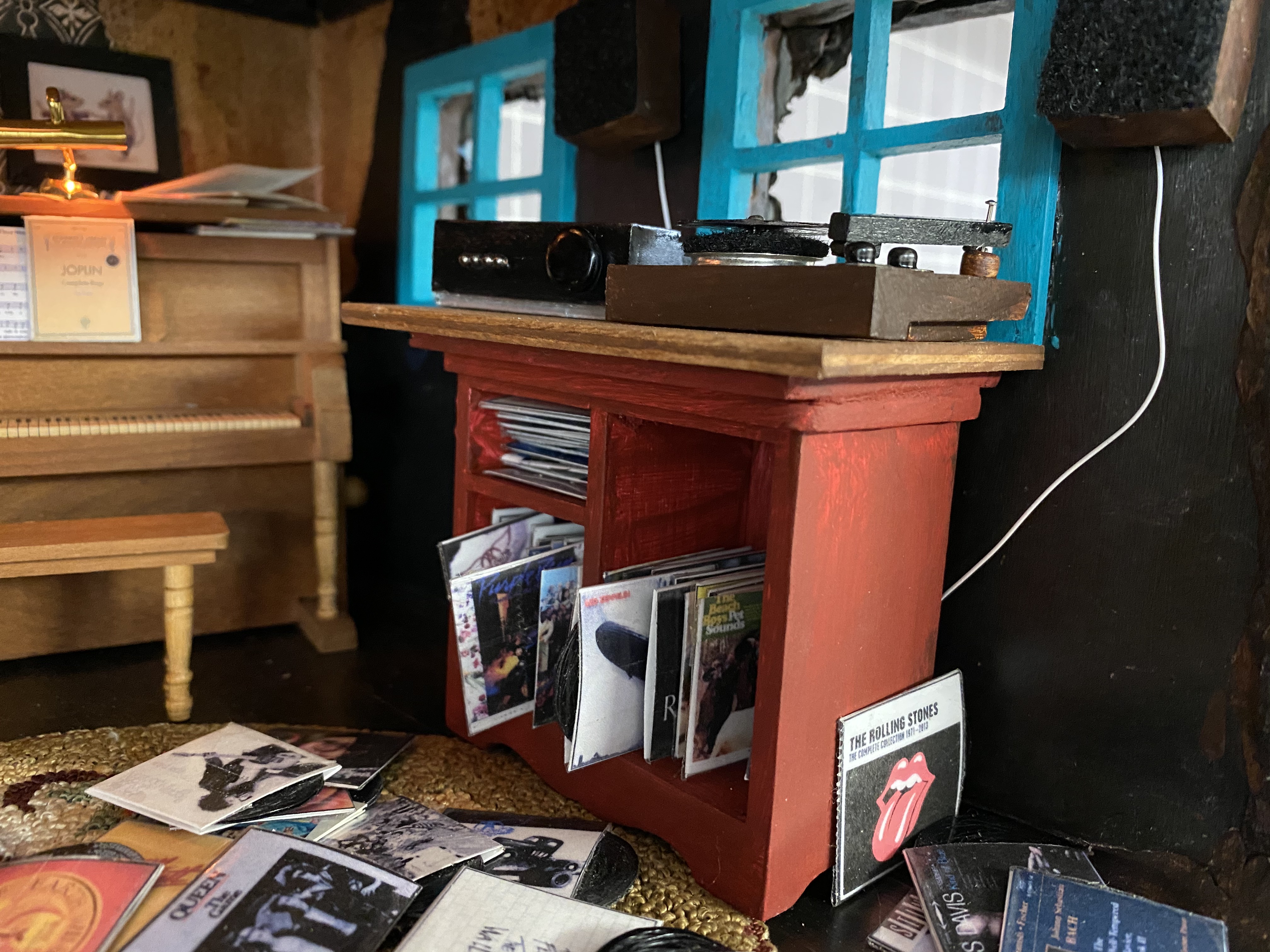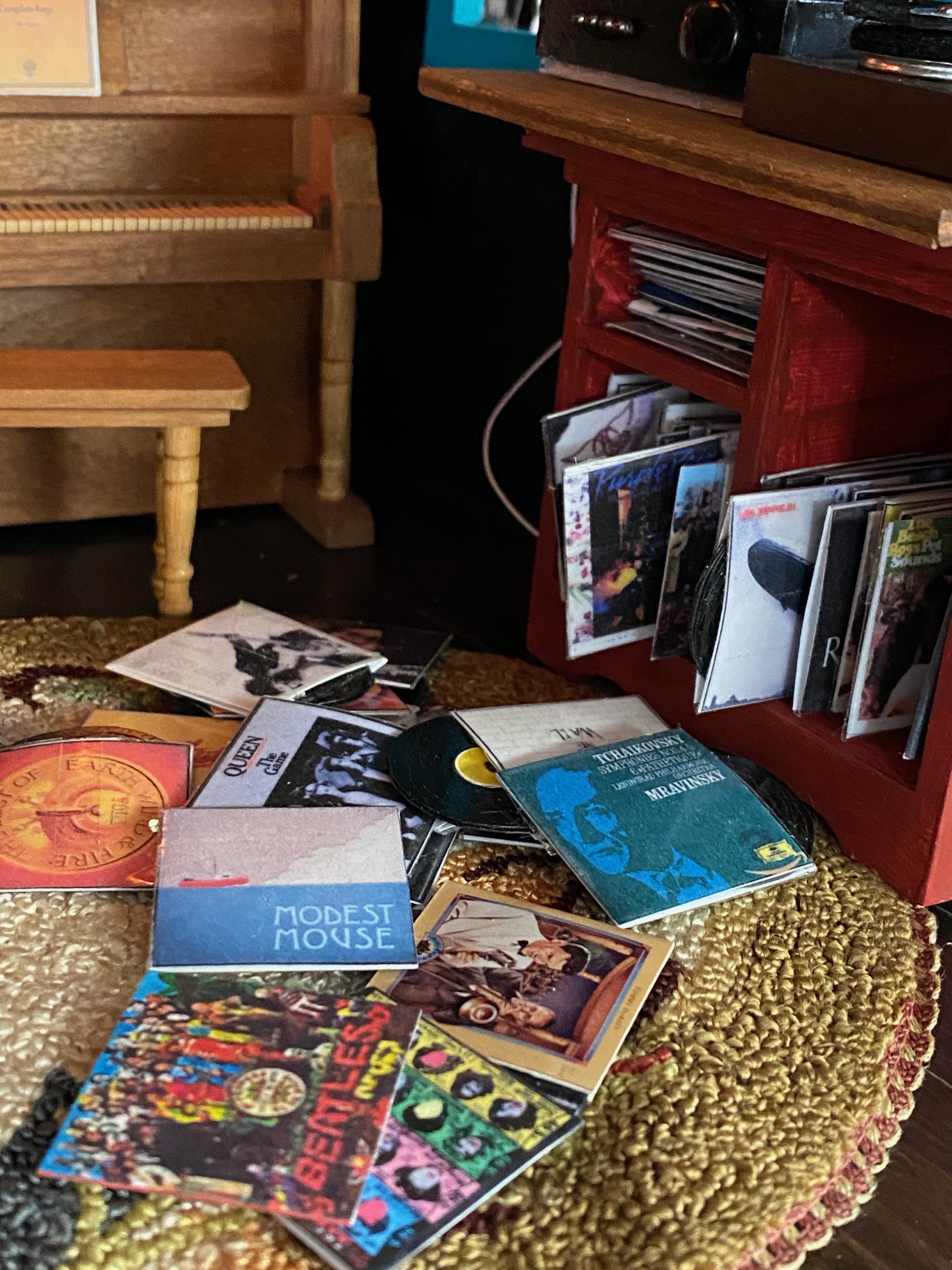 Just like the books in the library, I made lots of record album covers and records for this room. I copied the covers from the internet, shrunk them to size, and then covered them with packing tape for glossy protection.