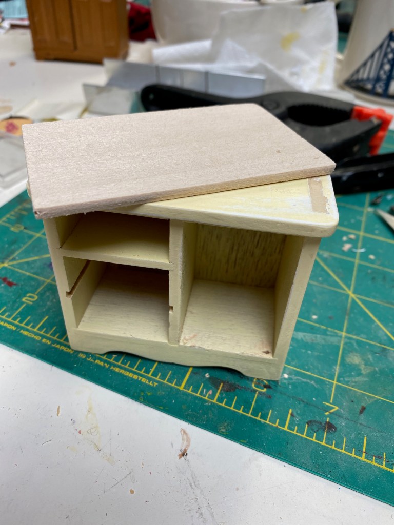 The stereo cabinet and stereo equipment were fun to make. I “bashed” a dresser I already had by taking off the door and drawers and removing a shelf.