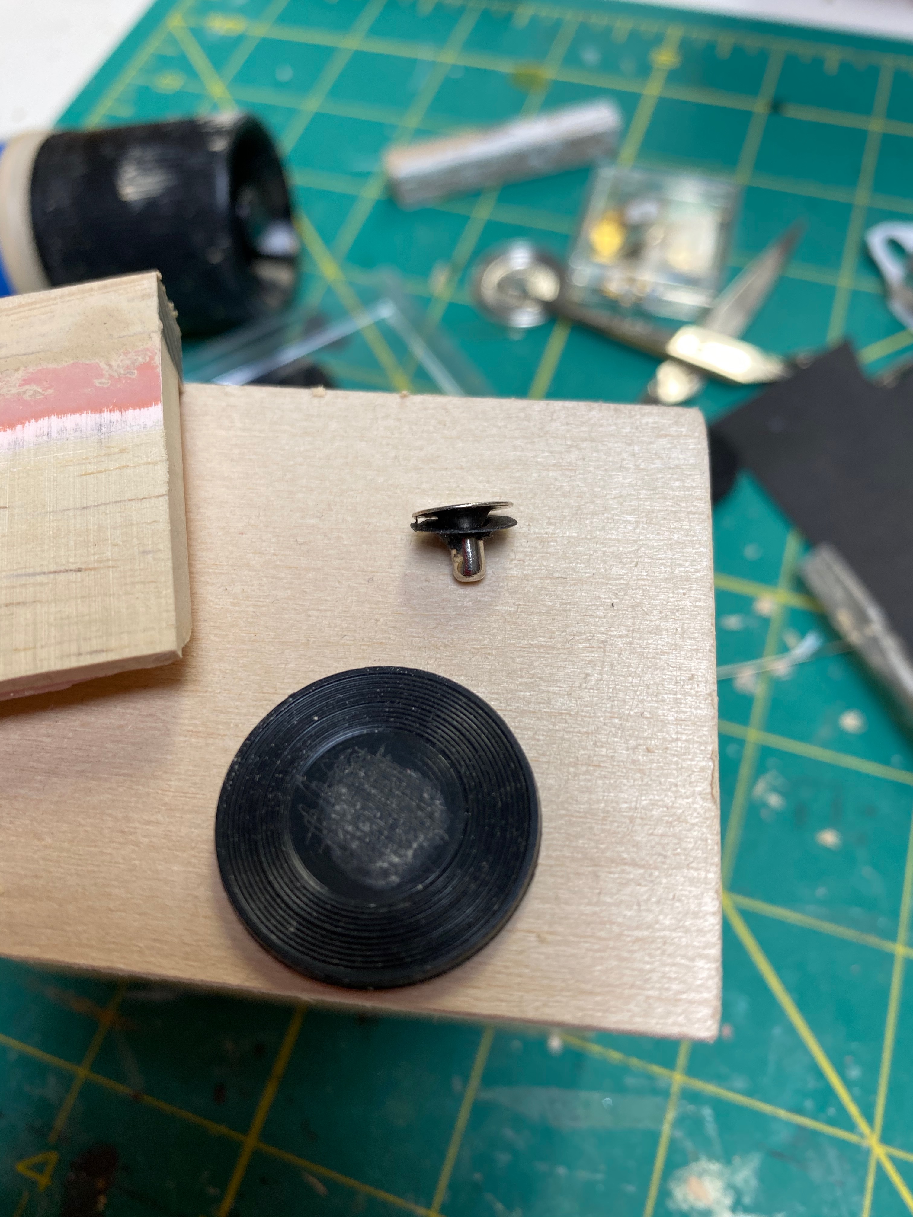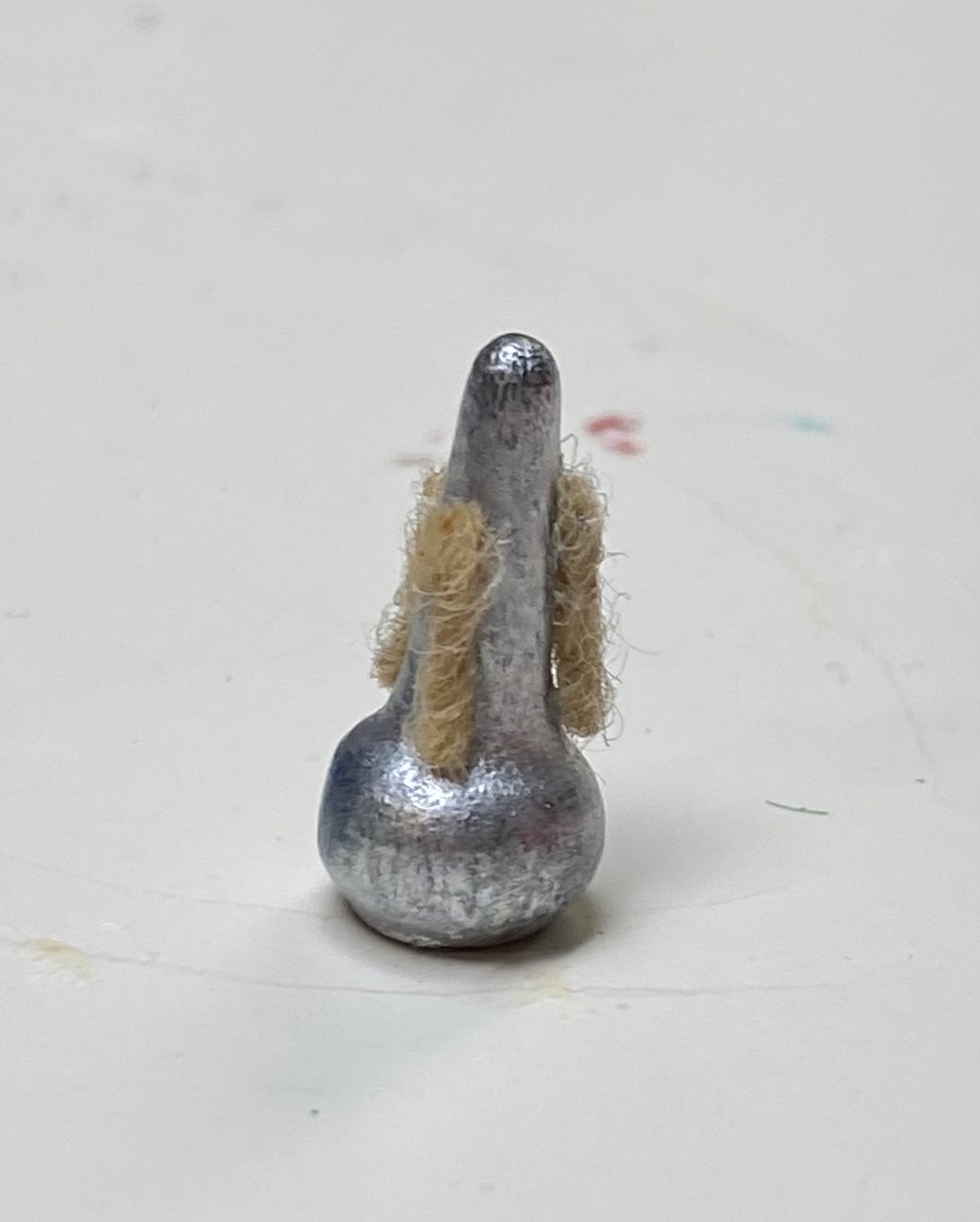 The mute was a wooden game piece painted silver with tiny strips of twine glued to the sides to simulate the protective cork.