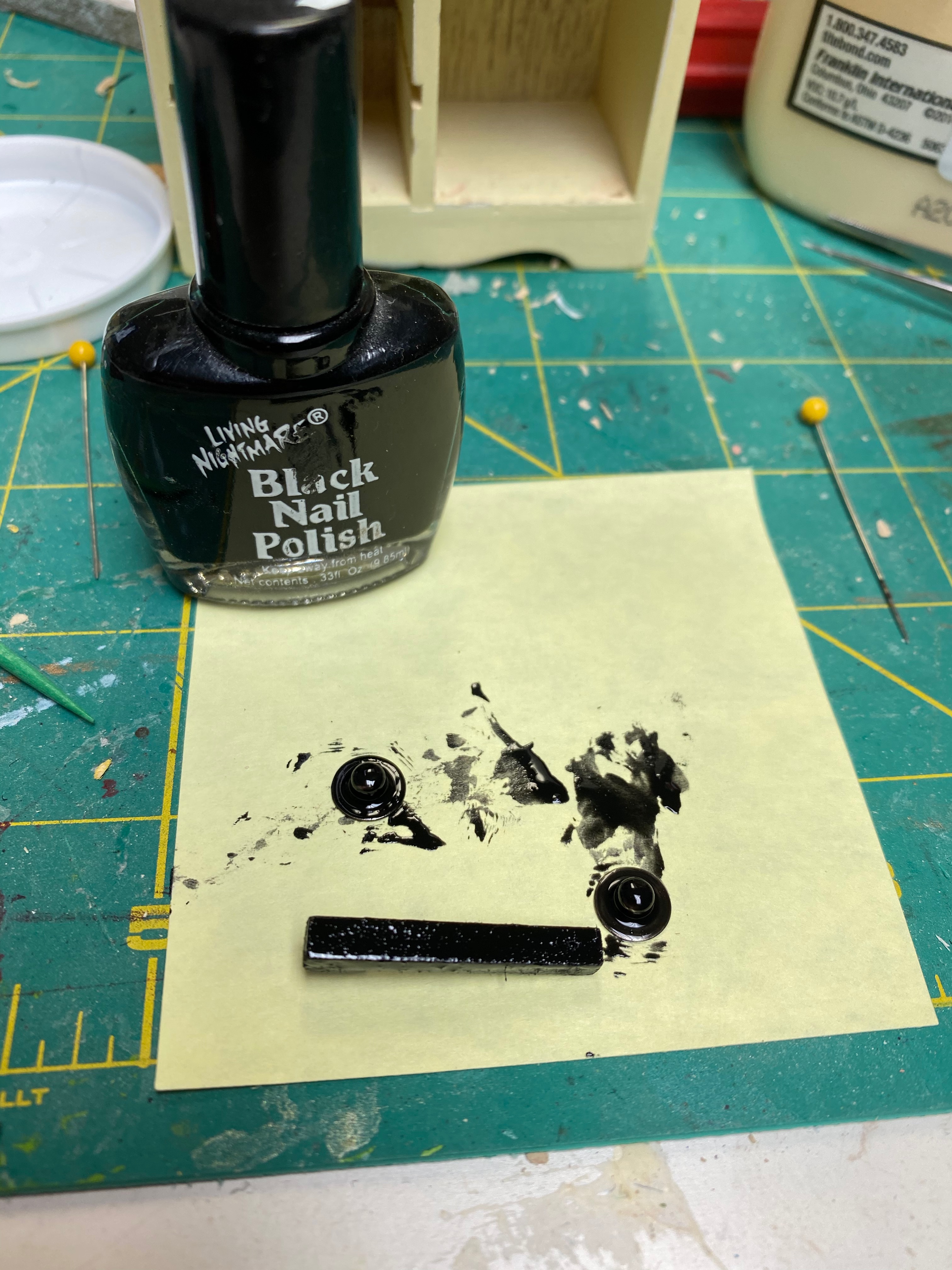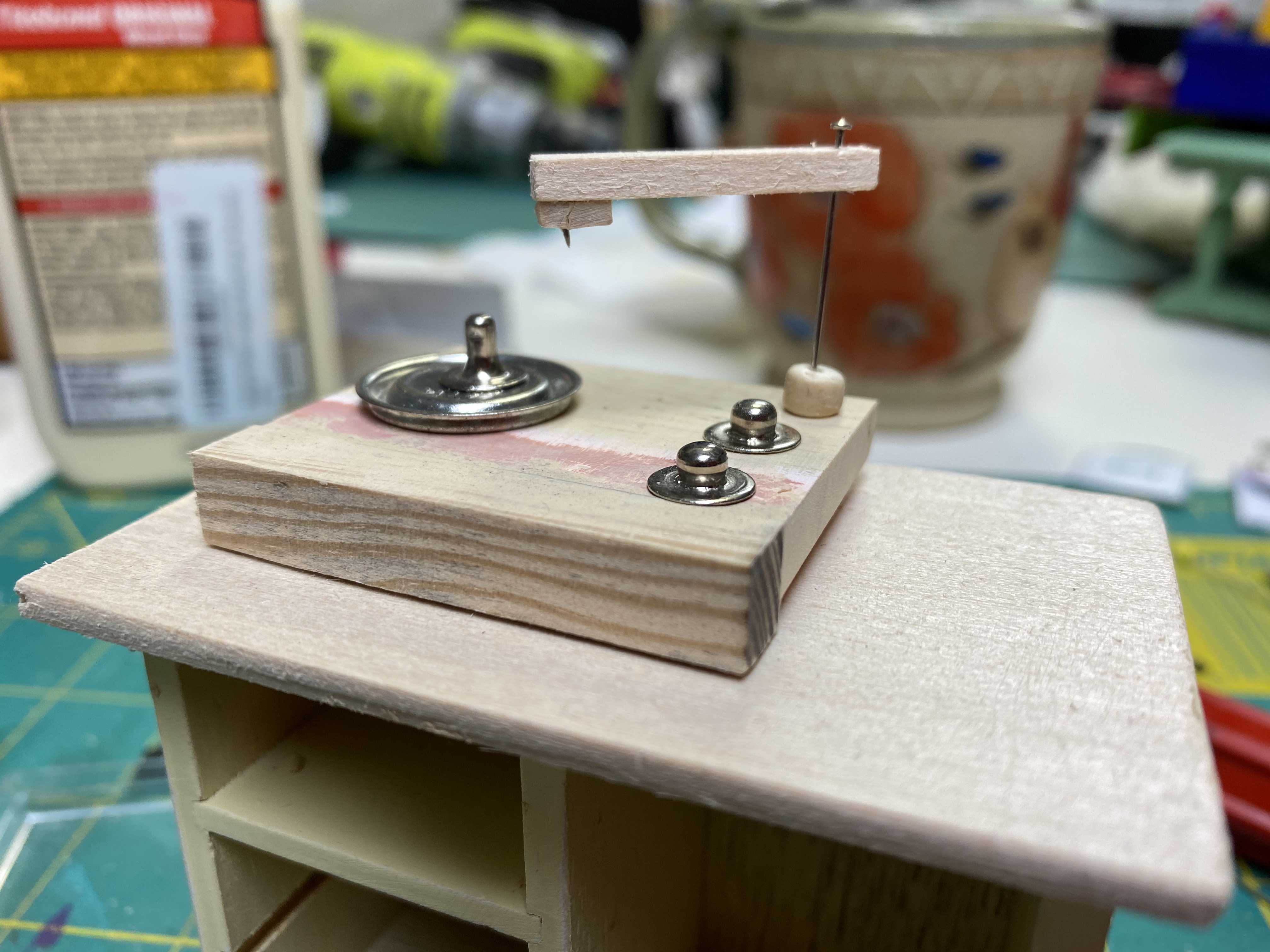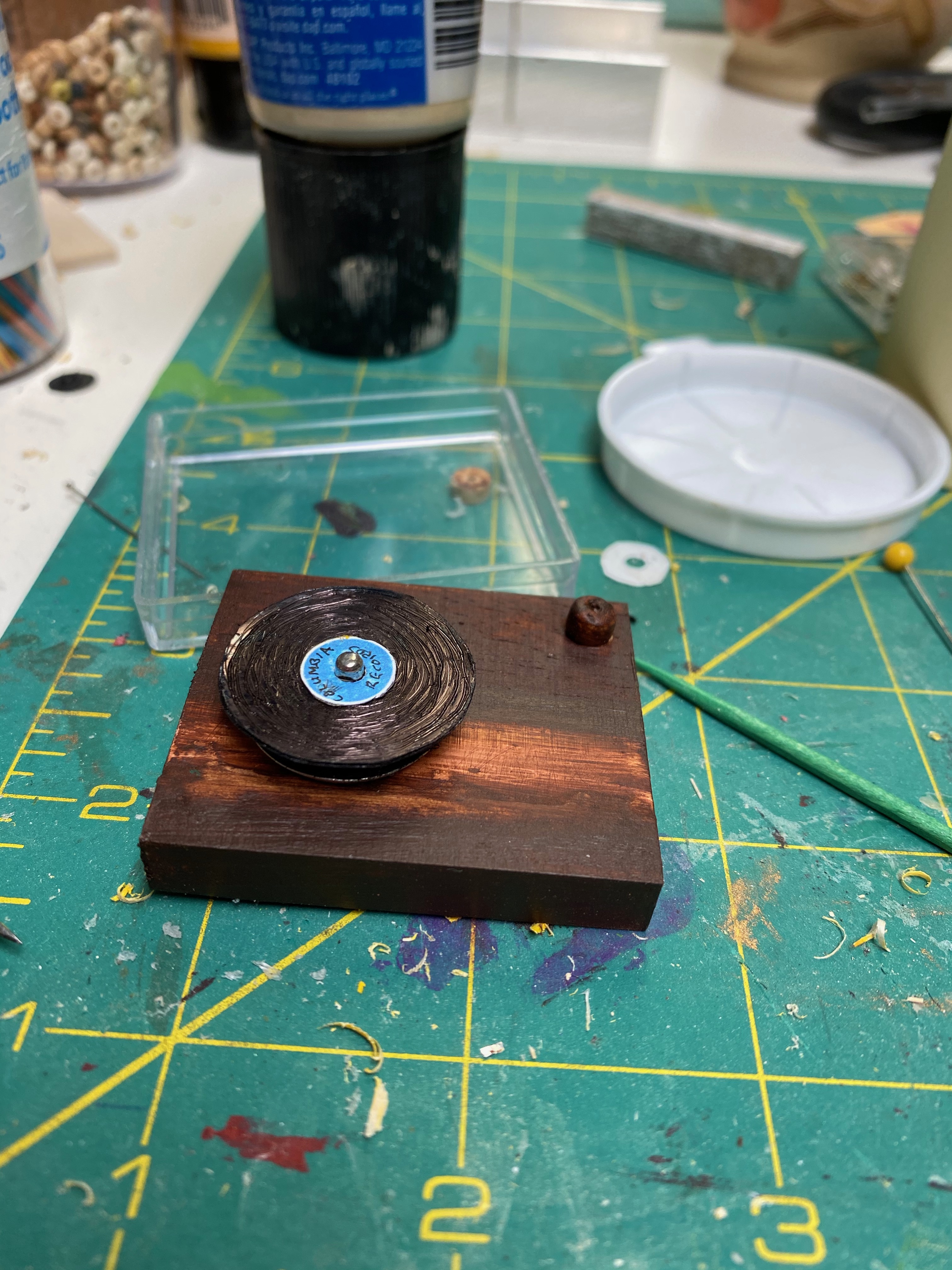 The turntable is essentially a block of wood with snaps for the knobs; a button and snap for the turntable; a small strip of wood for the arm; and a teeny tiny pin inserted into the wood to make the needle. I’m especially proud of the rotating arm!