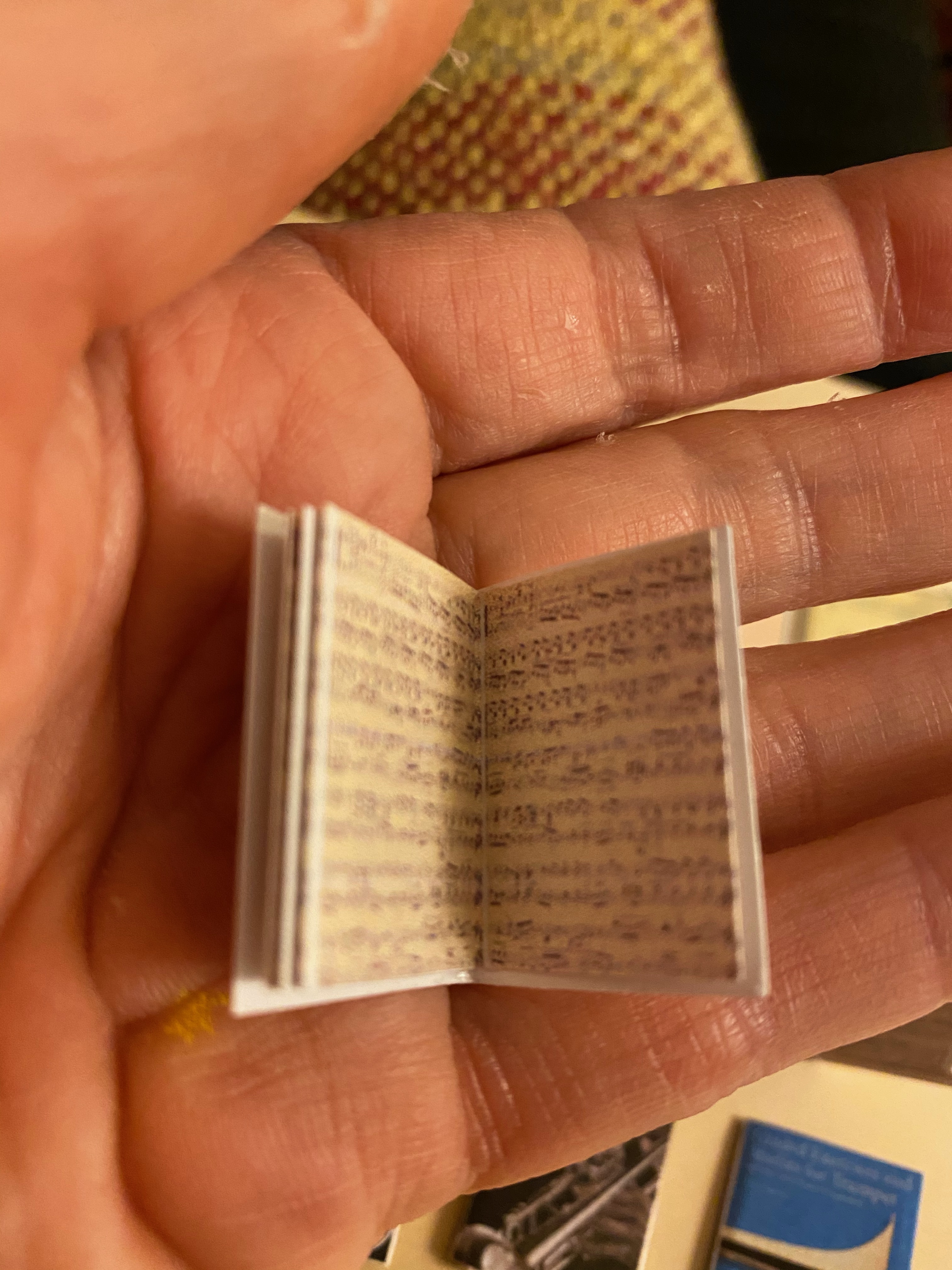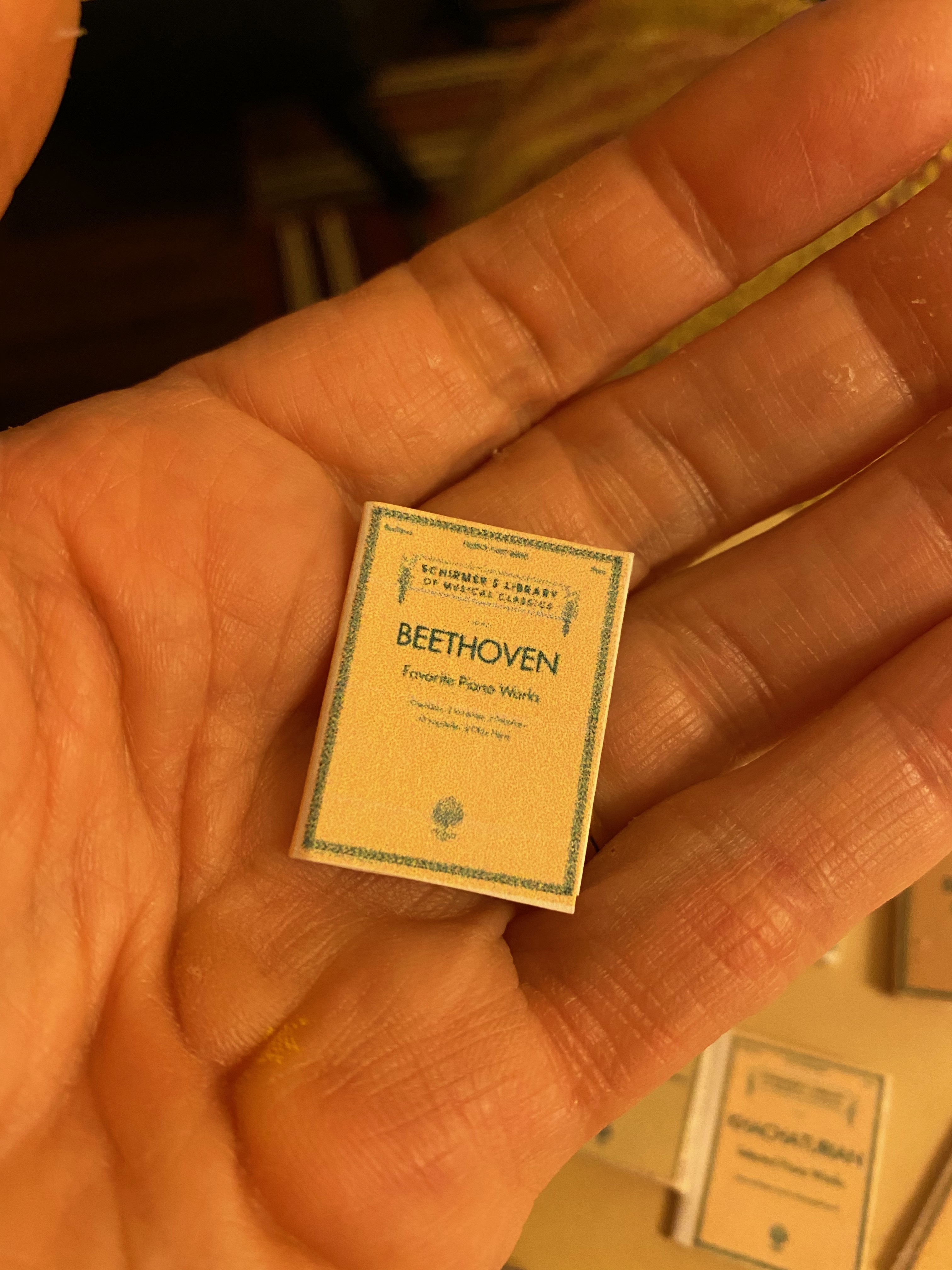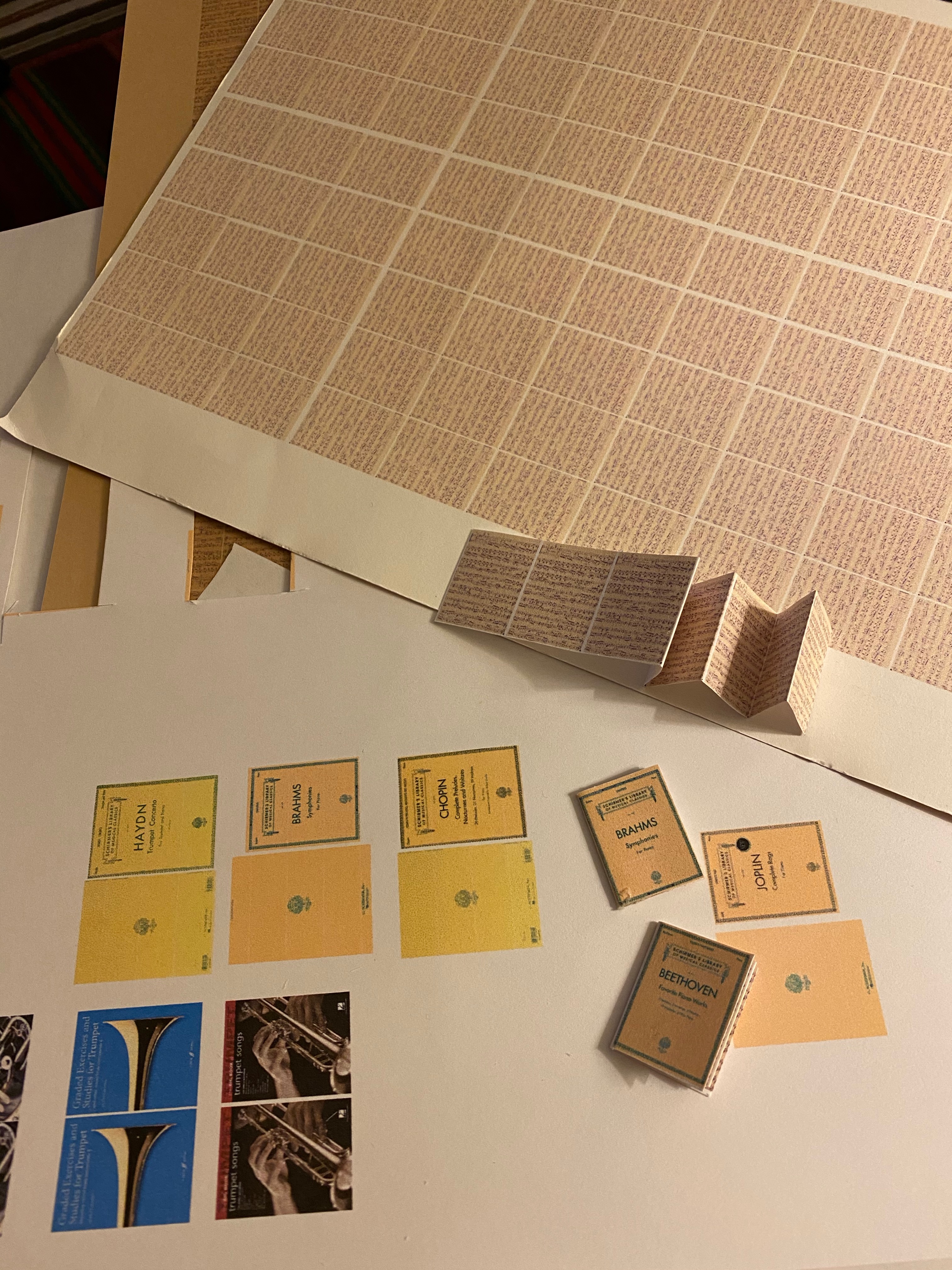 I also made a lot of music books for the shelves and piano. Again, images are prolific on the internet so I printed the covers and made them just as I constructed the reading books in the library, using resized music as the inside pages.