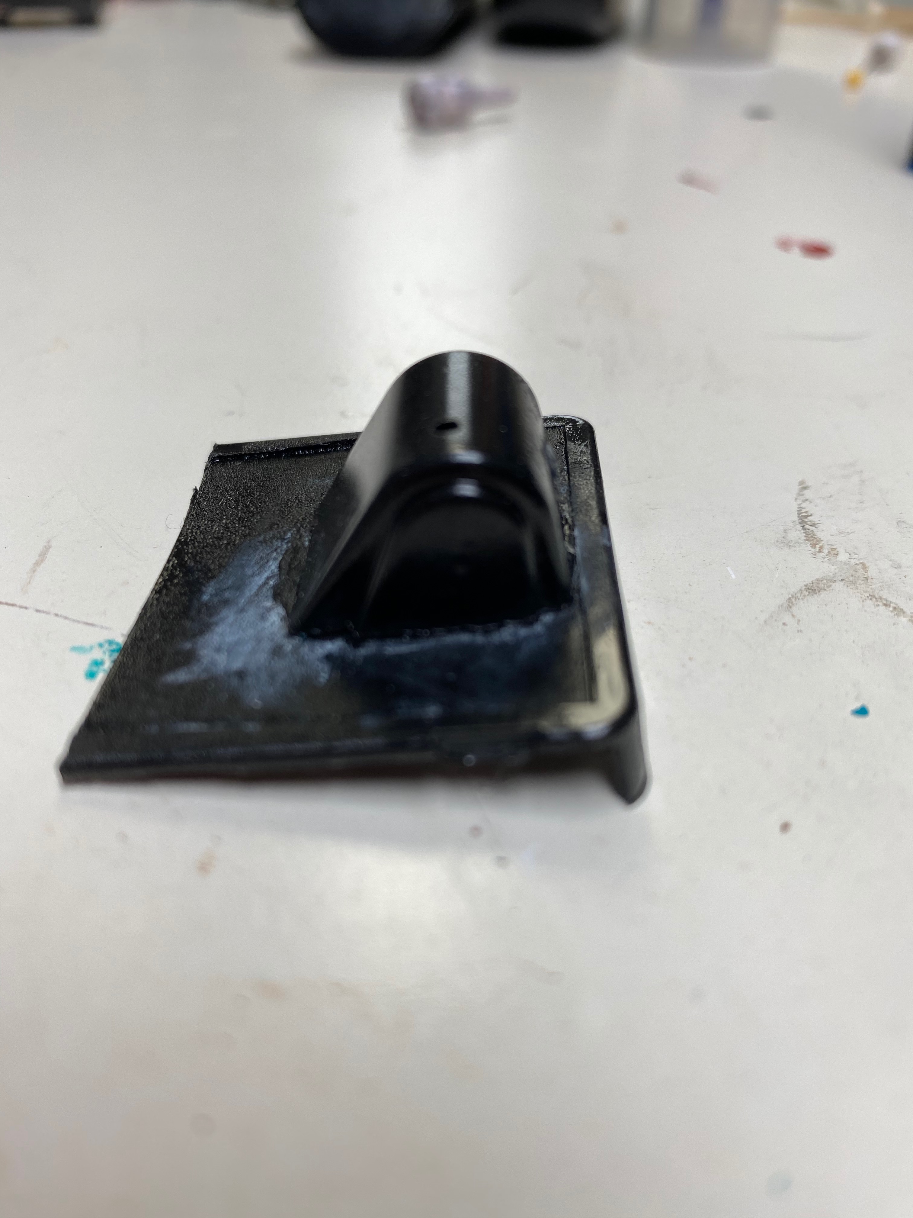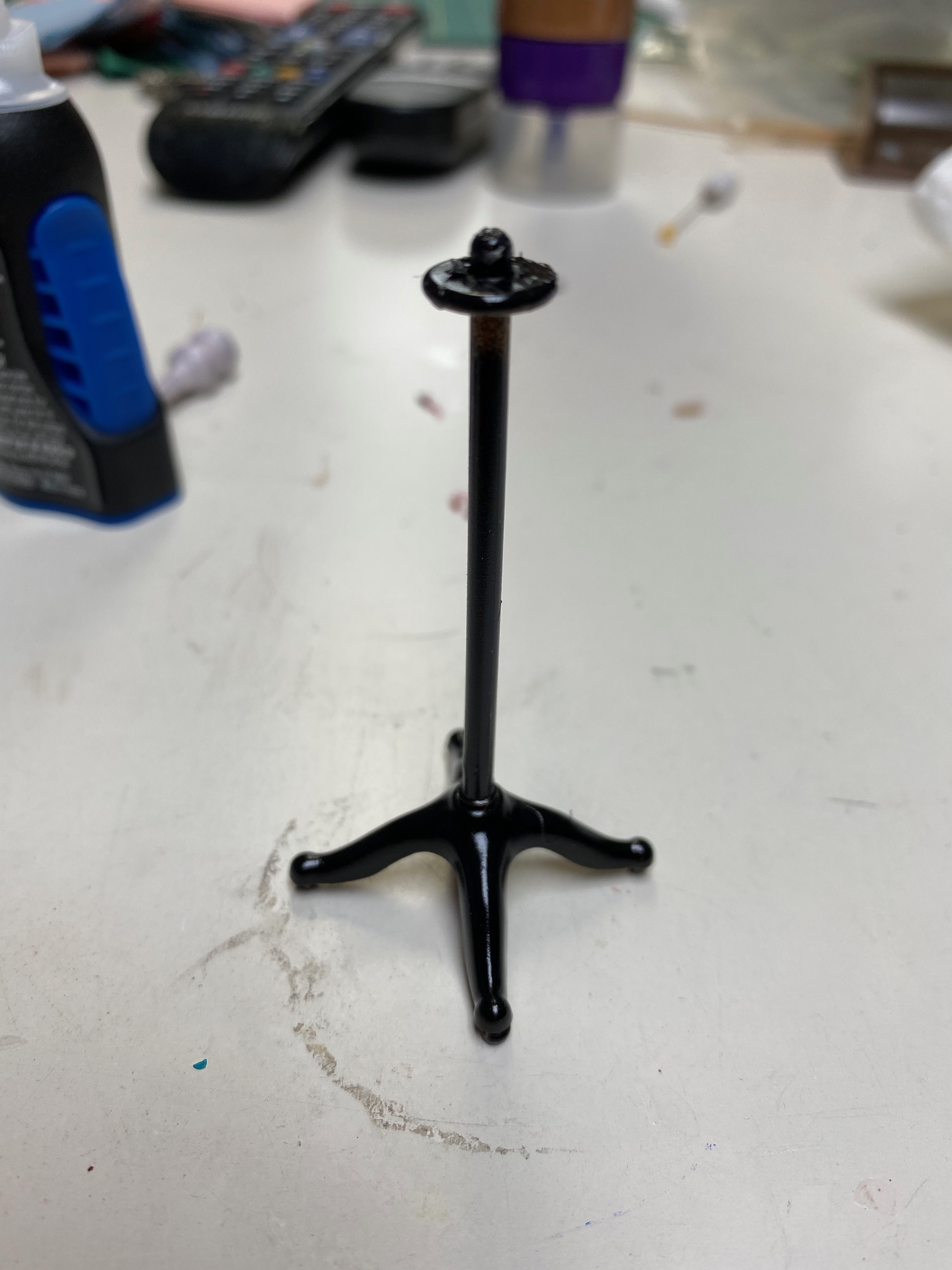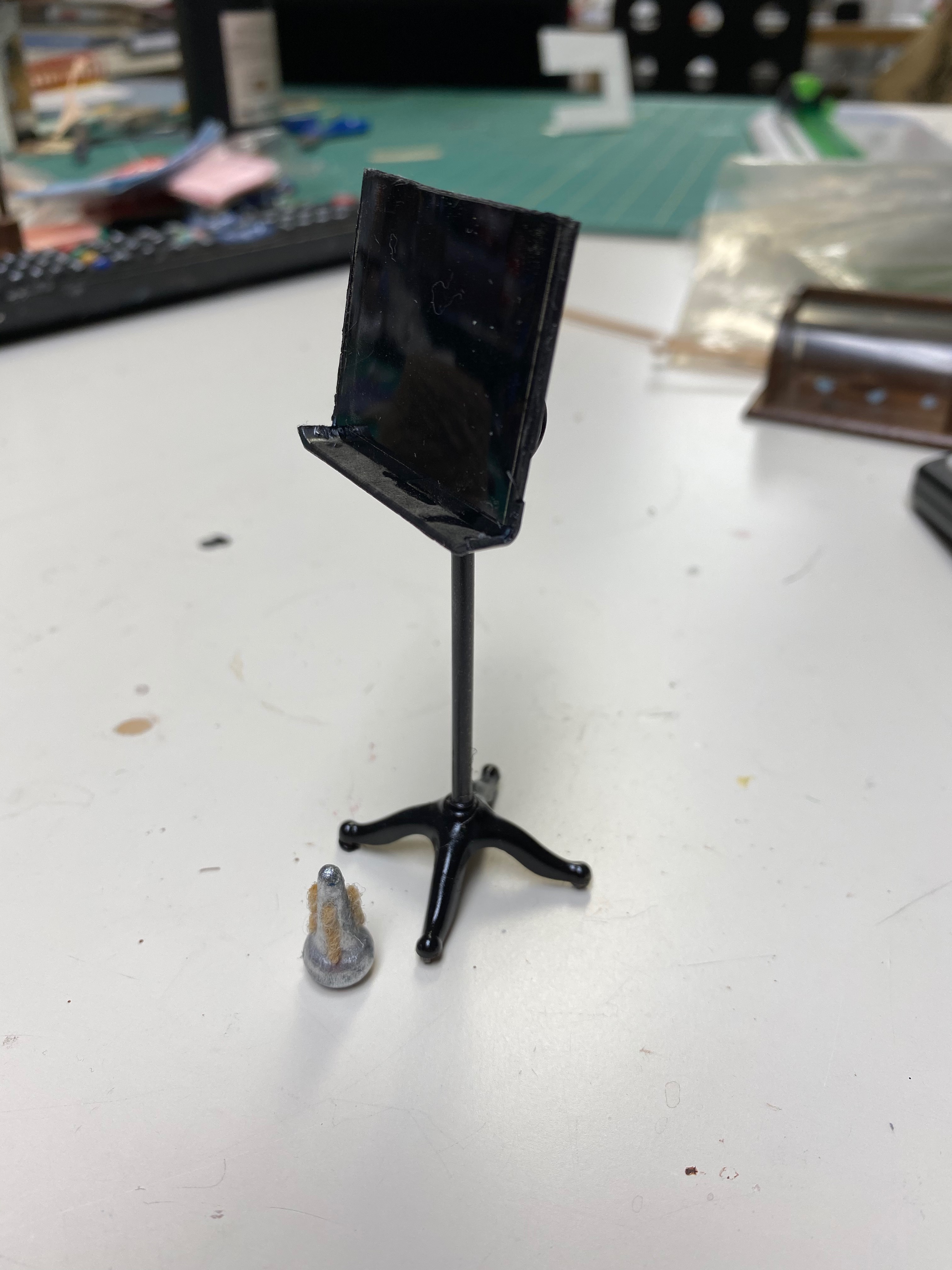 Finally, I made a music stand and trumpet mute. These had to be accurate since my oldest son is a professional trumpet player! I took a broken plant stand from my garage sale acquired dollhouse accessories and spray painted it black. I made the top part with half of a plastic lid with the top of a scrapbook tape dispenser glued to the back. Once spray painted and glued to the stand it looked just like the heavy stands Zack uses for practice/gigs.