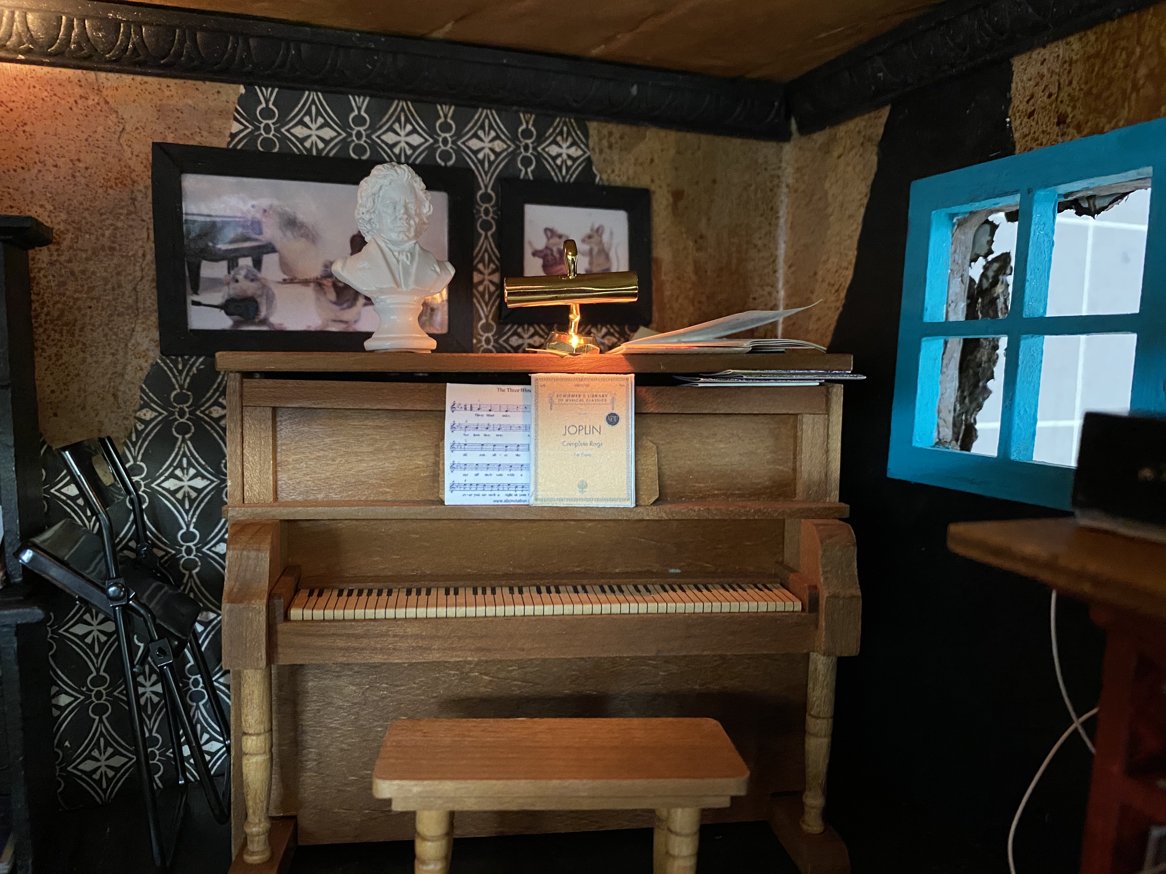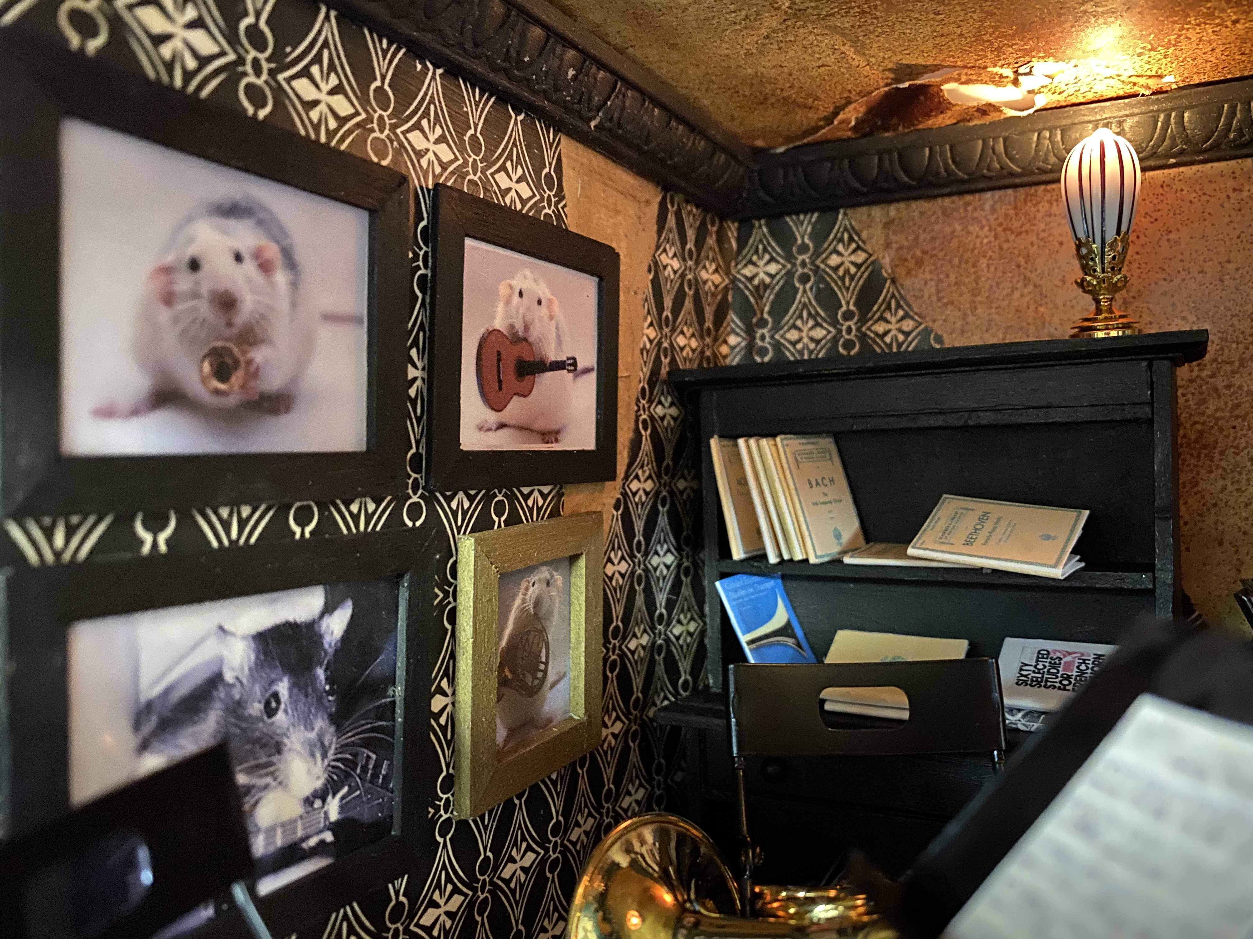 I also printed and framed several mouse-music related images for the walls, which were easier to find than I could ever imagine. (Actually, some of these pictures are rats, but shrunk to size I think they are close enough!)