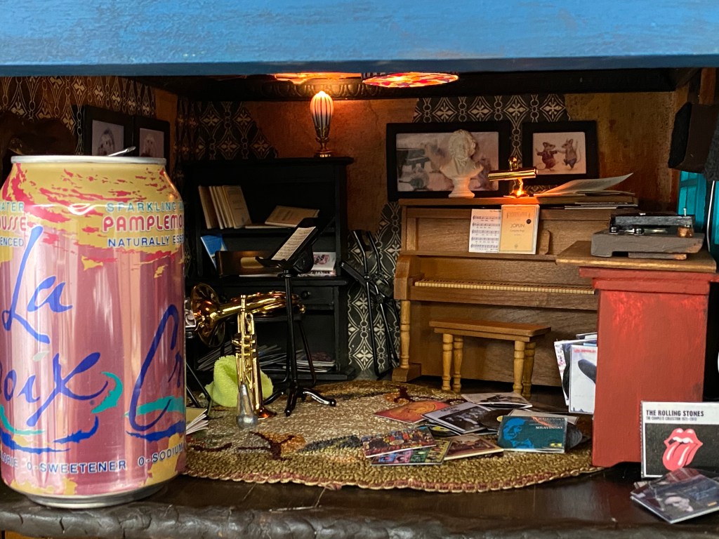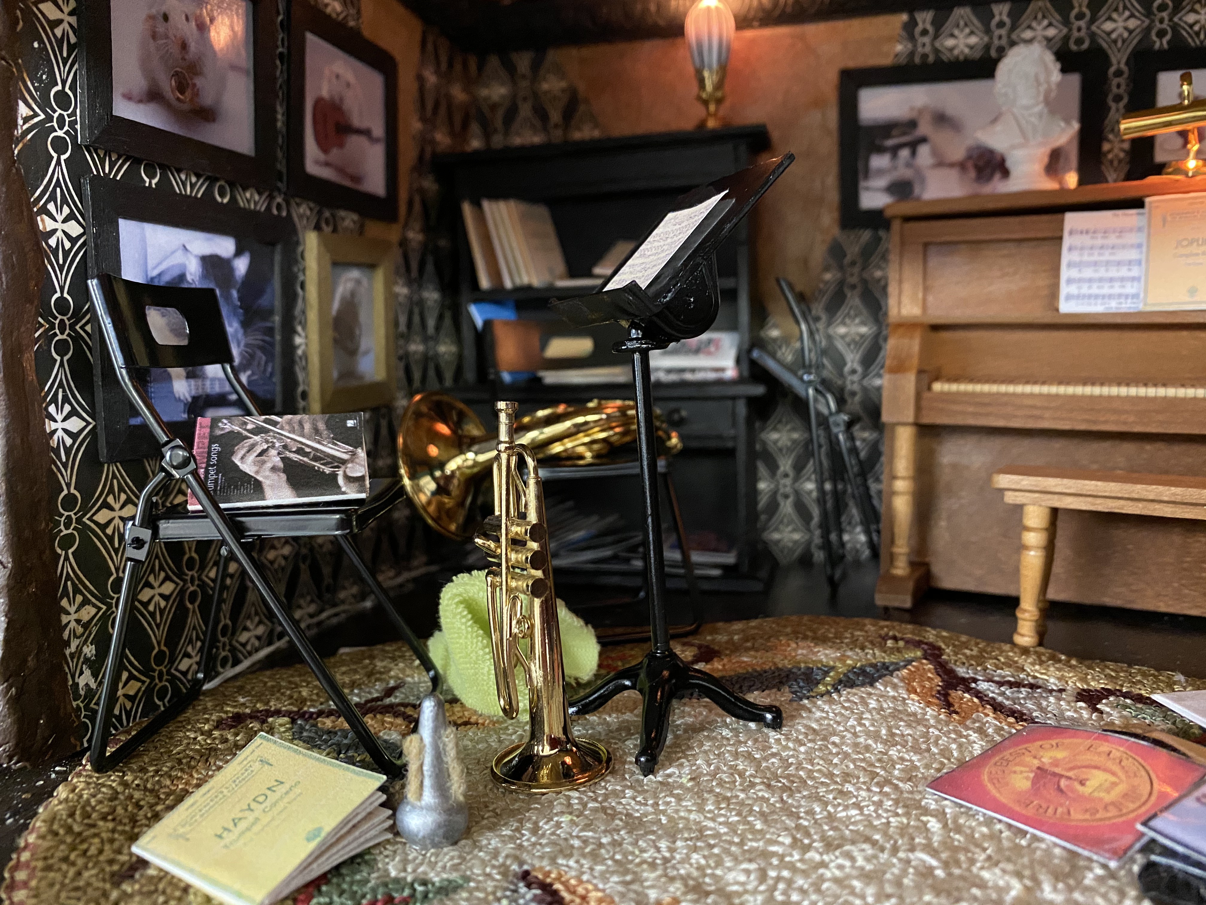 The musical instruments, piano, French horn and trumpet were all items I’ve purchased at sales over the last few years. I also have a violin and bow that I may add at a later date. For now, I think the room is complete.