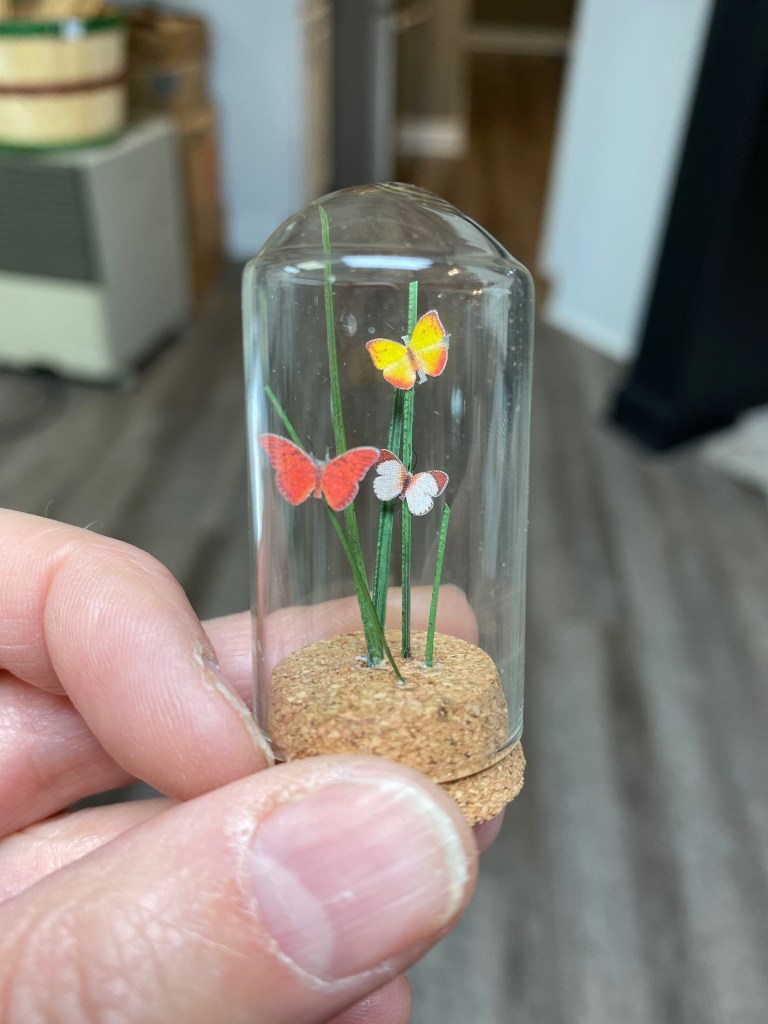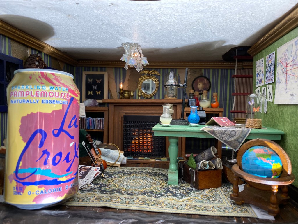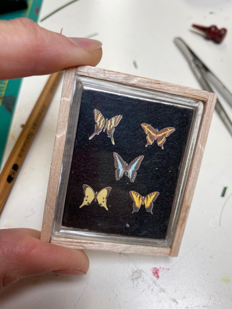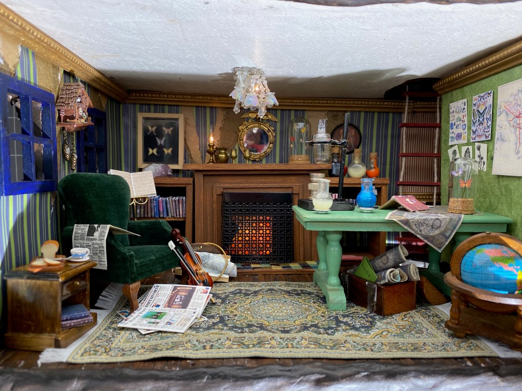 After that came the butterflies: I made a framed display and also made domed dioramas to put on the table and the mantle. I printed butterfly prints for the walls and added a map with string “markers” to document the butterfly excursions.The room was completed with books I made and other accessories I have built or collected.