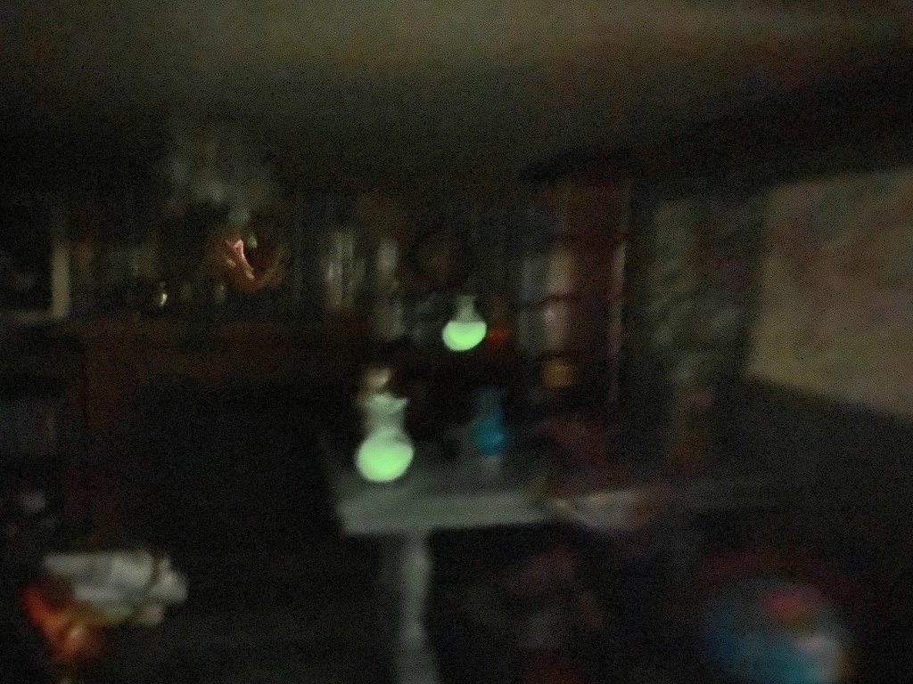 I filled the beakers on the table and on the bookshelf with nail polish also given to me by Leann. The “white” beakers are two of the things I like the best in the house so far–the nail polish glows in the dark! Here are a couple of photos with the lights off. Isn’t that cool?!!