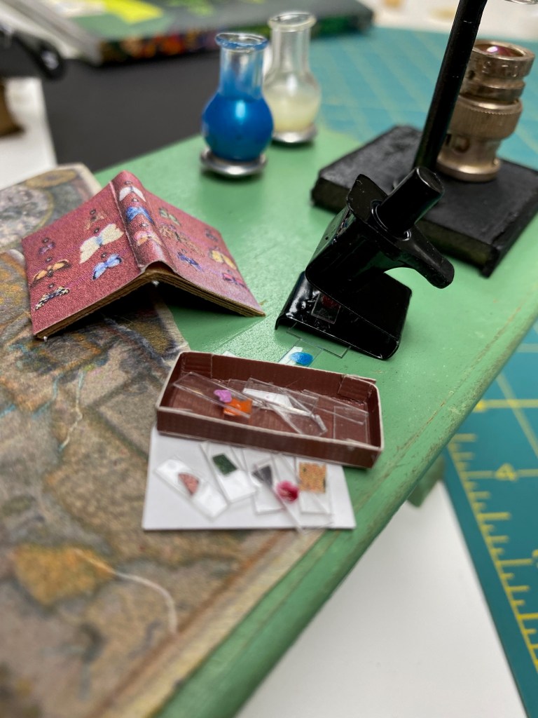 I then focused on the table and all of the accessories I wanted to display. This included a microscope I made out of an IKEA shelf support and a tape dispenser lid. I also made a box of mini slides with dabs of paint on teeny pieces of plastic.