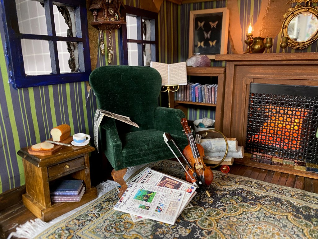 I finally finished the Mouse House Study last week. It’s a spot for the scientist mouse who tracks and collects butterflies all over the world; plays the violin; dabbles in geology; experiments with chemistry; and enjoys reading newspapers in front of the fireplace.