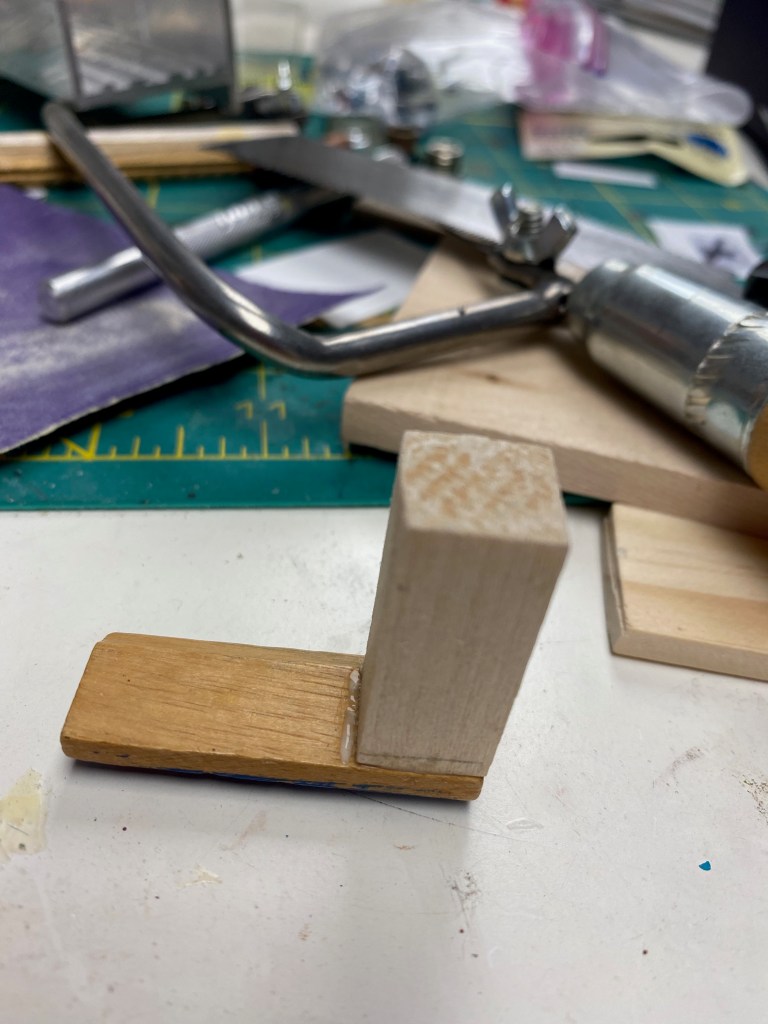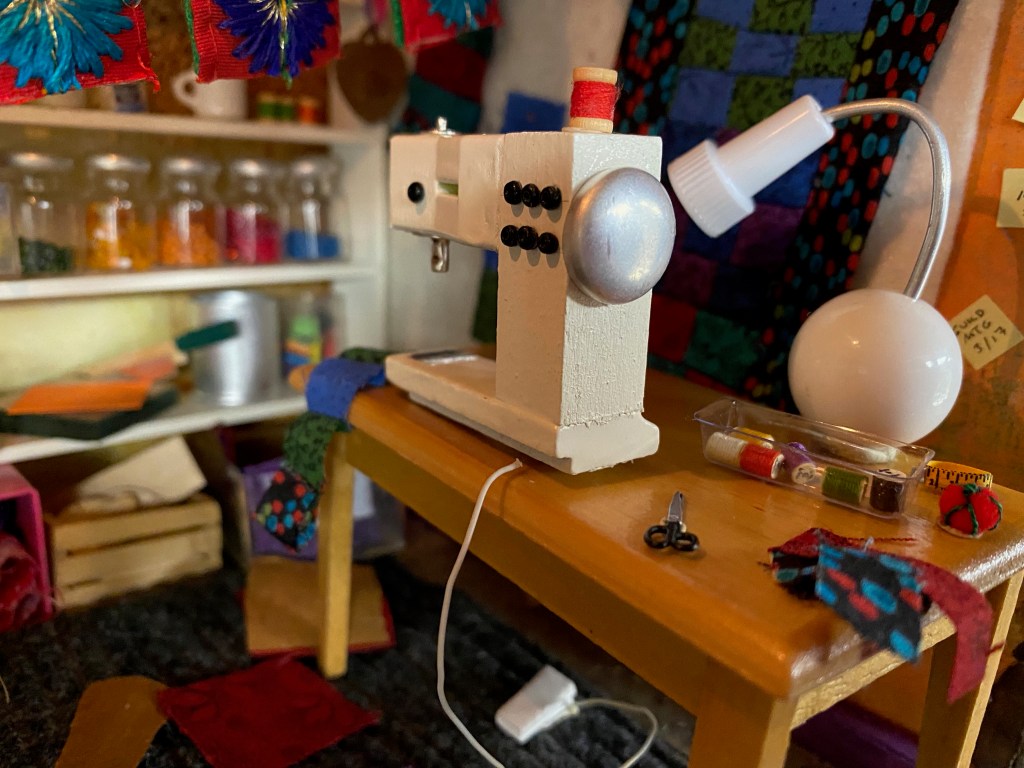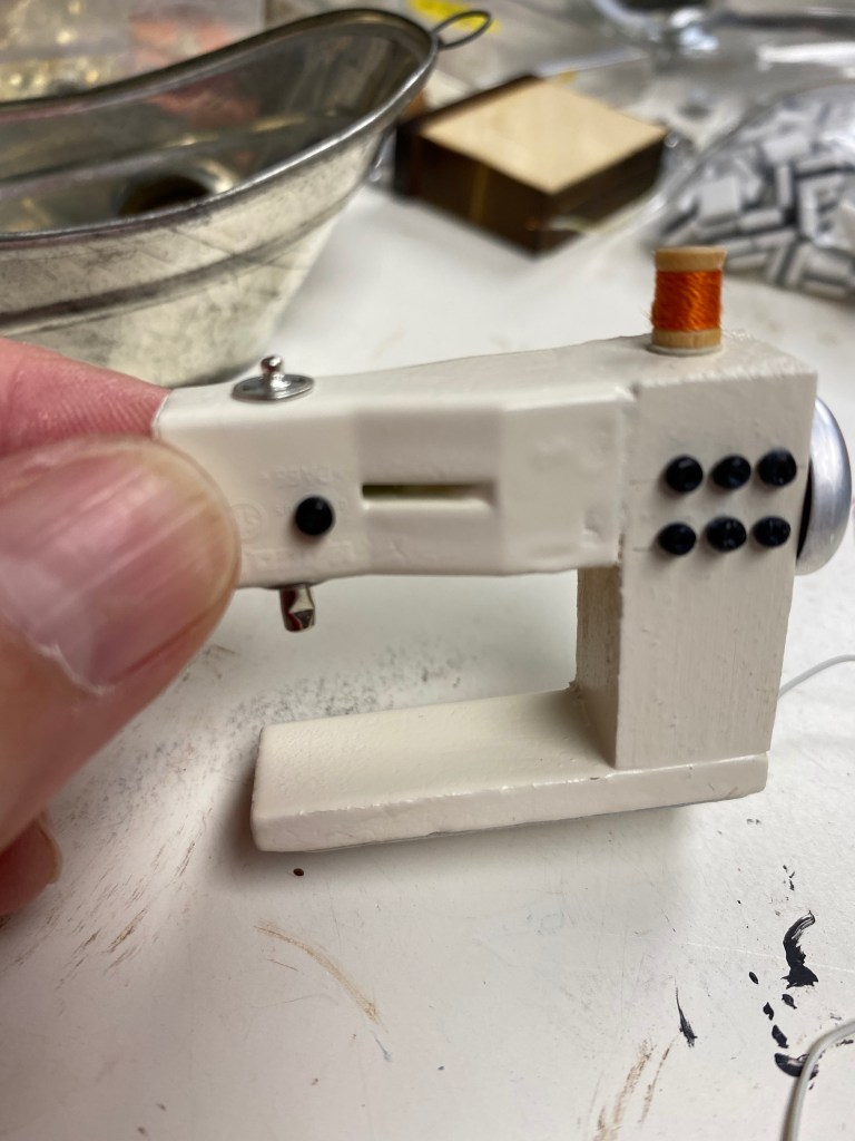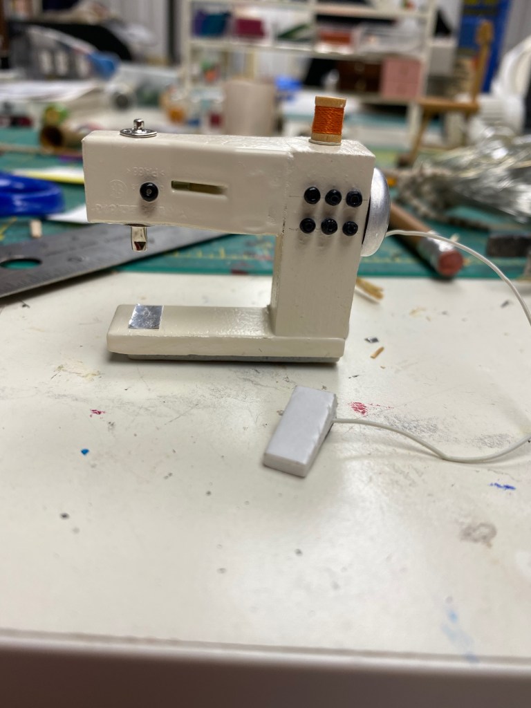 I completed the sewing machine “vignette” with a pedal and attached it to a table with assorted sewing supplies.