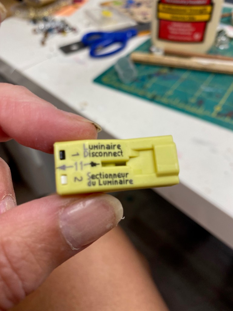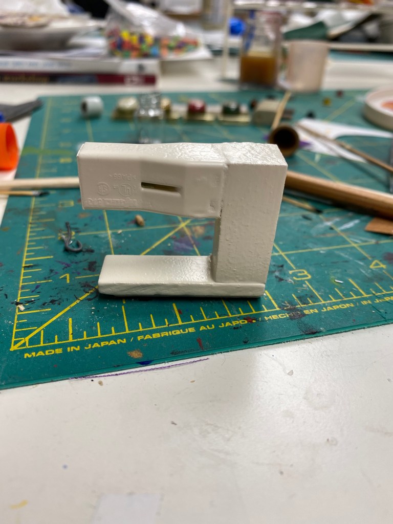 Next, I built the sewing machine. It took awhile for me to find the right pieces to build it but once I discovered this electrical-connector-thingie in one of my junk boxes I knew I was on to something. With a little glue, paint, snaps, buttons and foil, this is what I came up with:
