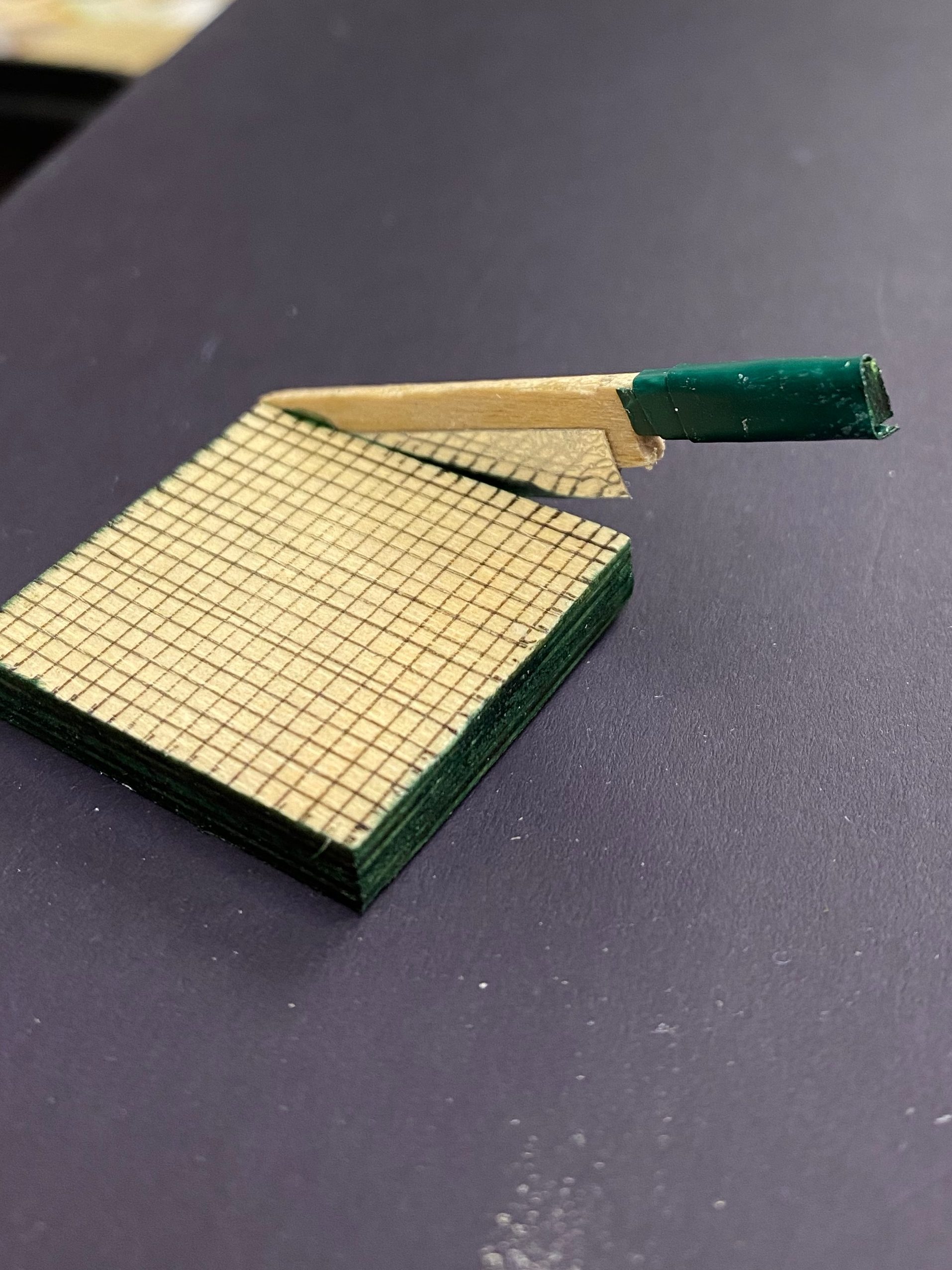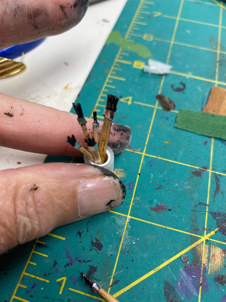 I made the paint brushes with small skewers trimmed to size. I was able to “shred” the skewers at the top to make the bristles which I then dipped into black paint and wrapped with a silver piece of foil.