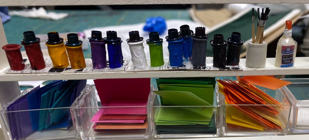 I began with the paint jars and brushes. The “jars” are just slices of a plastic drinking straw I cut and painted. I then attached “snap” for the tops. I also made bins of scrapbook paper and a bottle of glue from a plastic syringe and a label from the internet.