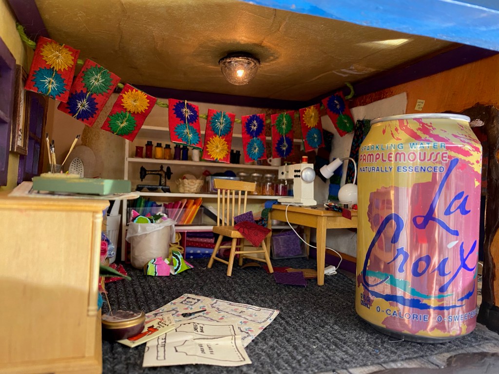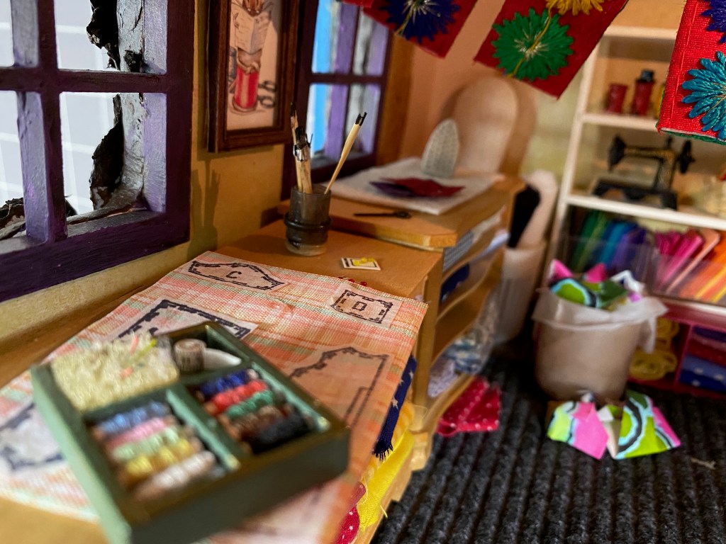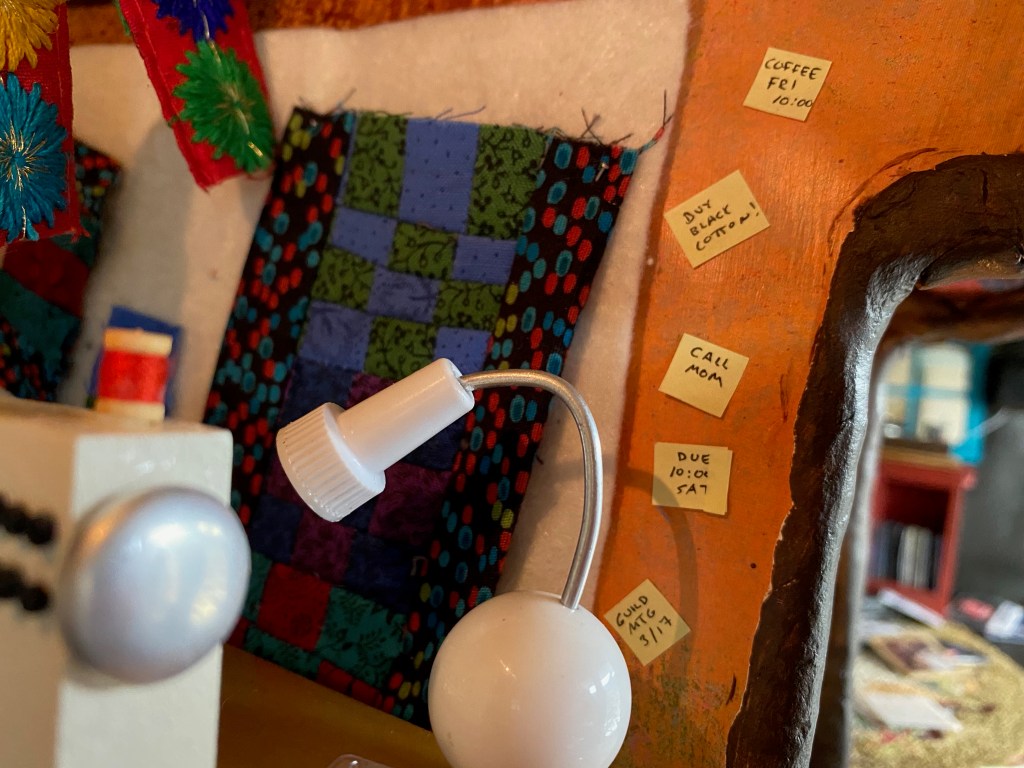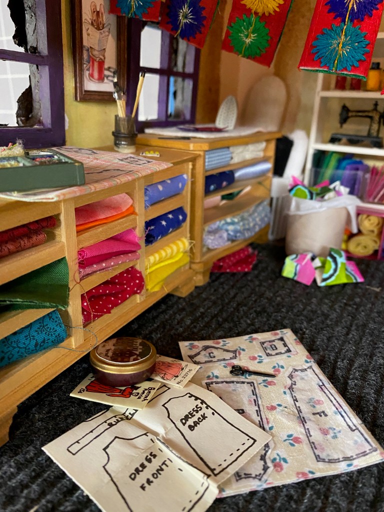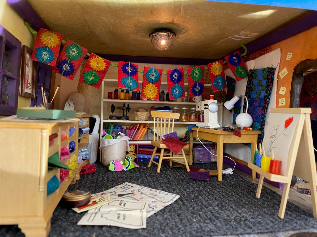 The sewing room/art studio in the Mouse House took some thought. It was hard to decide what should go in it–I have so much in my own studio that paring it down was a challenge.