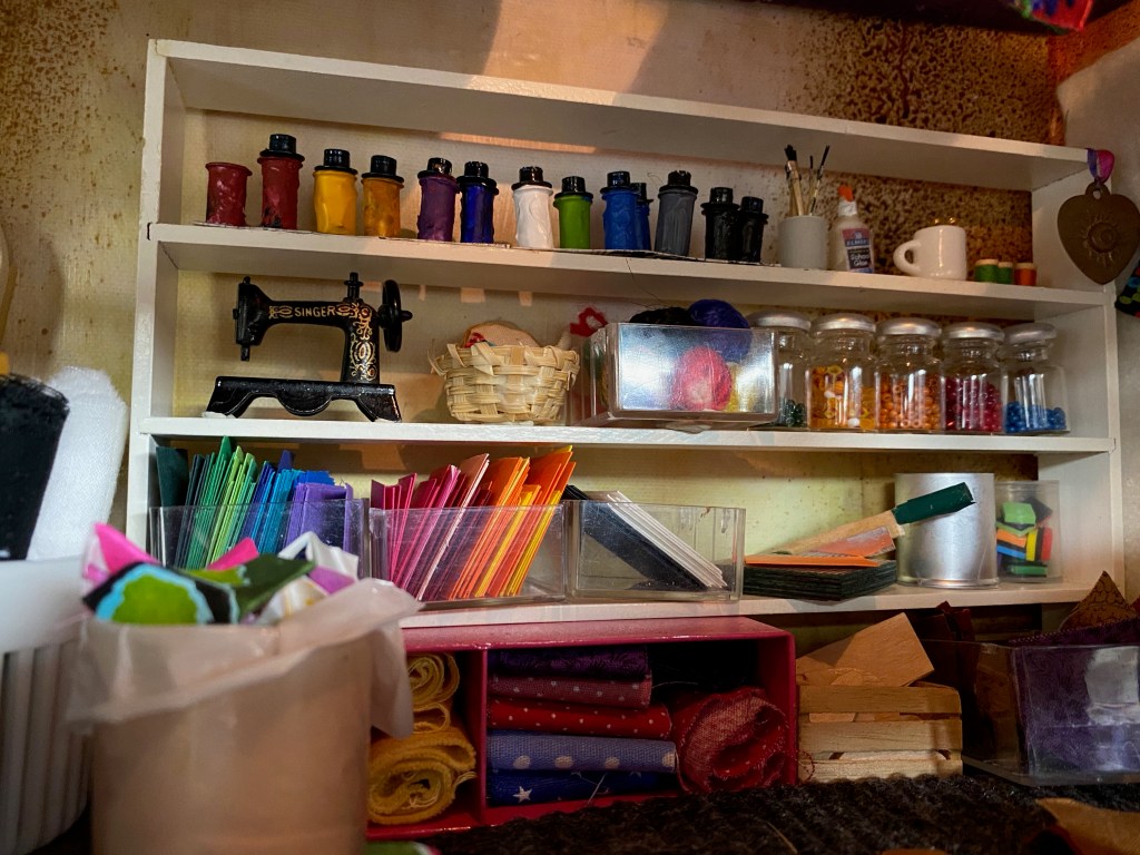 I completed the shelves with bins of yarn and fabric, bottles of buttons, a crate of scrap wood and a paper cutter I made with wood and foil.