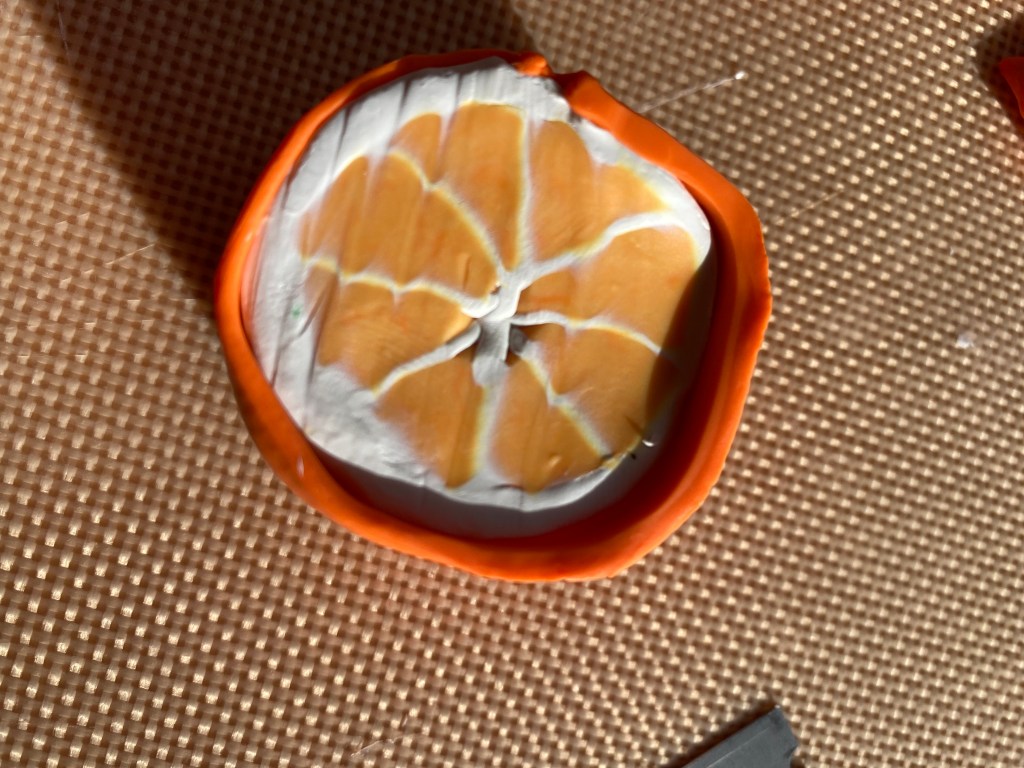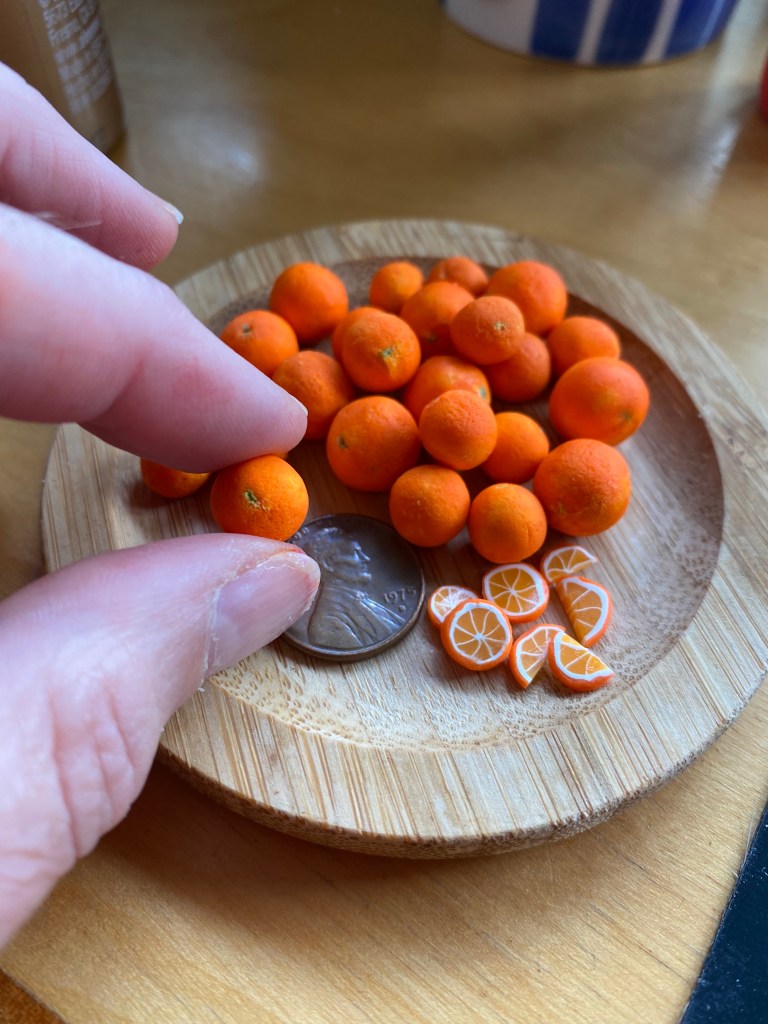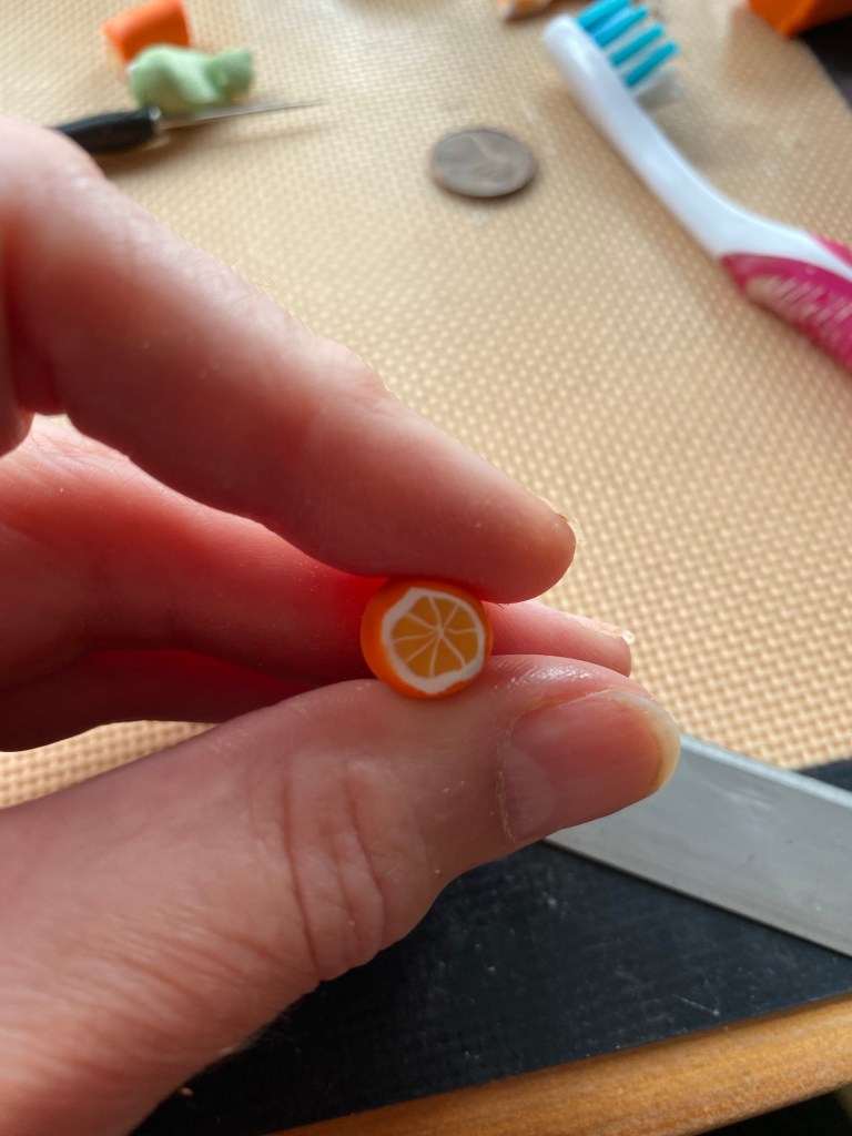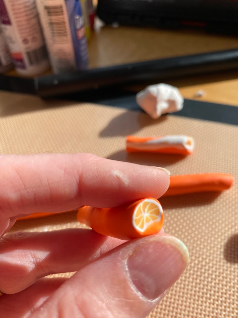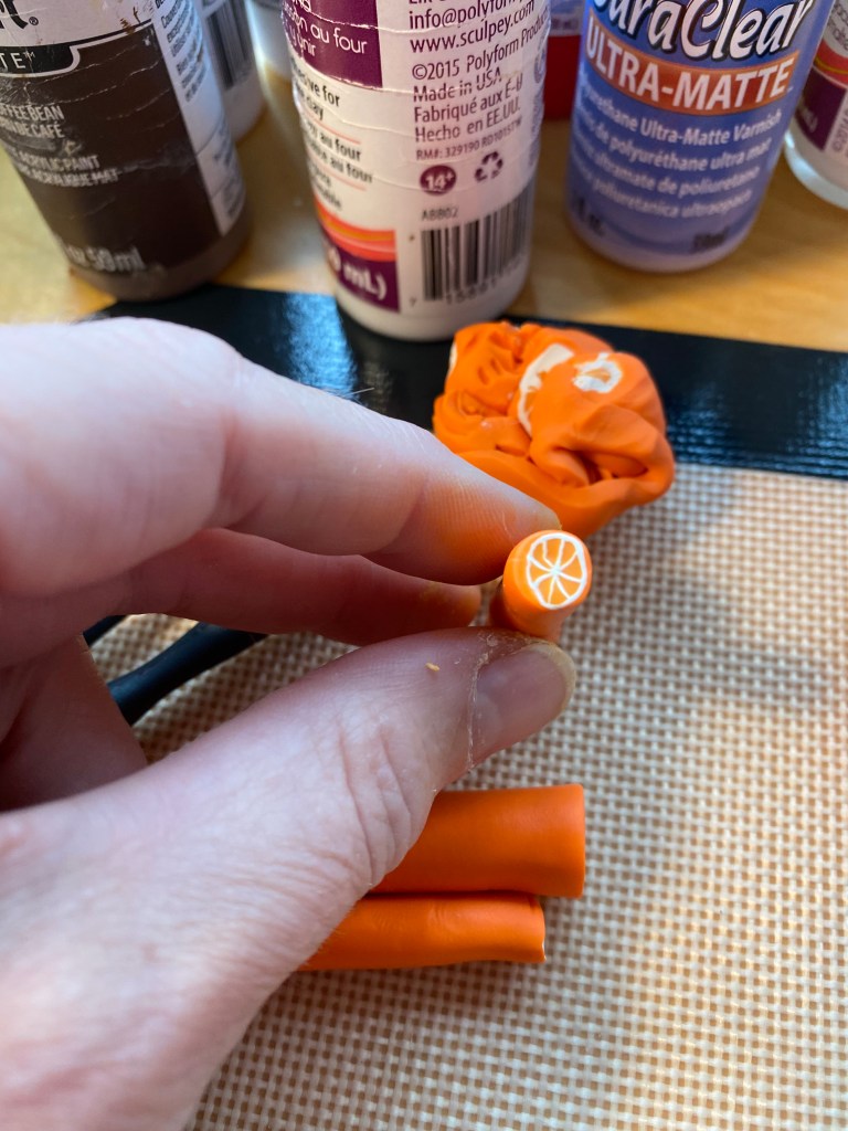 I made them by building a “cane” out of the clay so the inside of each of the oranges is realistic.