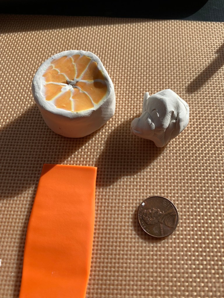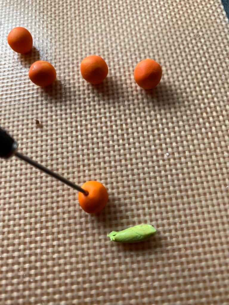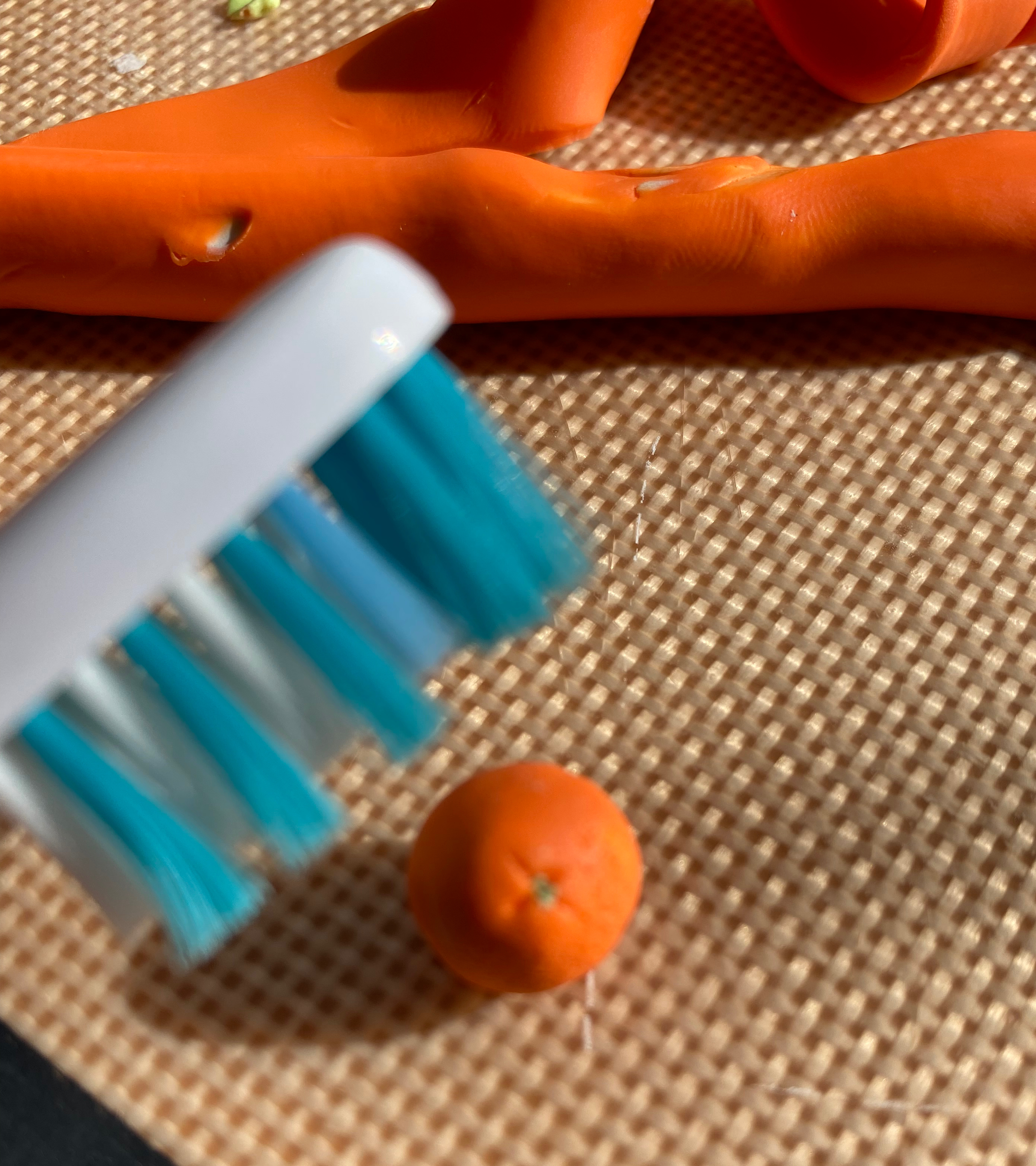 Finally, I added texture to the peels with a toothbrush then baked the oranges in the oven for 15 minutes to harden the clay.