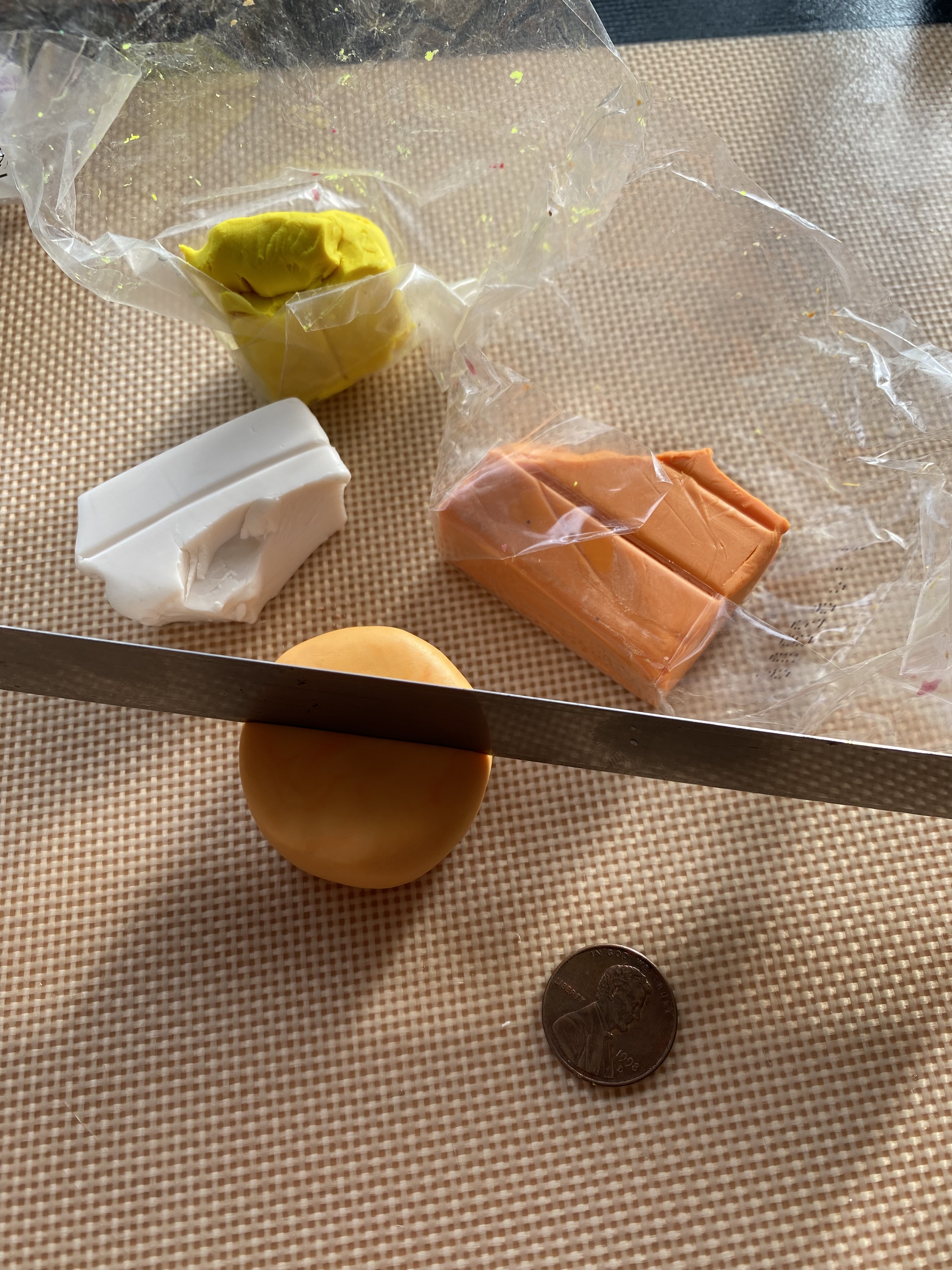To make the orange slices I simply cut very thin slices of the cane. Trial and error taught me to let the cane sit overnight or put it in the refrigerator for awhile so my blade wouldn’t squish and distort the image as I cut it.
