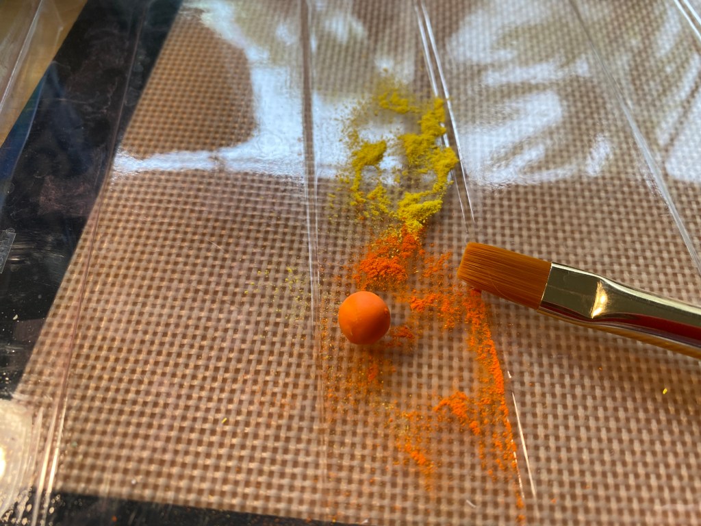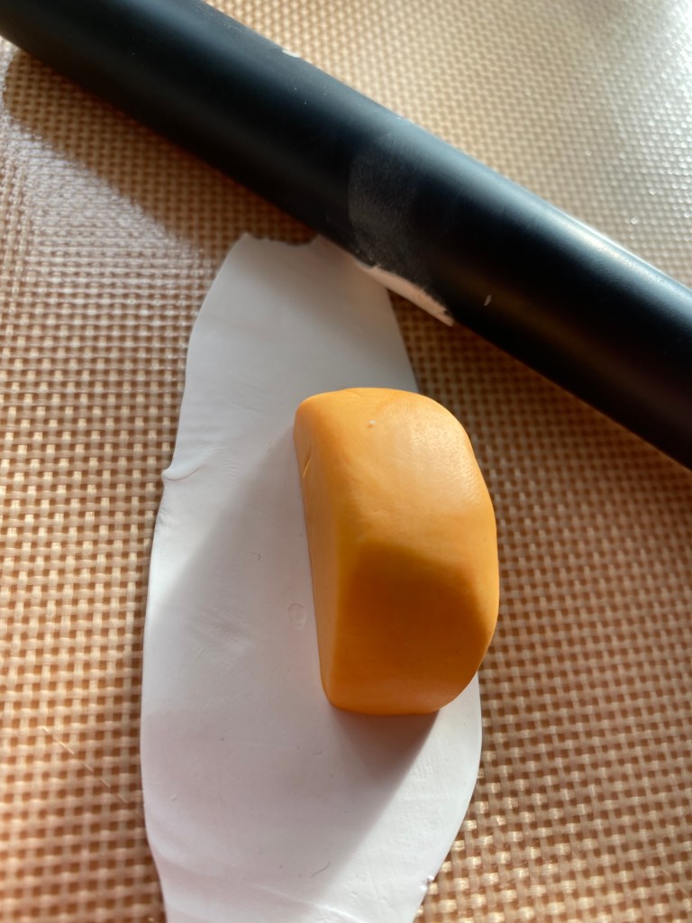 To make whole oranges I cut about a quarter of an inch from the cane and carefully pinched the peel together on both cut ends. After rolling this into a ball, I added some pastel chalk with a brush to add depth of color, then stuck a teeny tiny piece of green on the stem side of the orange.