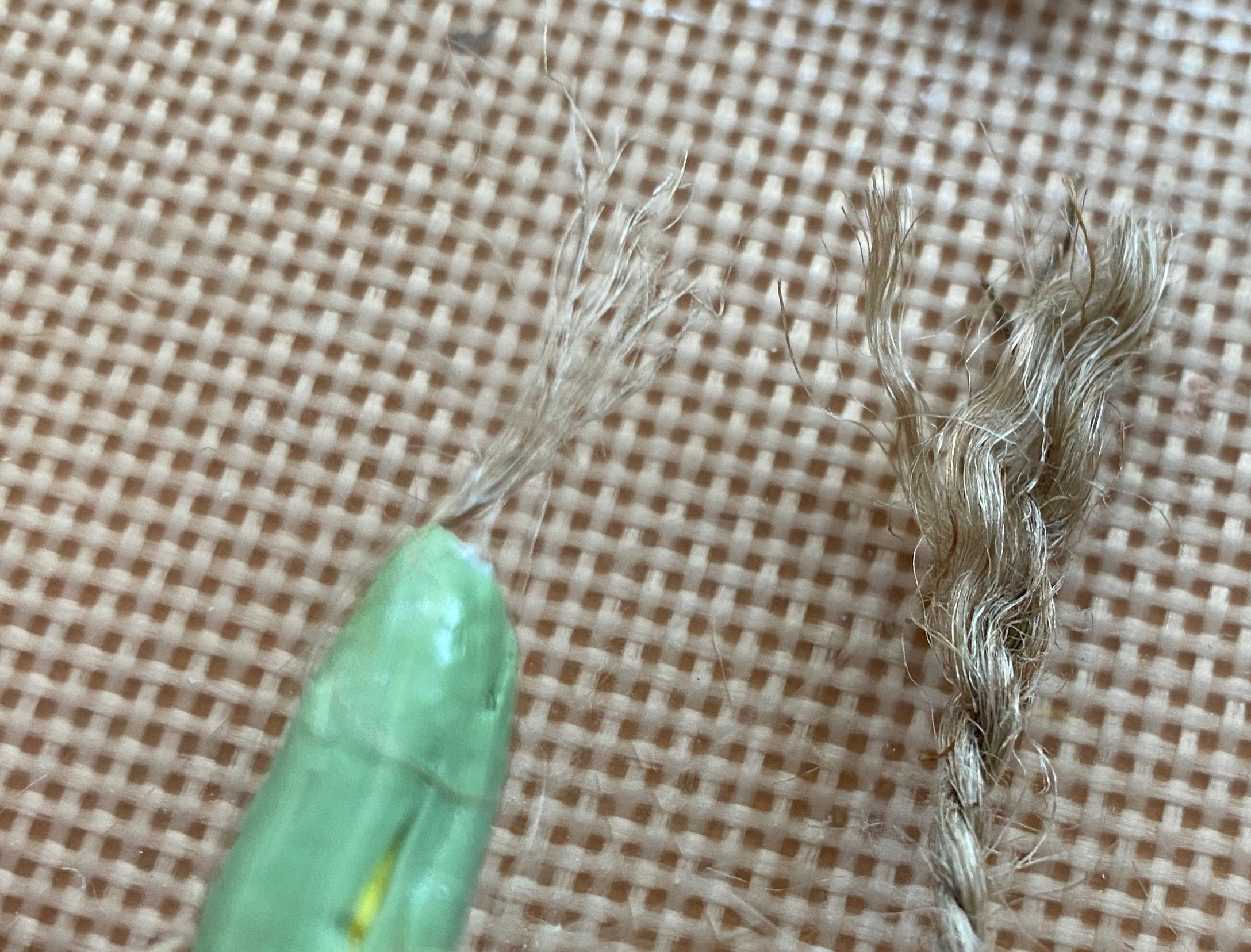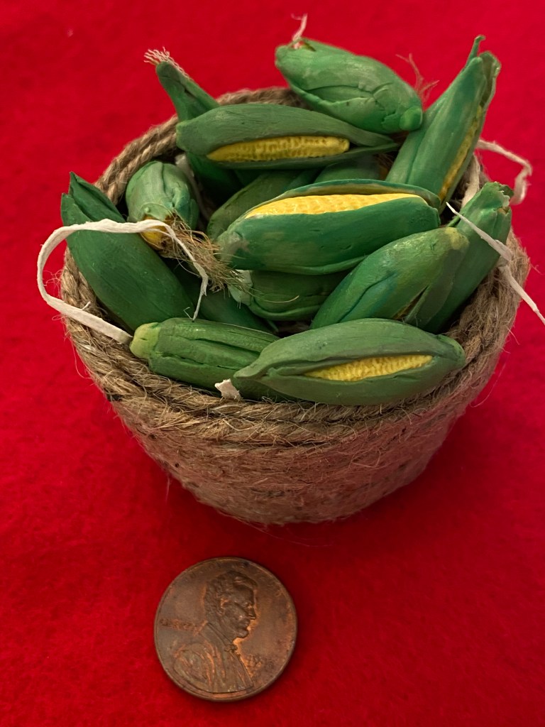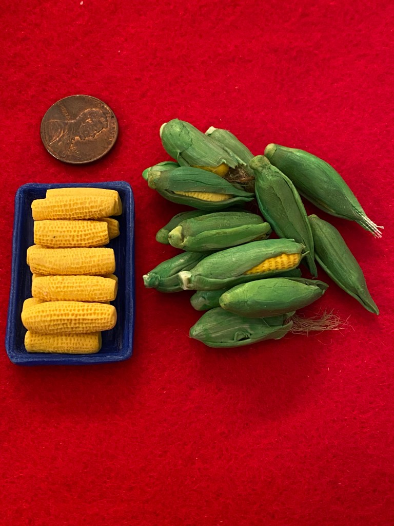 Before baking I added some texture to the husks and a light wash of dark green acrylic paint to add depth. I experimented with a couple of fibers for the corn silk: shredded twine and glossy plastic from a cheap floral pick I bought at Michael’s. The twine looks best but I only added it to a couple of pieces as it’s just too messy looking and that detail won’t show where the corn is going in the Mouse House.
