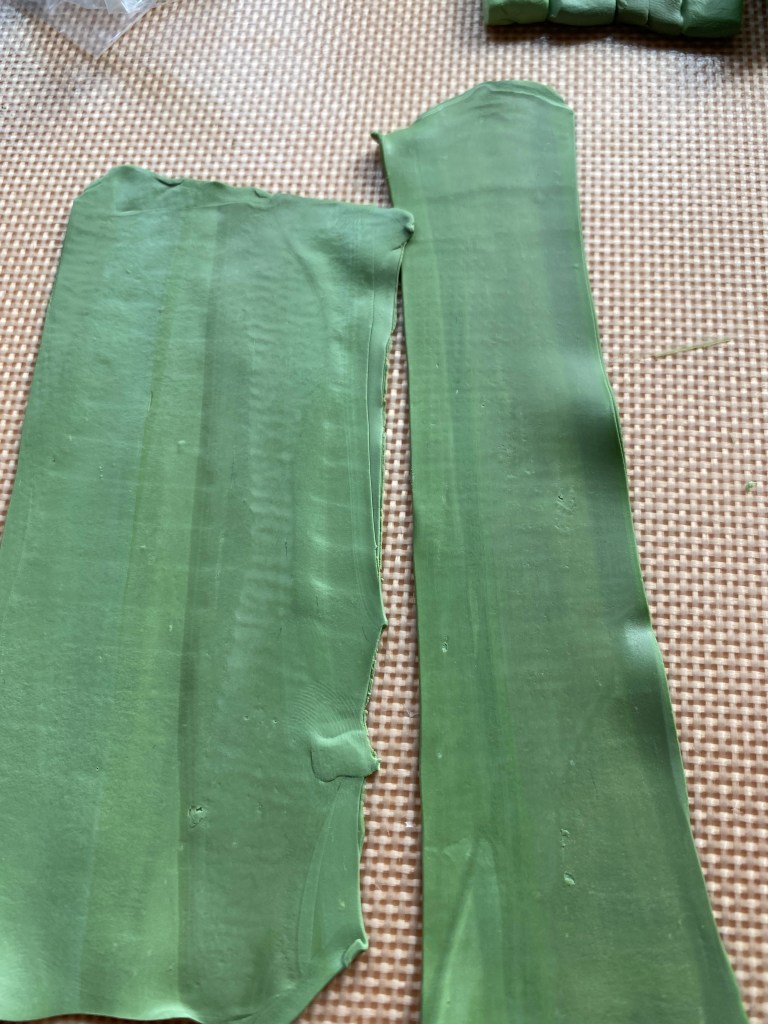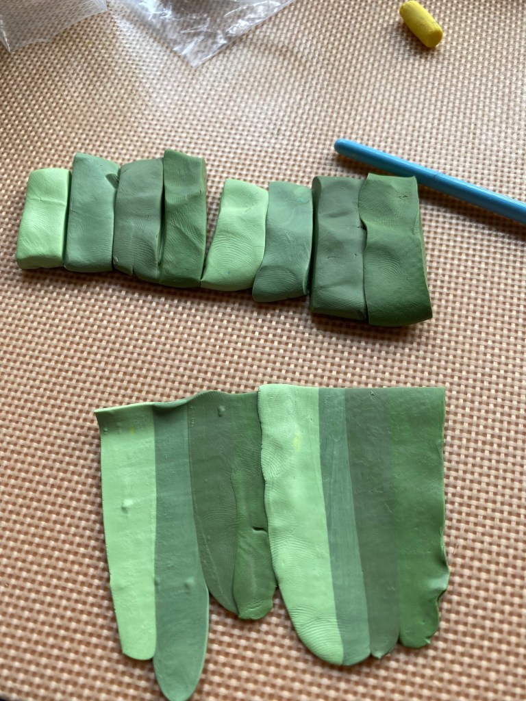 I worked on miniature corn-on-the-cob (in their husks) the last few days. First I chose and mixed a variety of green colored clay and rolled them through my pasta machine several times. This eventually produced a thin piece of clay with subtle striations.