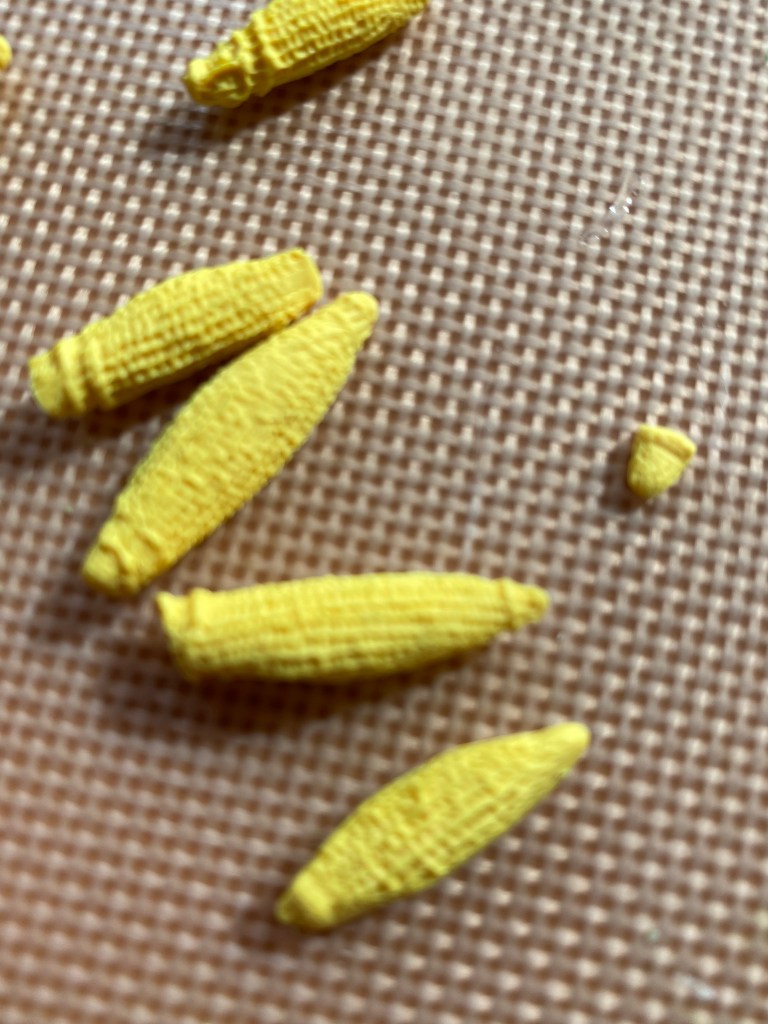 Back to the texture of the corn…from a distance, the pattern from the silicone stamp gives the illusion of full cobs, but up close it looks like the corn has already been eaten! Right now I’m going to keep these as I think they will be in “water” on the Mouse House stove and the texture won’t be very visible.