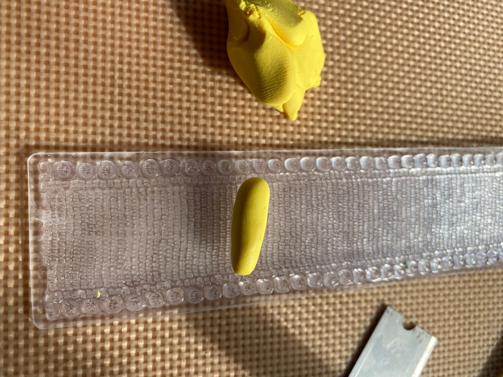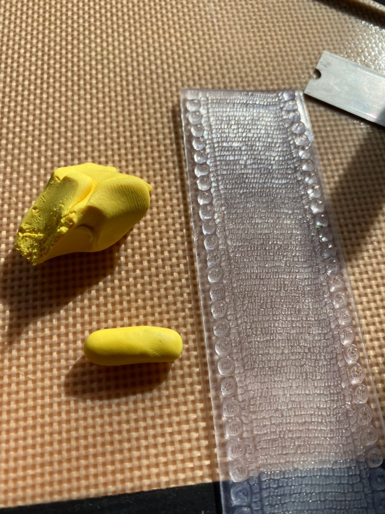 The actual corn was made with bright yellow clay, rolled into a thin log then cut into appropriate lengths. I textured it by rolling each piece on a silicone stamp with a grid pattern. (This worked fine for the pieces inside of the husks, but I don’t like the texture of the stripped corn. More on that later.)