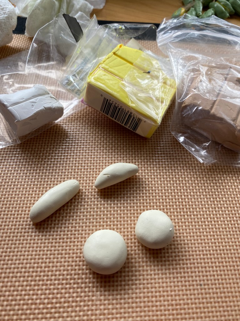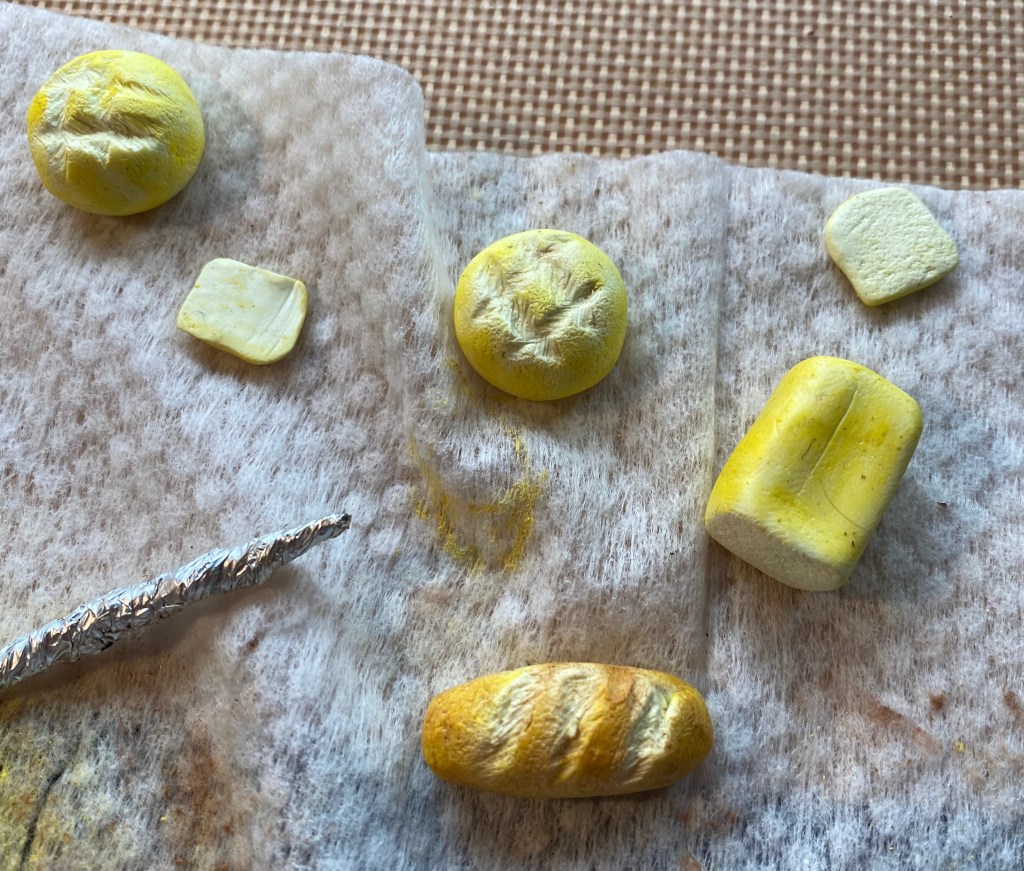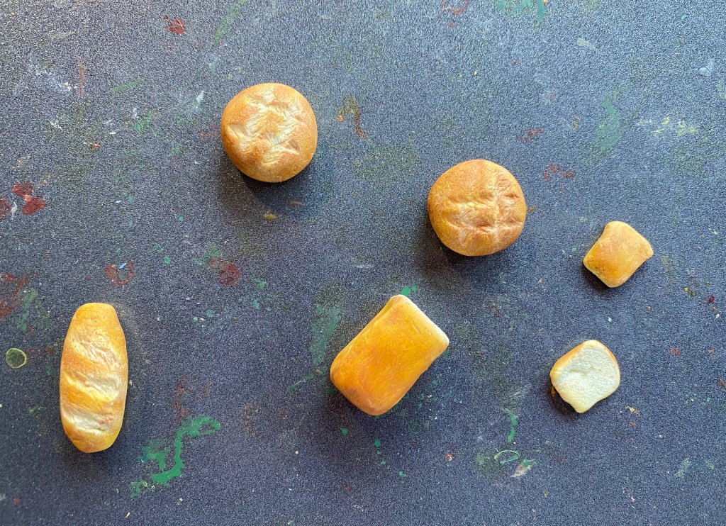 Today was a good day to make bread–miniature size! Of all of the small food I’ve made so far, this was one of the easier tasks. Once I had the right color of clay mixed together for the bread “dough”, I just shaped the loaves and texturized them both inside (when showing) and out with the strange assortment of tools I have here in California.