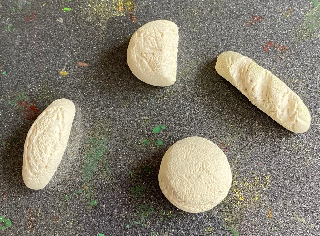 I then used used pastel chalks to color the loaves, layering colors ranging from yellow to dark brown, trying to mimic where bread would darken in the oven. Liquid polymer with small lumps of red clay made realistic jelly.