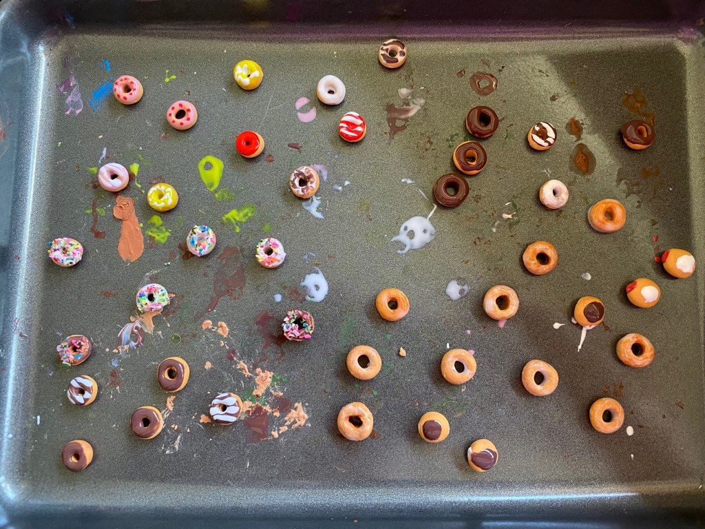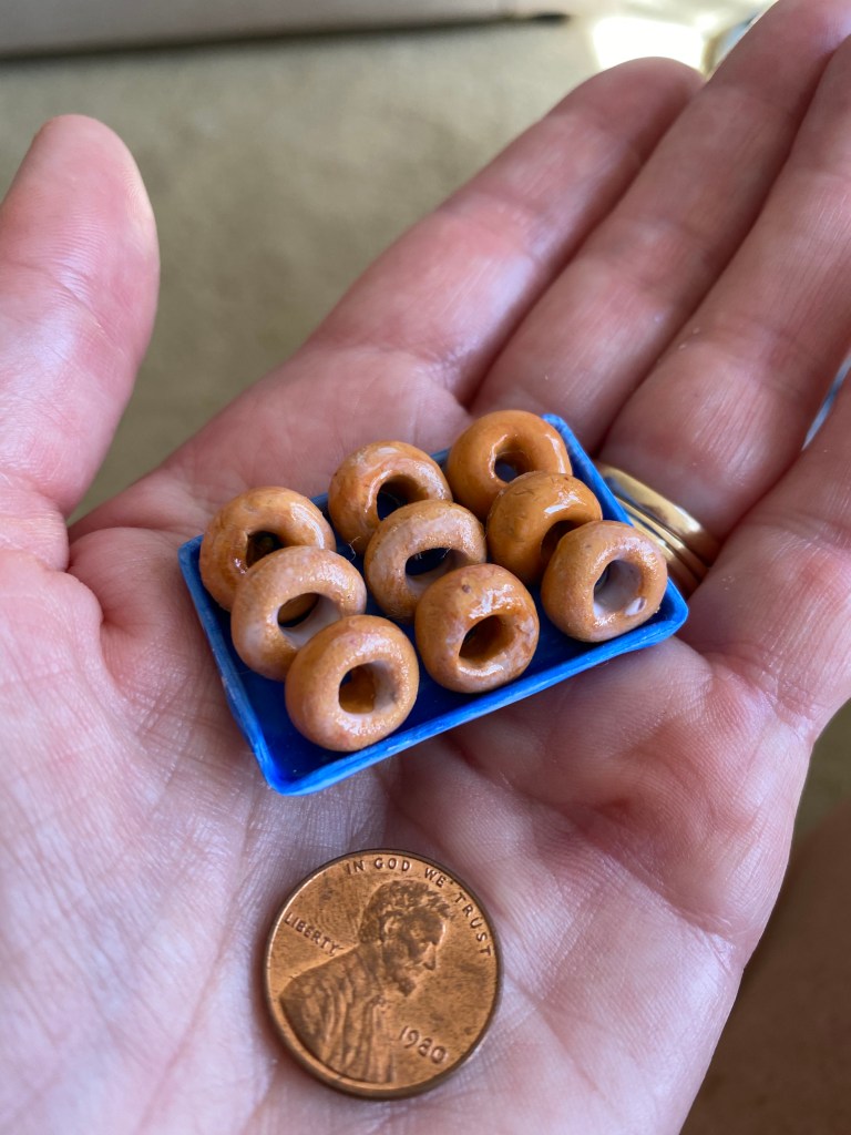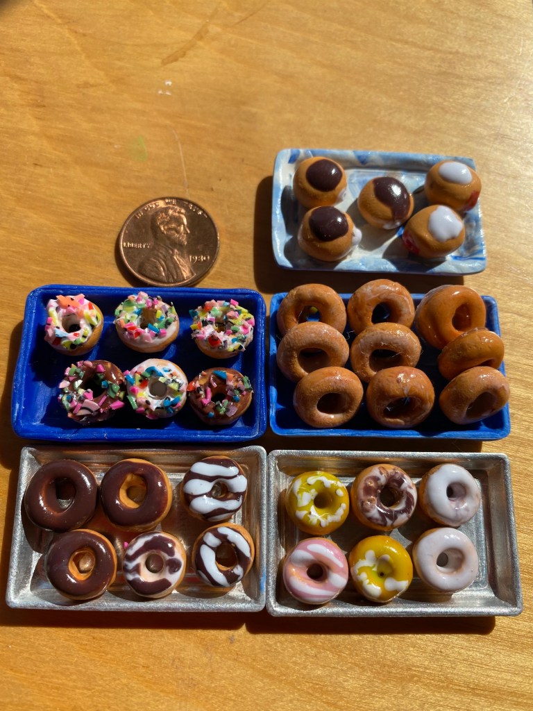 Making these doughnuts was so much fun–and quite easy. I simple poked holes in small balls of clay and rounded all of the edges. I texturized them with a toothbrush, baked them, then decorated them with various chalks and liquid polymer colors.