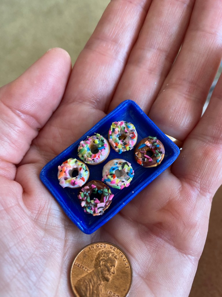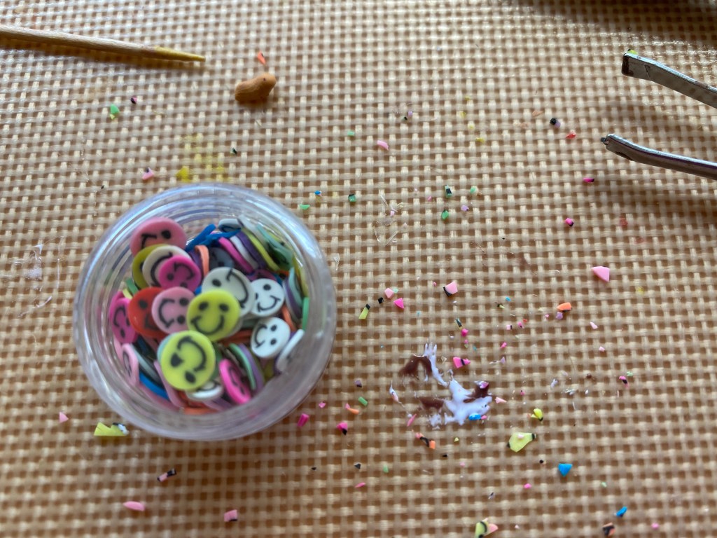 I used a razor blade to chop small resin decorations I bought at Michael’s into tiny pieces and used them for sprinkles.