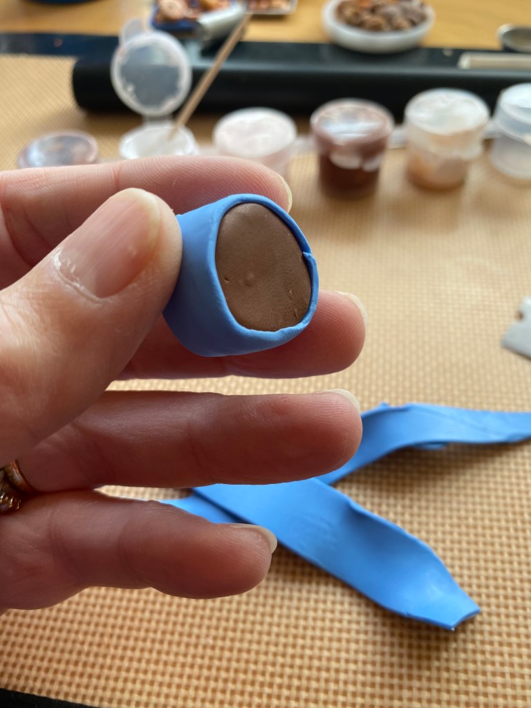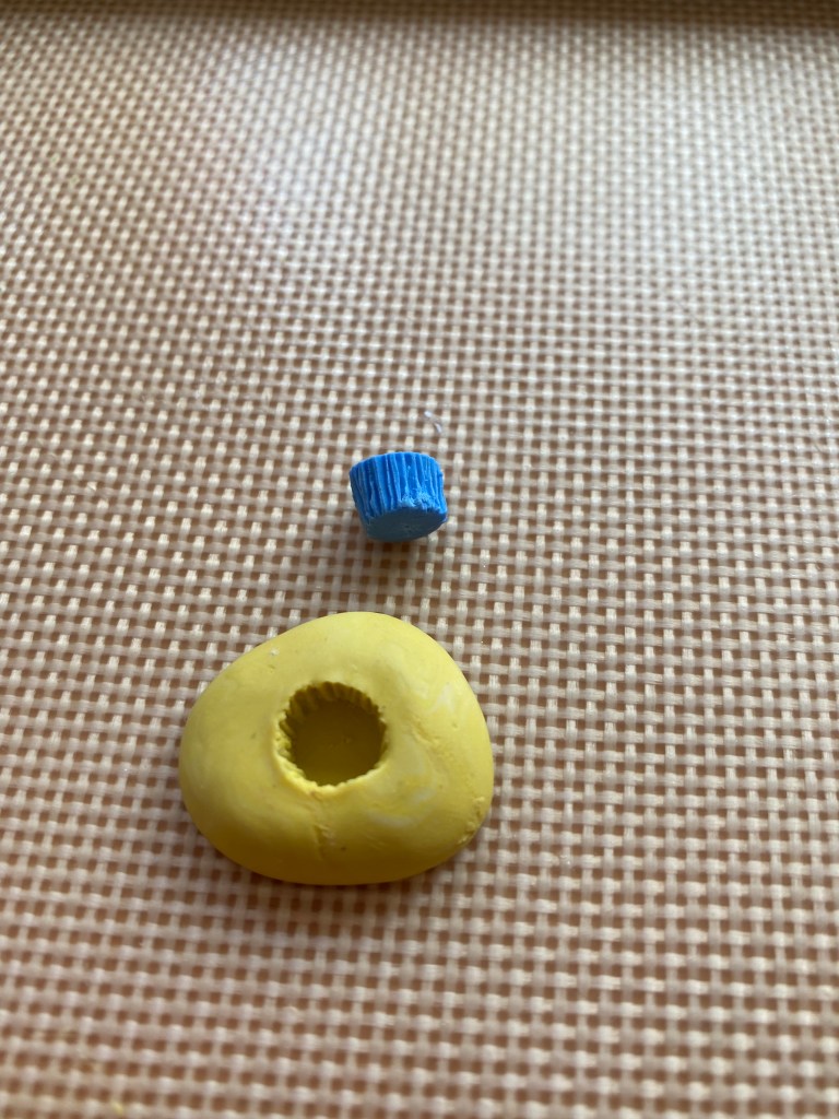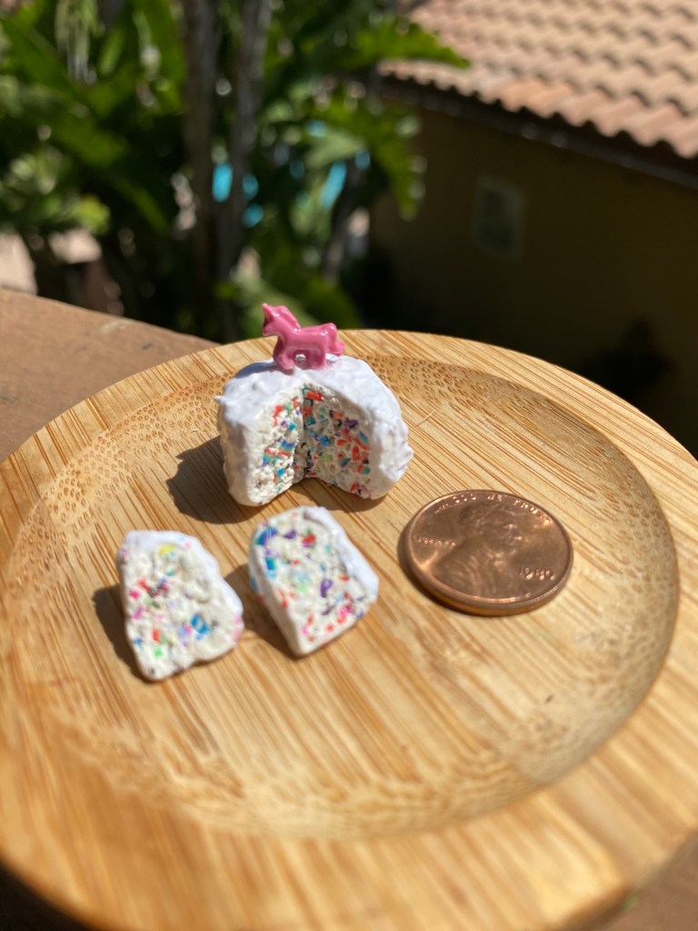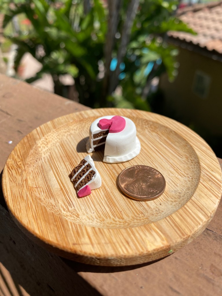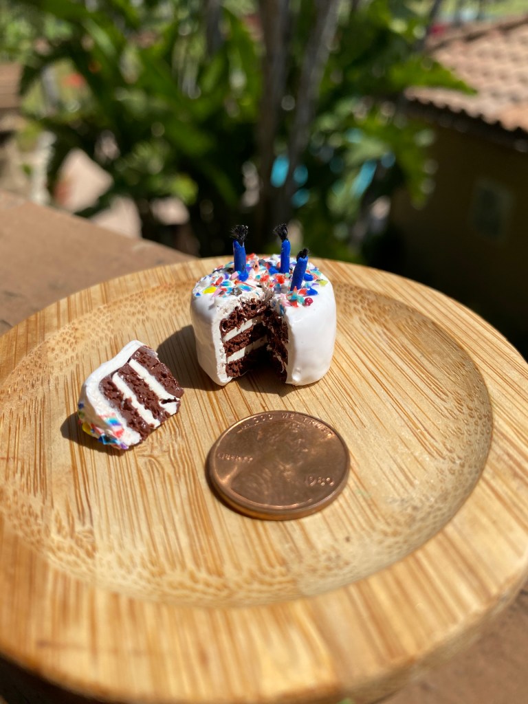 The cupcakes were made with a mold I mixed out of an epoxy. First I made a clay cupcake “prototype” and baked it. I then mixed the epoxy and quickly stuck the baked cupcake in the mold and allowed it to set. Once the baked prototype was removed, I used the mold to make identically sized cupcakes out of both chocolate and yellow clay. I painted the “liners” on each piece and then added the frosting to each cake.