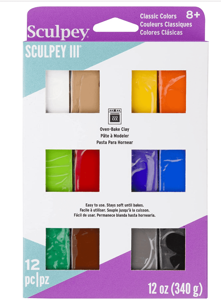 I use Sculpey III polymer clay. I like it as it’s pretty easy to work with out of the package without having to knead and condition it. With that said, sometimes I think it’s too soft and I have to let pieces sit for awhile before I cut or texturize them as otherwise my tools squish them out of shape. I started with the sampler above and have just mixed the colors as I go. The sampler is around $16 on Amazon.