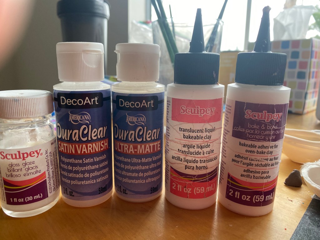 These glazes and the bakeable adhesive are essential. They are used to seal the clay, add translucency to clay, and to glue baked pieces of clay together.