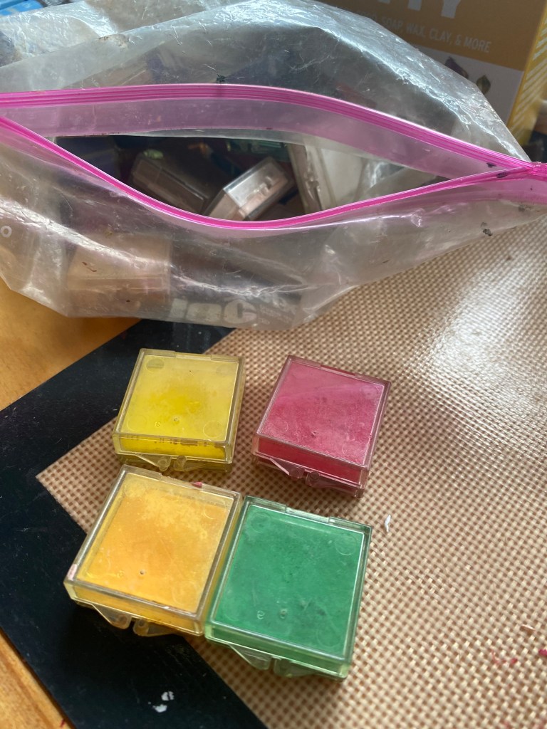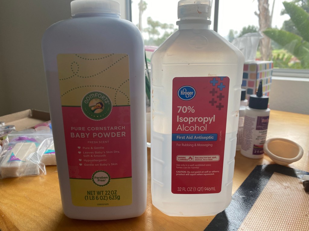 Finally, these two items are quite important. I use the alcohol CONSTANTLY as it’s the best way to clean up clay from surfaces, tools and hands. I used alcohol wipes for awhile but they are hard to find and too expensive. I now make my own with paper towels and alcohol. Trust me –DON’T START USING POLYMER CLAY WITHOUT THIS ALCOHOL ON HAND!