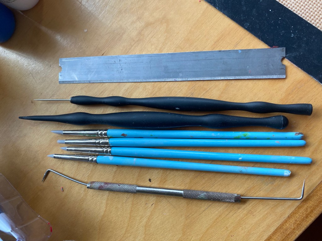 These are my tools. The razor blade is used constantly; the others as needed. These types of tools are readily available on Amazon and in craft stores.