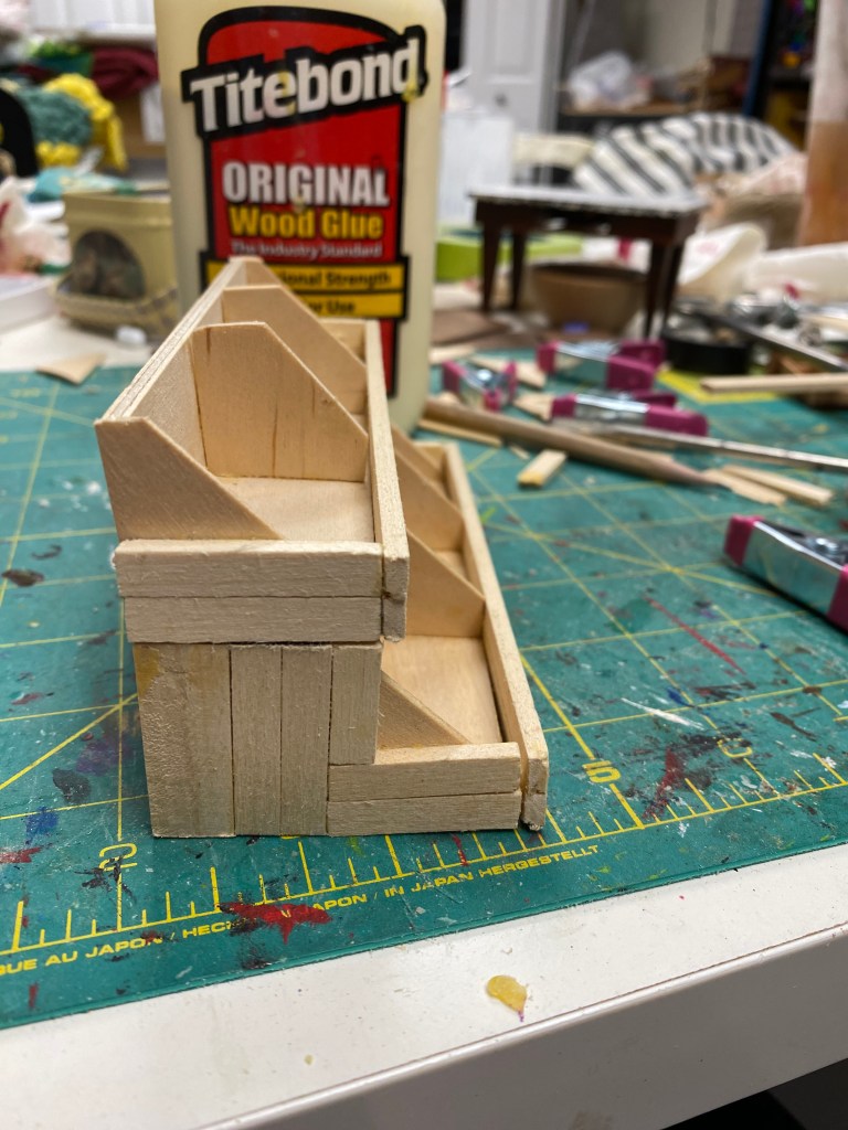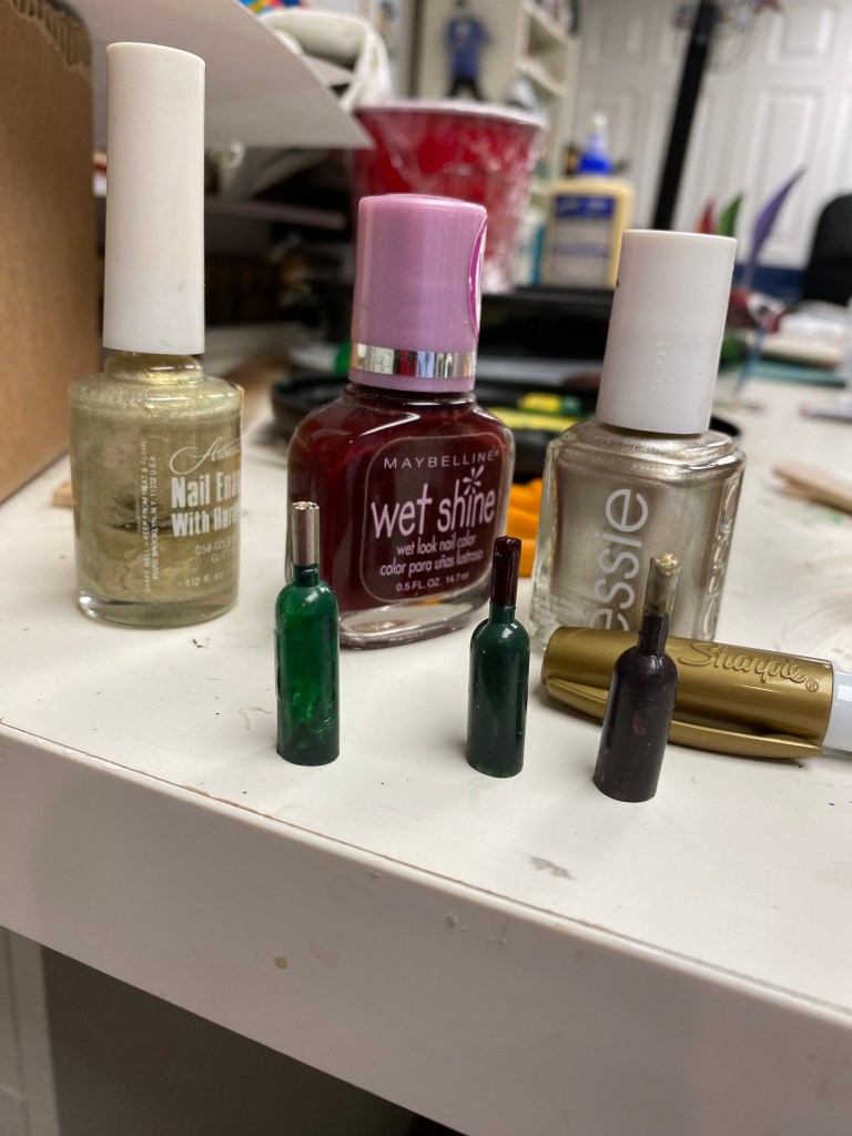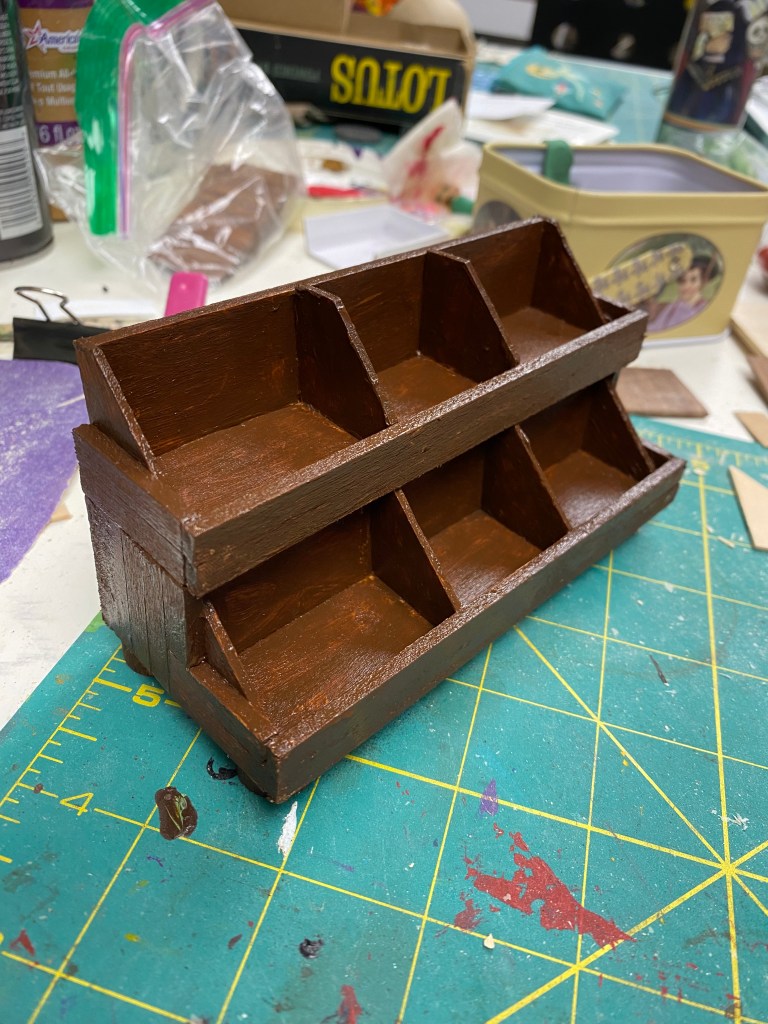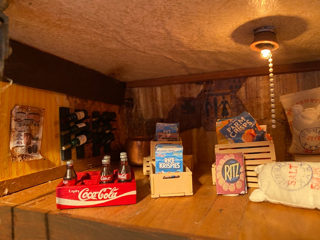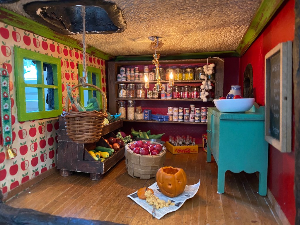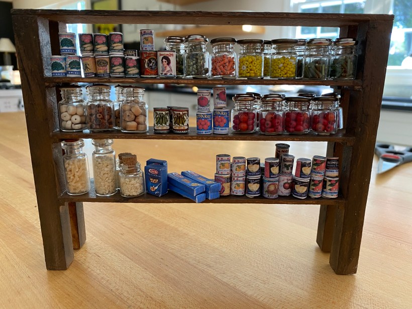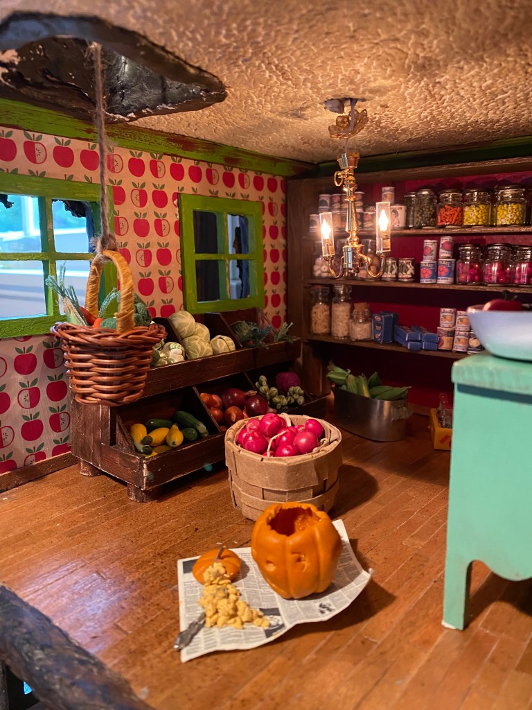 The food storage area in the Mouse House was a priority from the beginning of this project. I knew I wanted to highlight miniature fruits and vegetables and make “canned” and boxed items to showcase on shelves.
